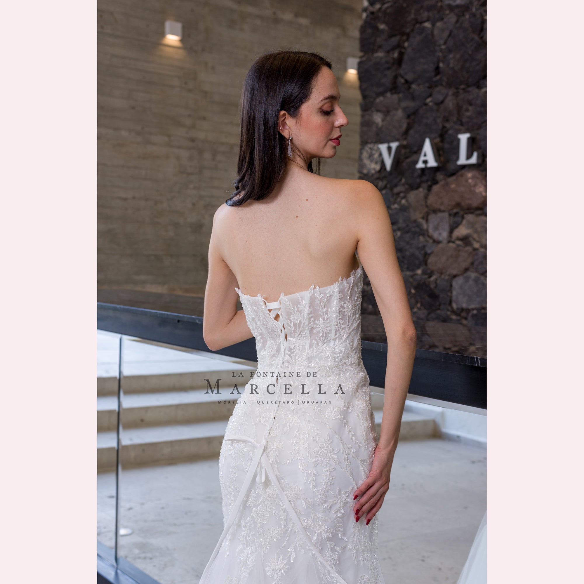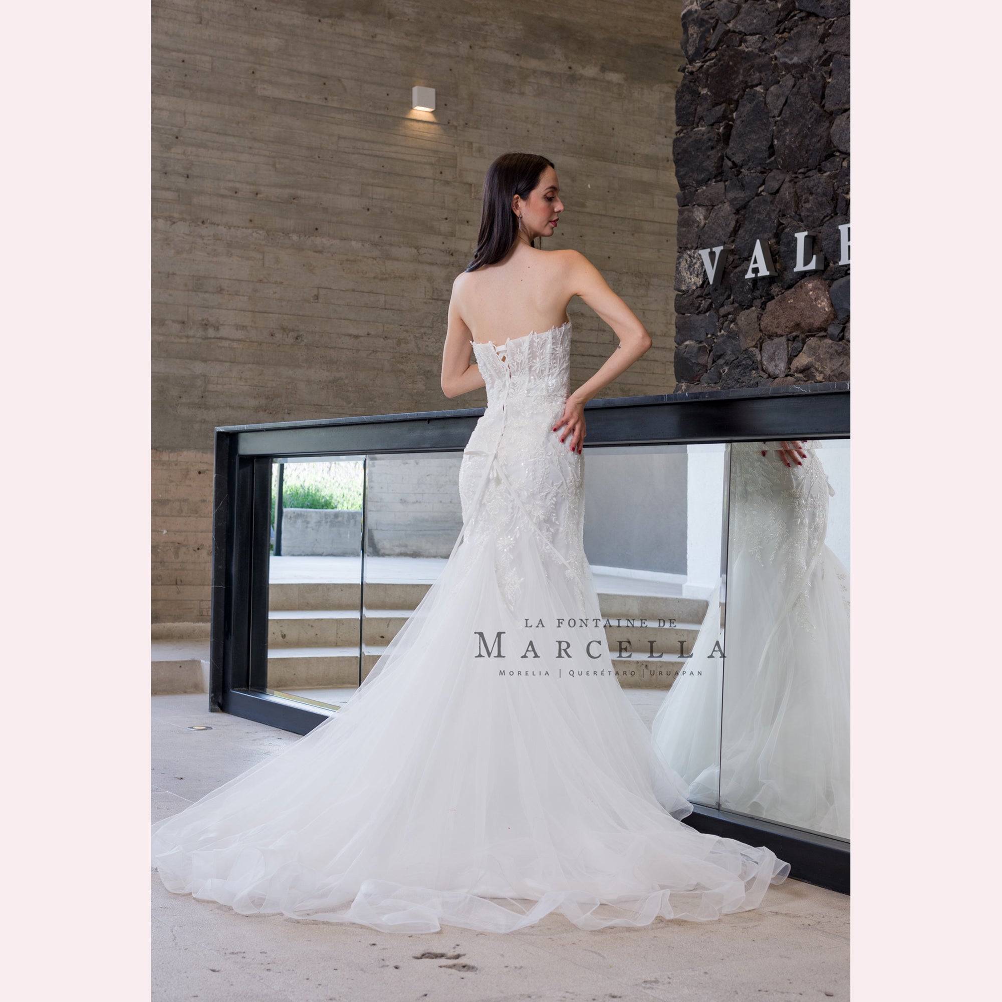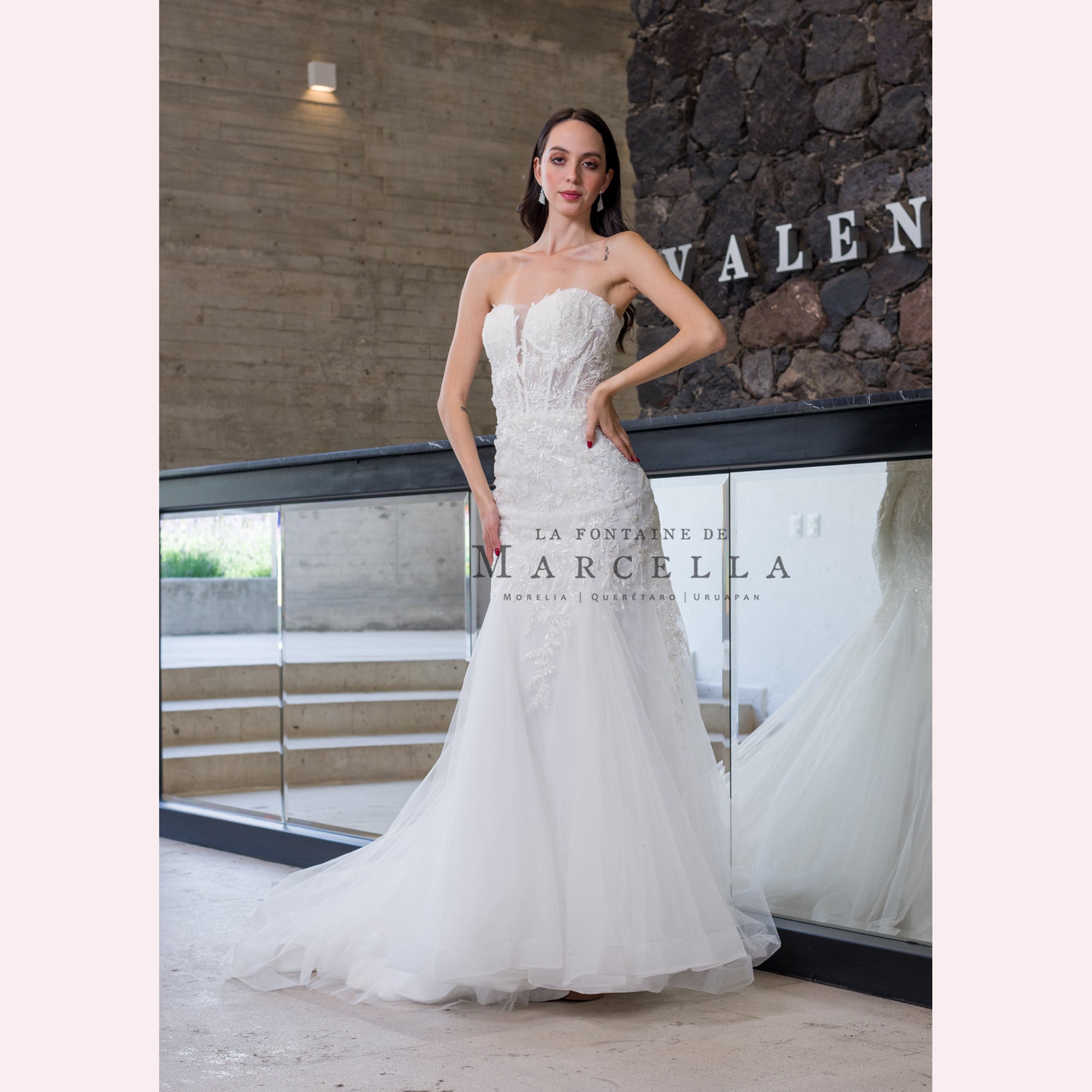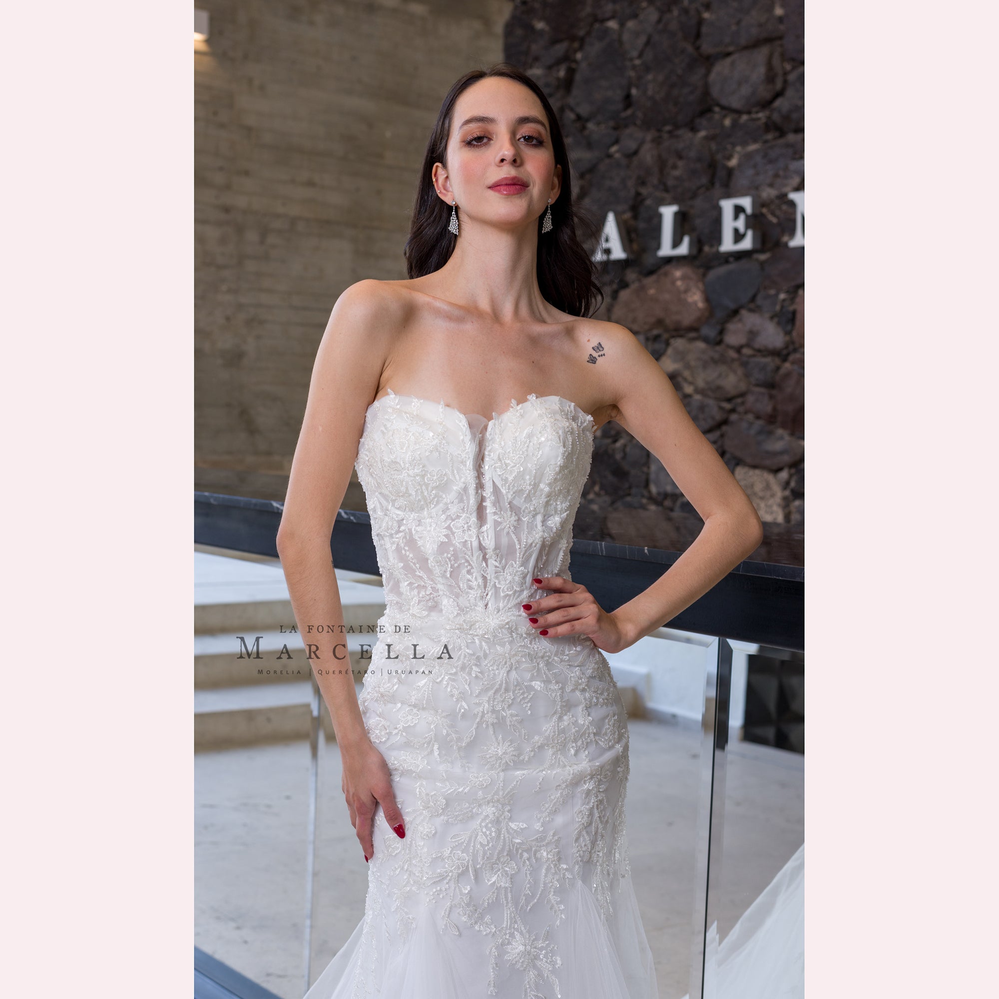Vestido de novia en corte sirena con escote corazón, corse y aplicación, es recomendado para cuerpos tipo Reloj de Arena y Triangulo Invertido.Leer más
