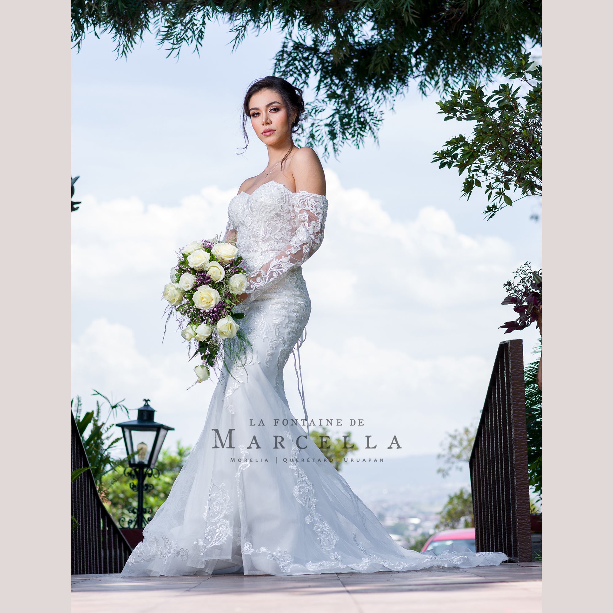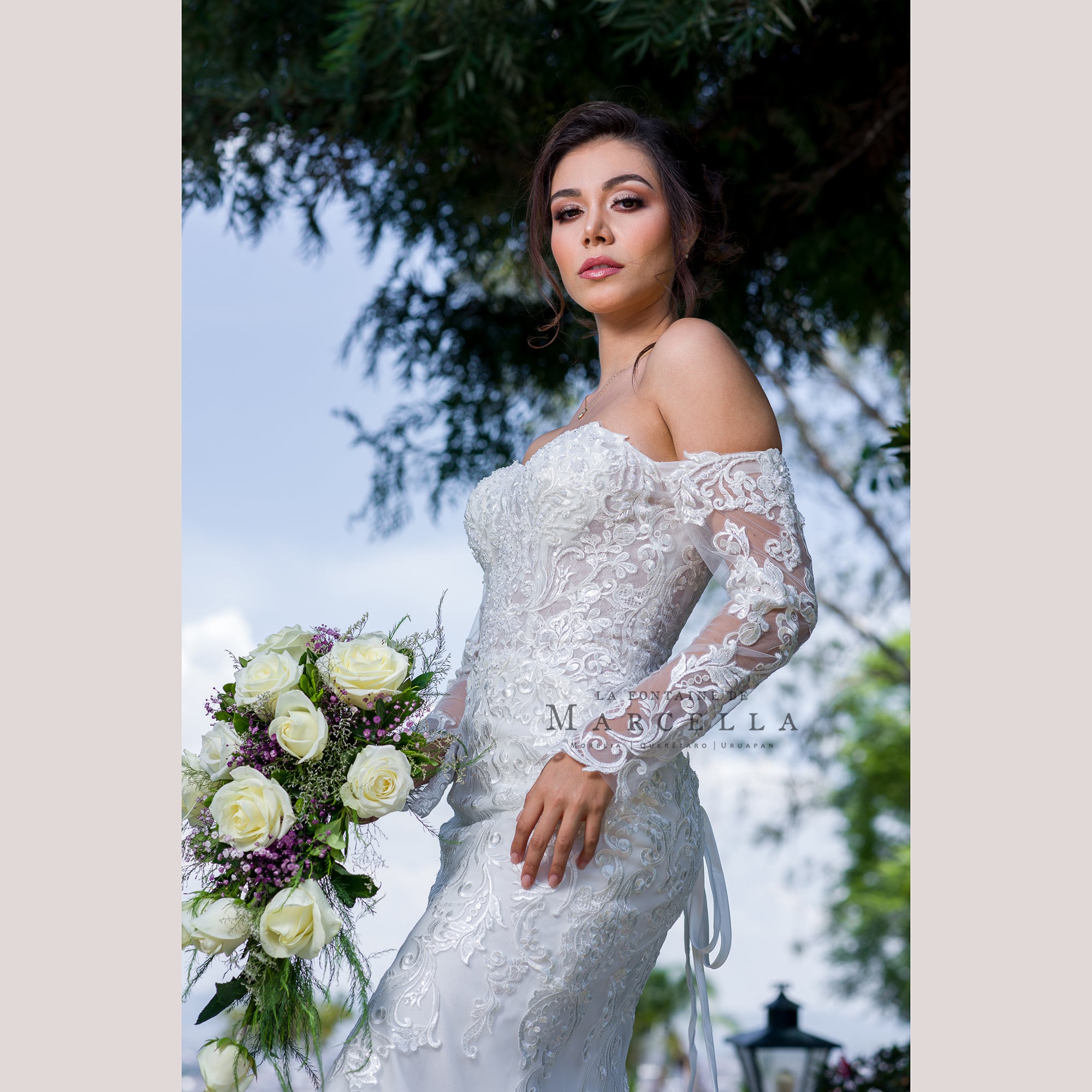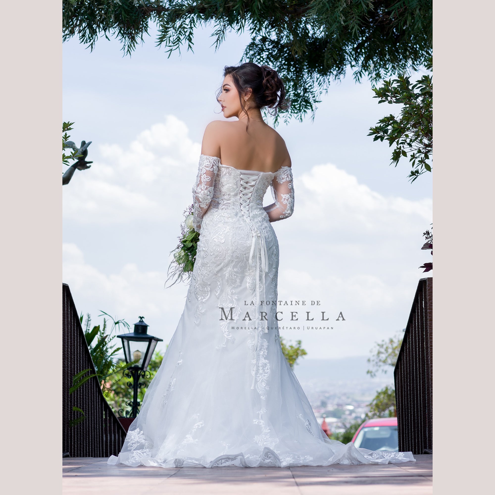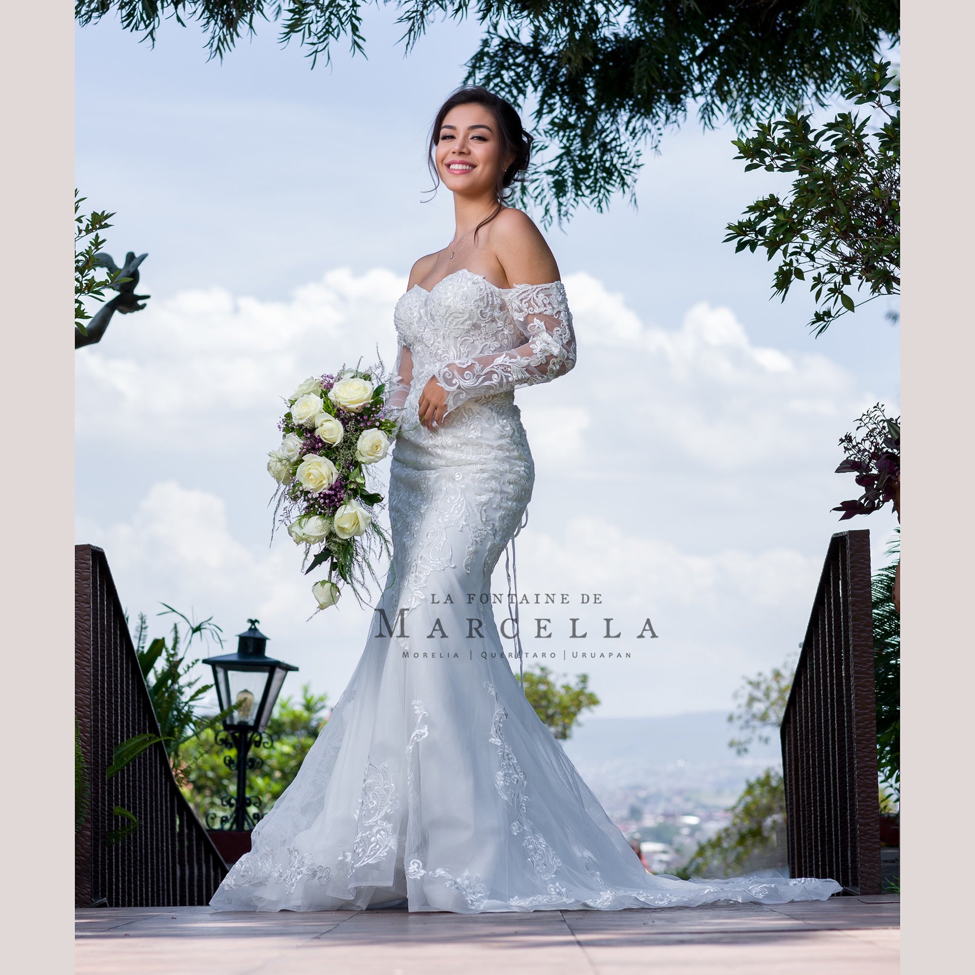 Vestido corte sirena con manga a medio brazo, cubierto en aplicación y con corsé es recomendado para cuerpos tipo Reloj de Arena y Pera.Leer más