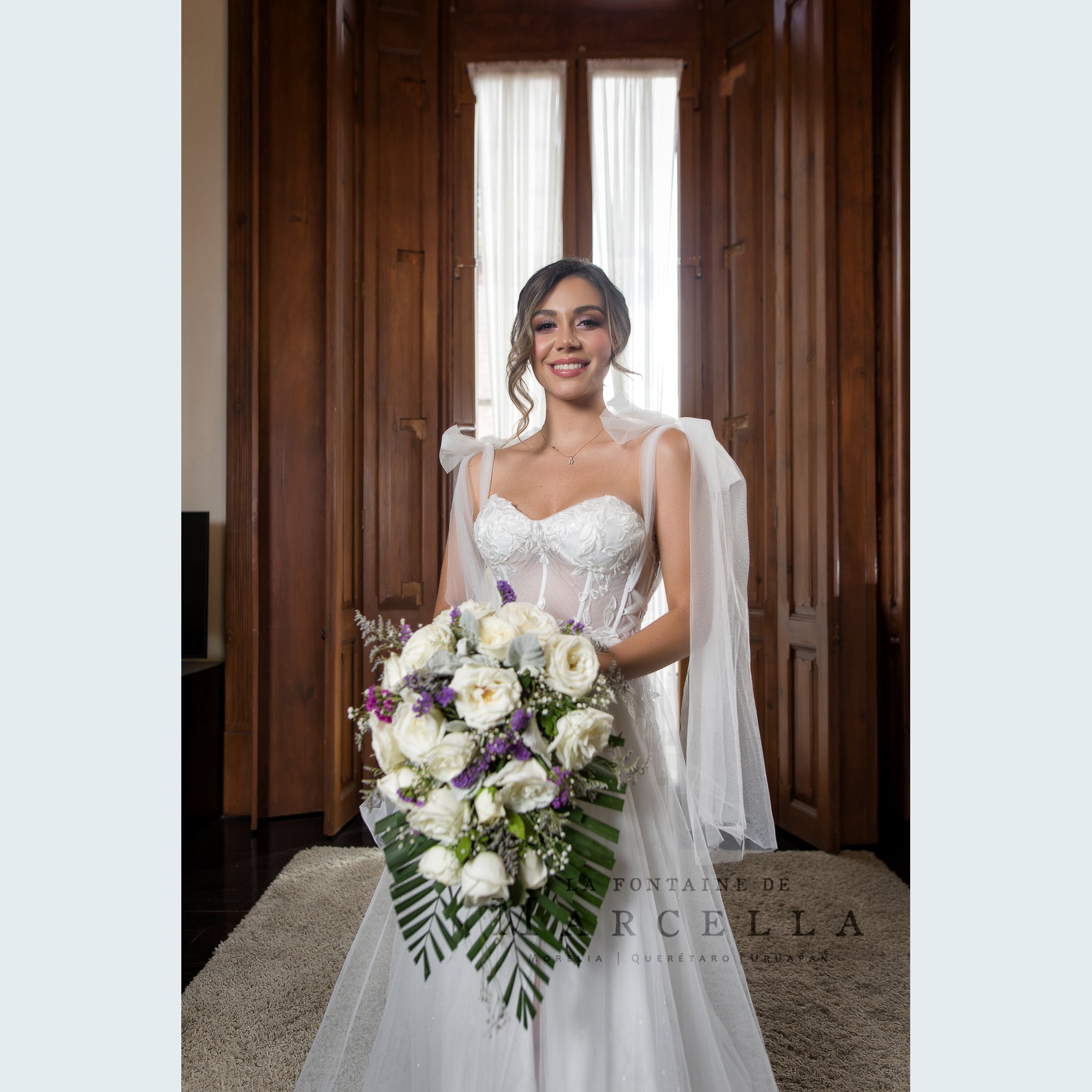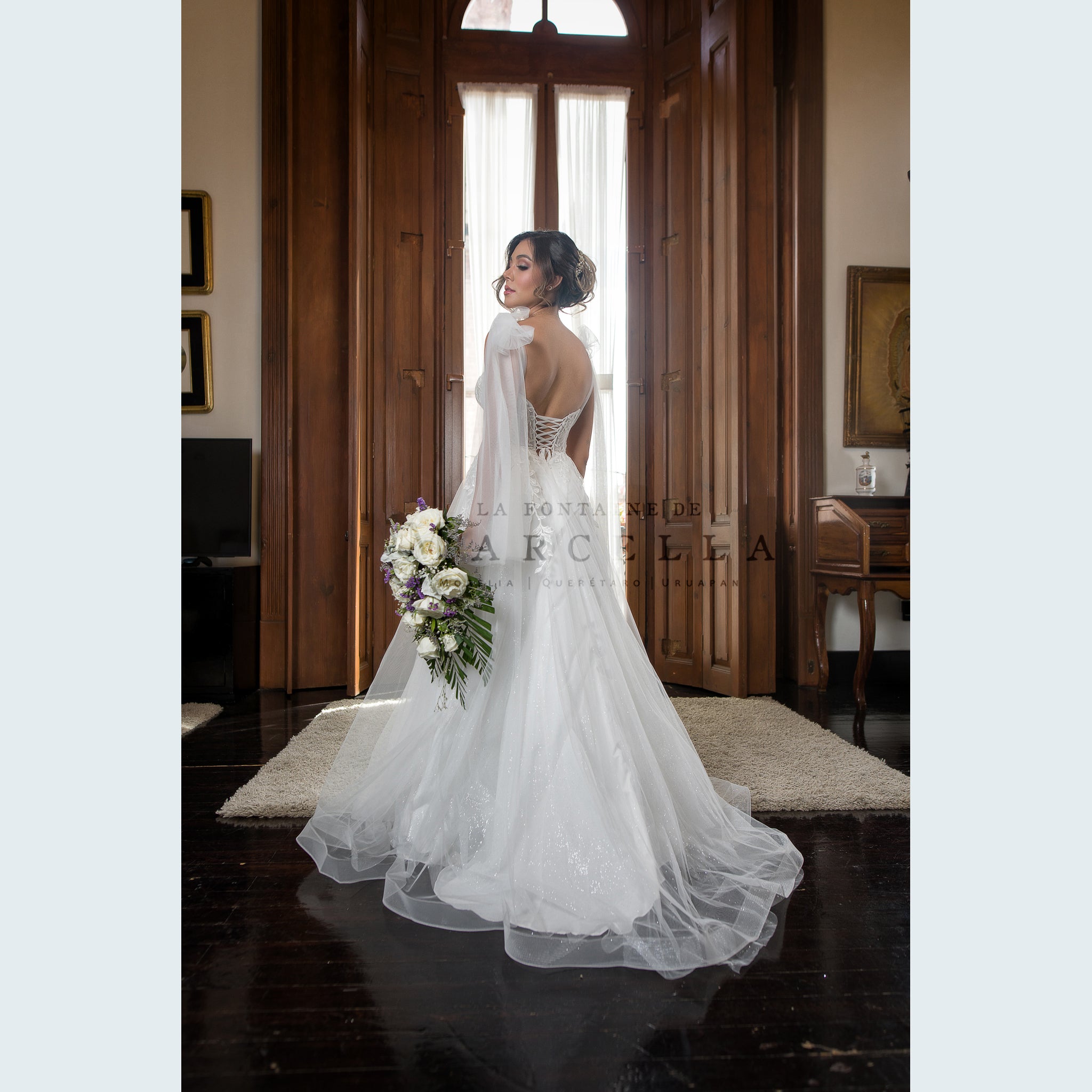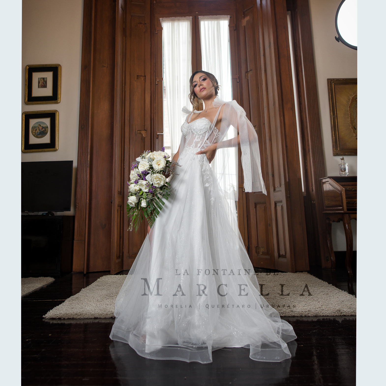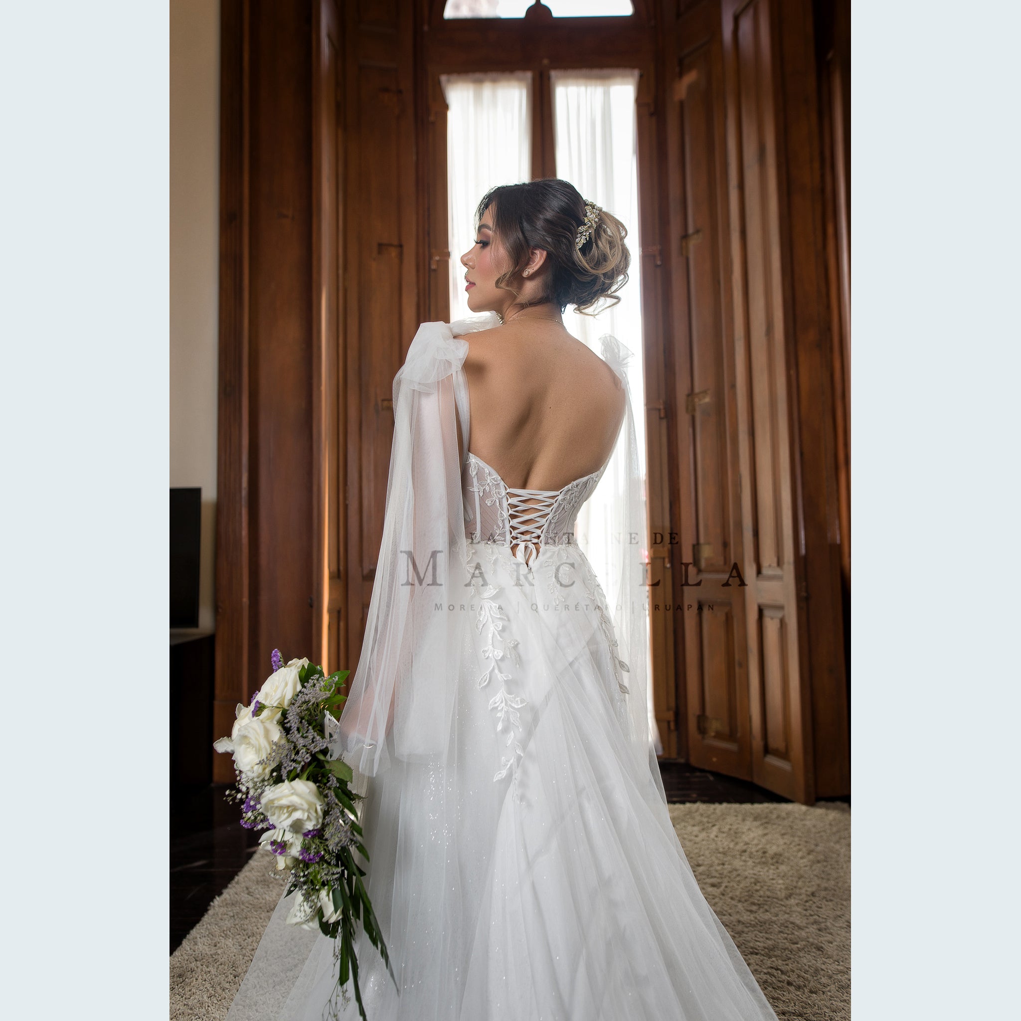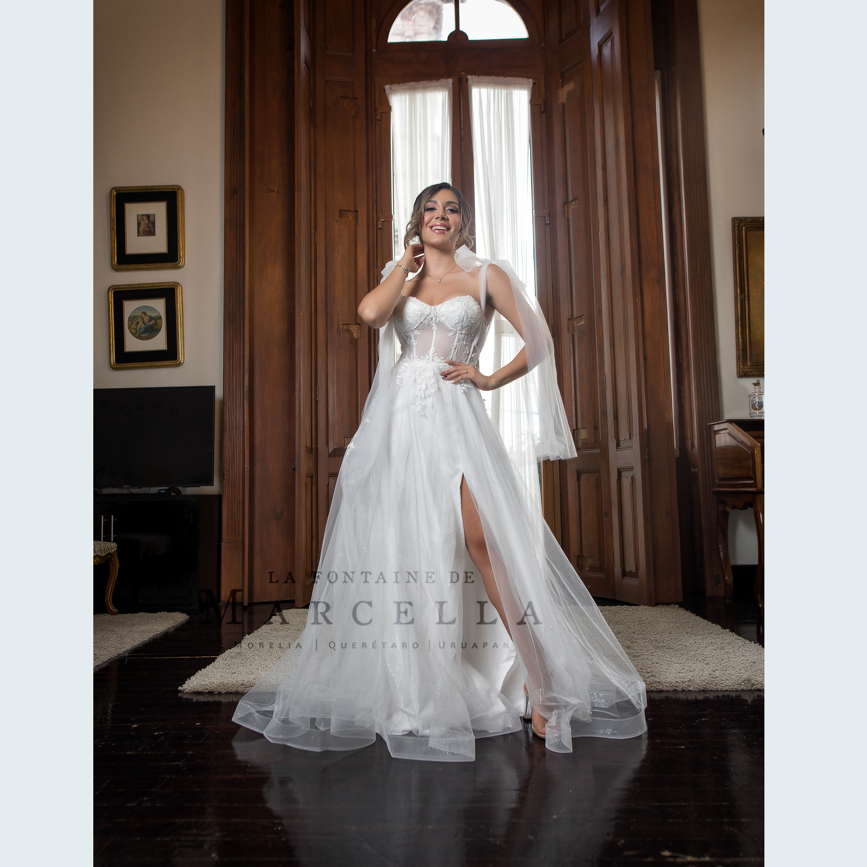 Vestido de novia de corte princesa adornado con liston y efecto de corse a los constados y a la espalda, recomendado para cuerpos tipo Rectangulo y Triangulo Invertido.Leer más
