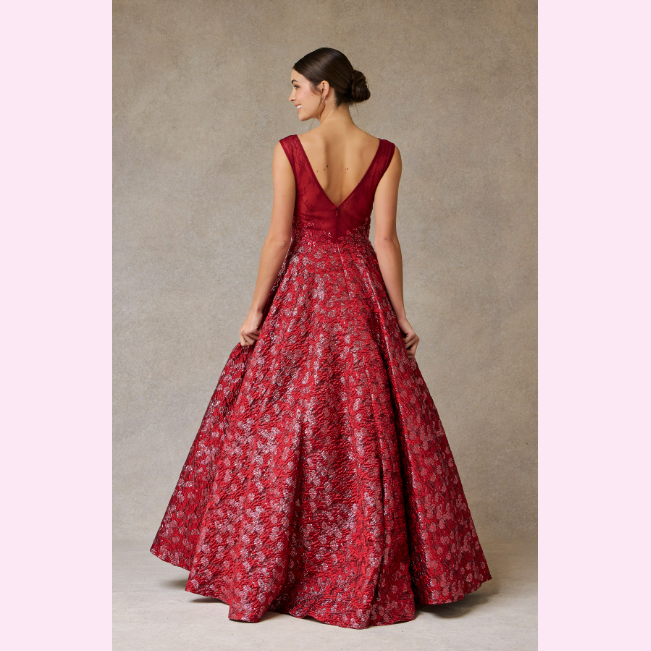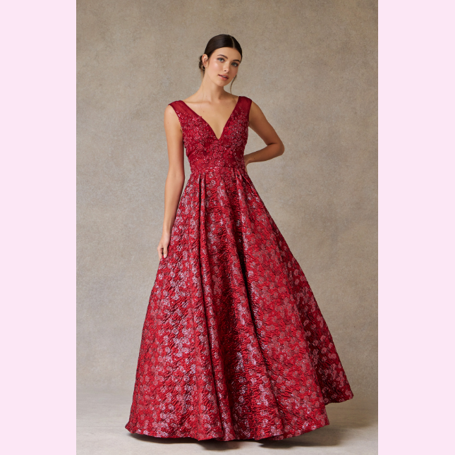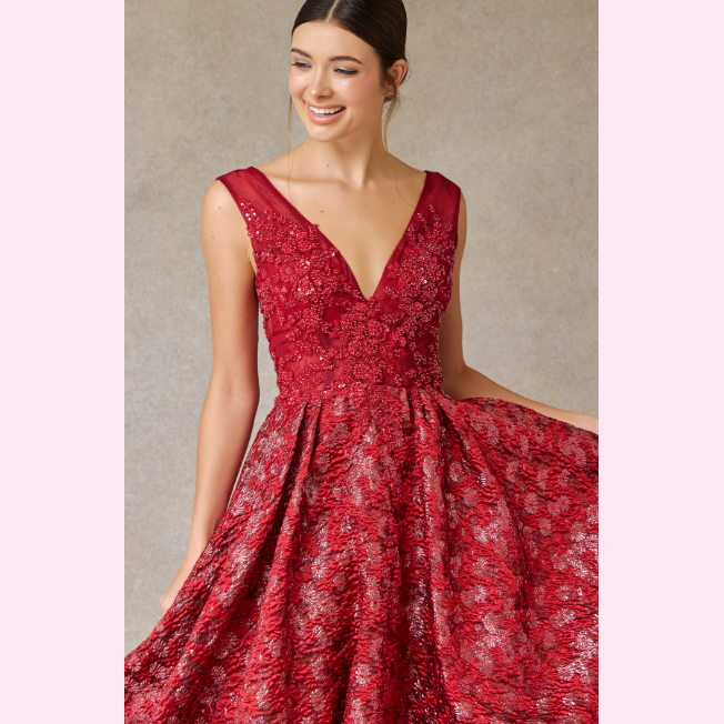 Vestido corte en A con tirantes gruesos y escote en V, tela con textura floral, es recomendado para cuerpos tipo Rectángulo y Triangulo Invertido.