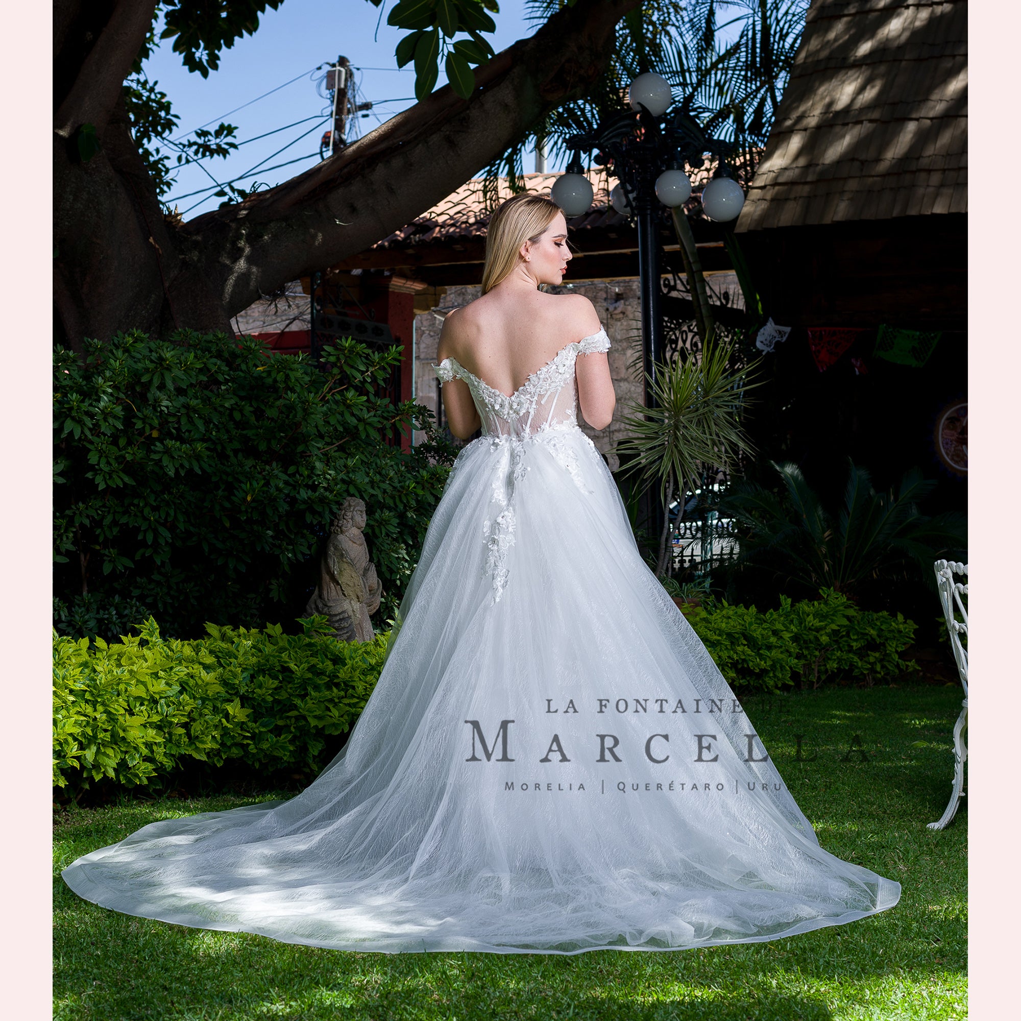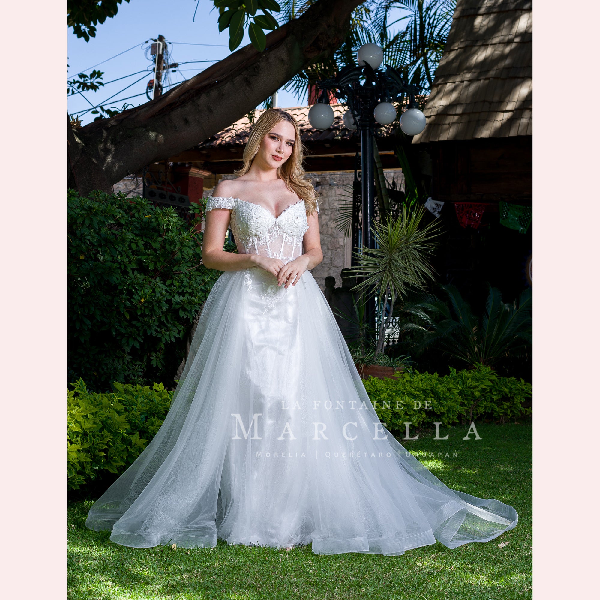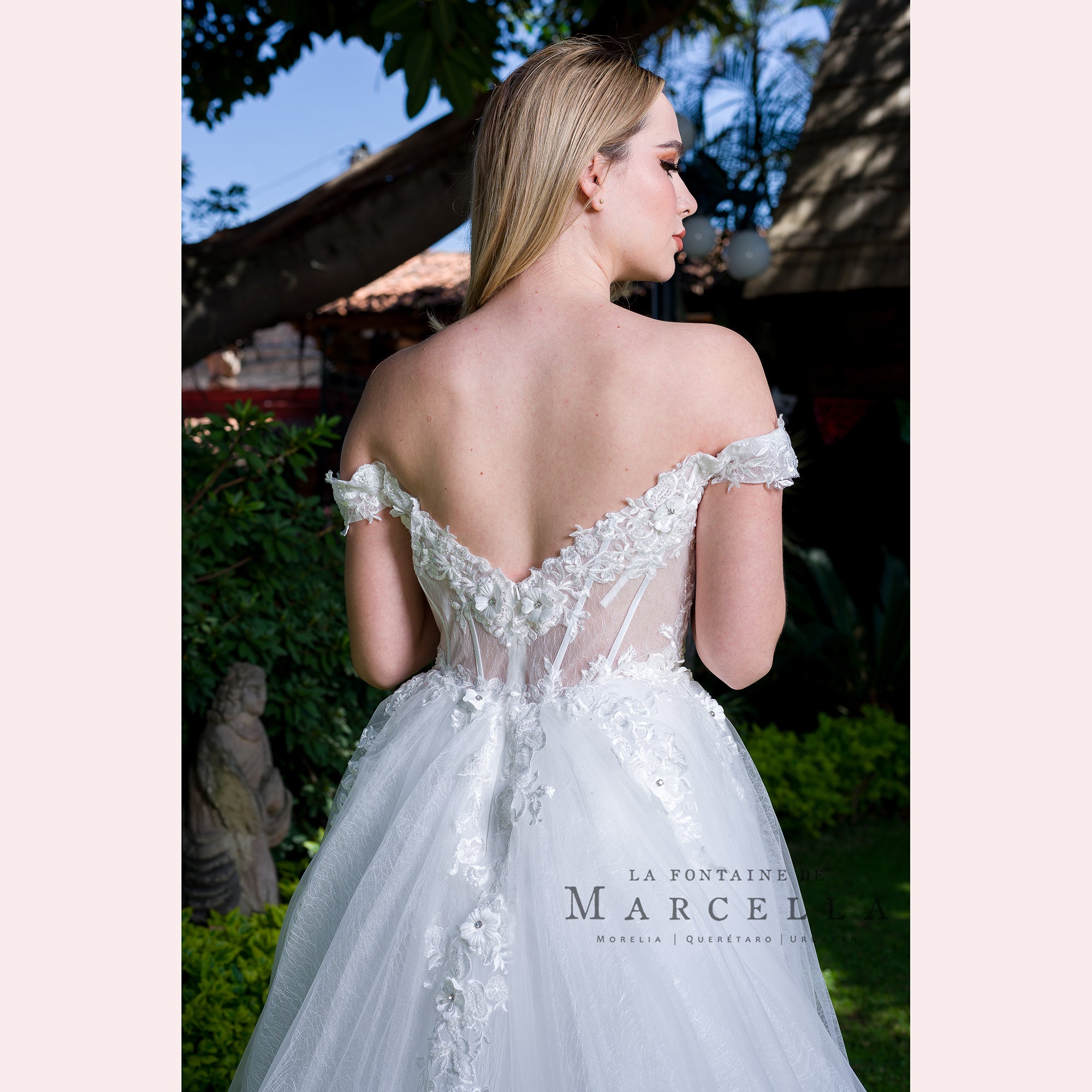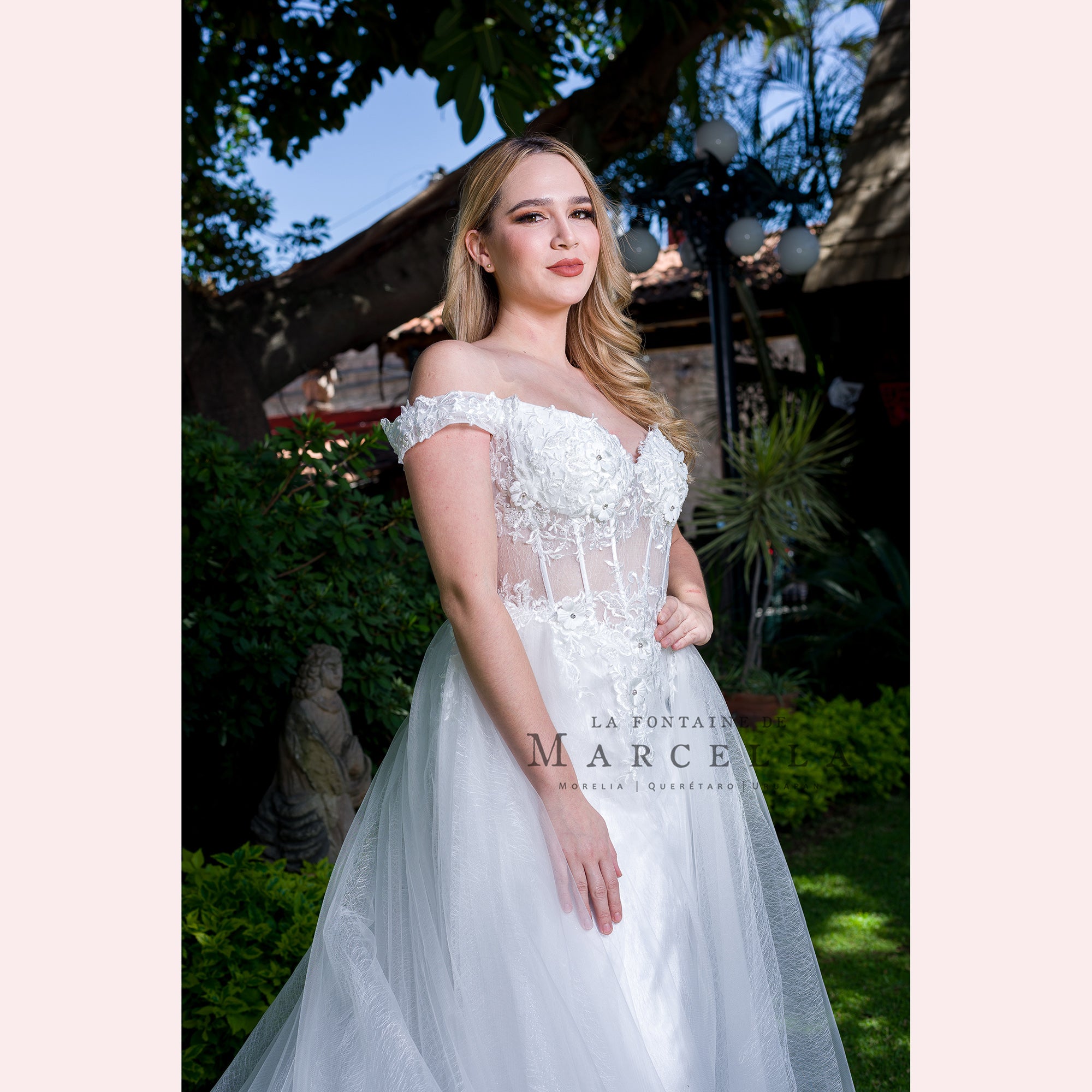 Vestido de novia corte princesa, con transparencia en la parte superior y aplicación floral es recomendado para cuerpos tipo Triangulo Invertido y Rectángulo.Leer más