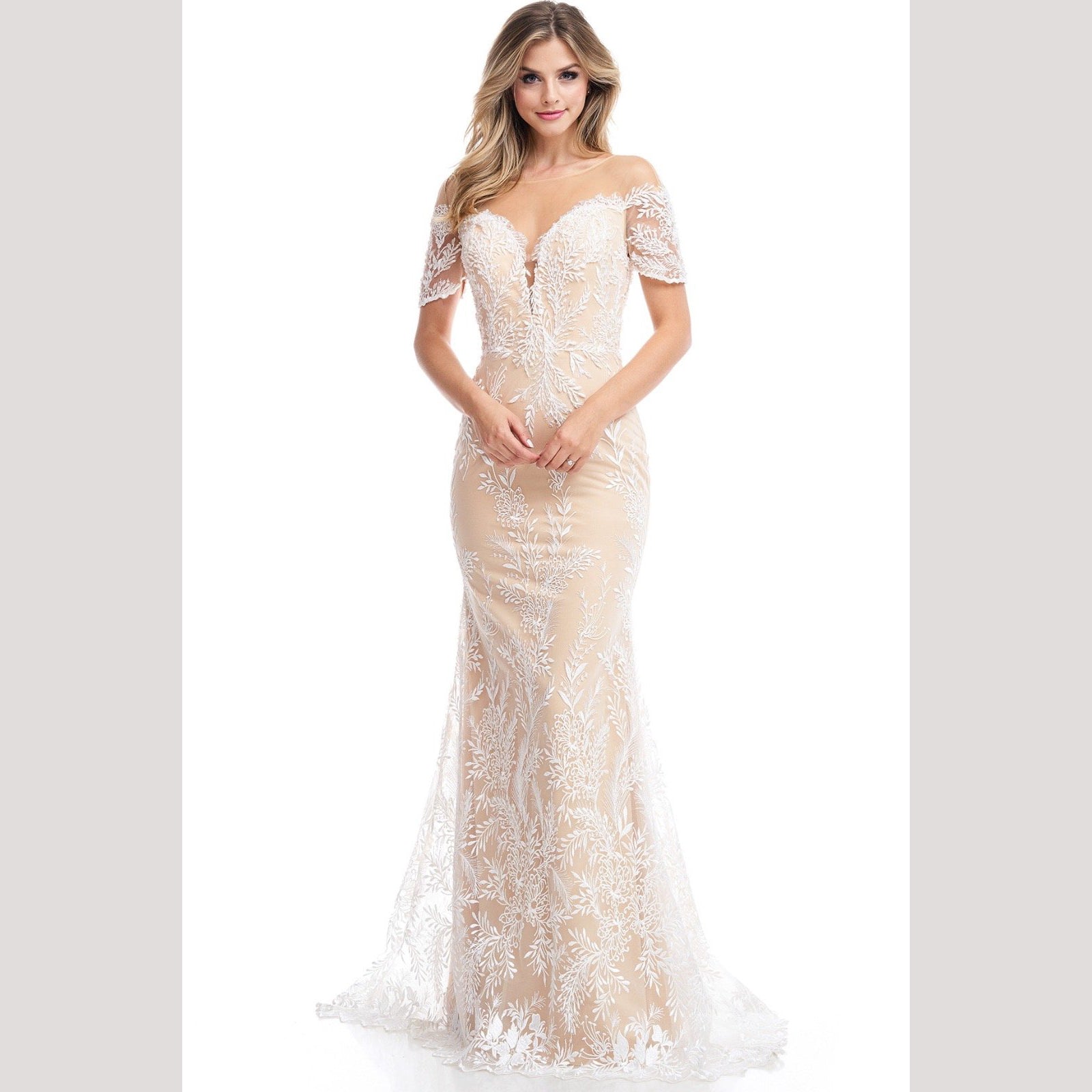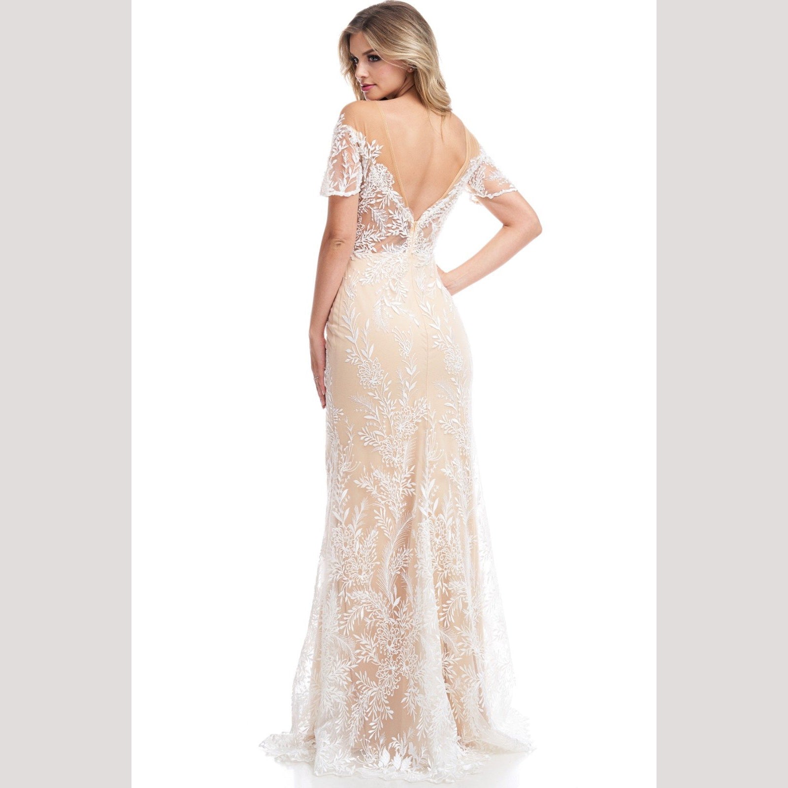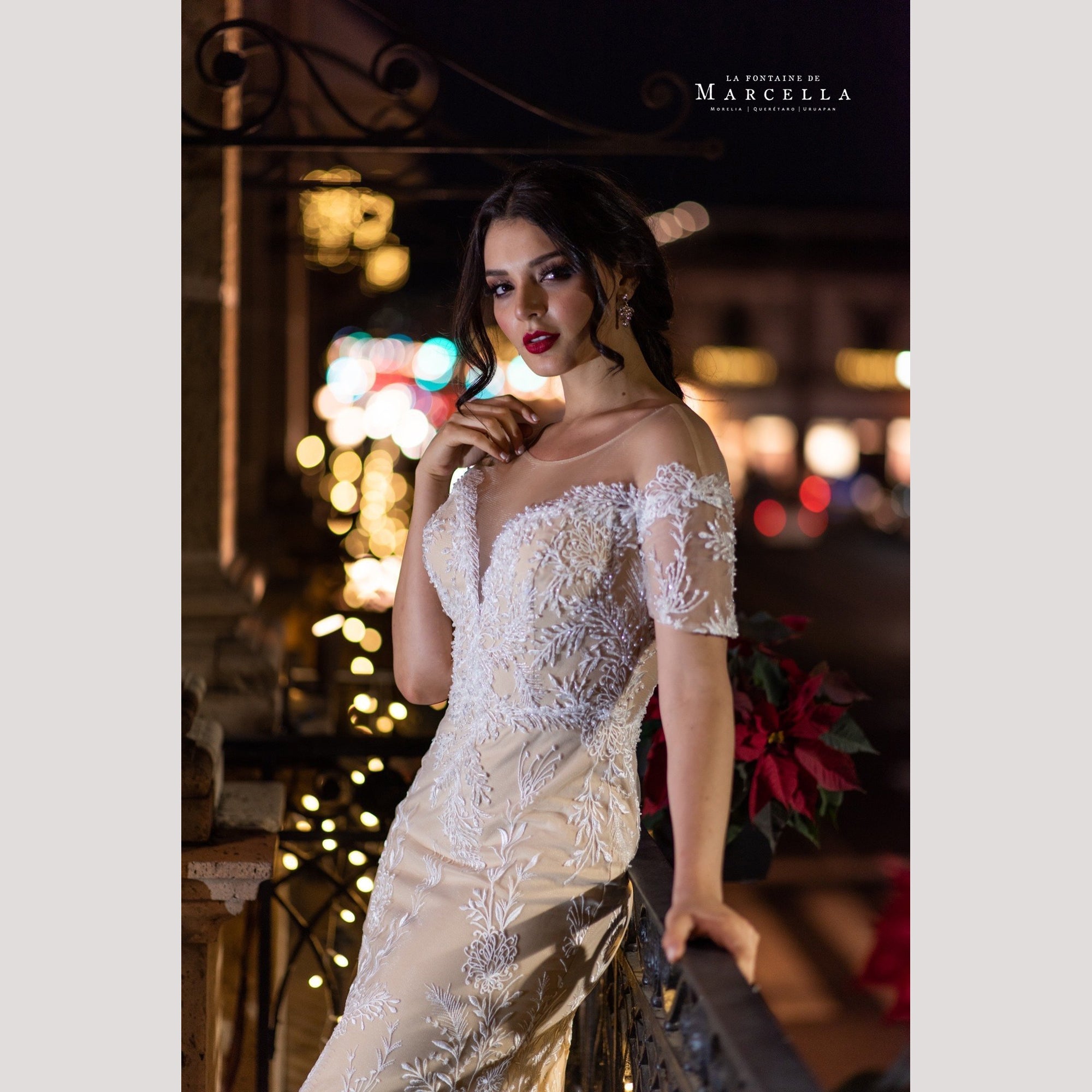 Vestido de novia con manga corta, aplicaciones en pedrería y cristales, espalda en V, inserción tipo malla en brazos. Ideal para cuerpo con forma de pera, rectangular o reloj de arena.