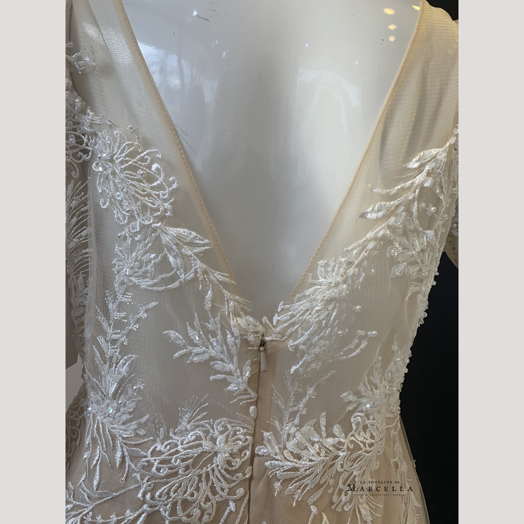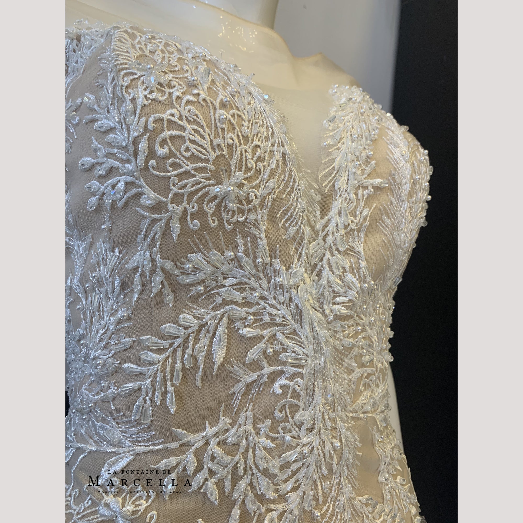 Vestido de novia con manga corta, aplicaciones en pedrería y cristales, espalda en V, inserción tipo malla en brazos. Ideal para cuerpo con forma de pera, rectangular o reloj de arena. Leer más