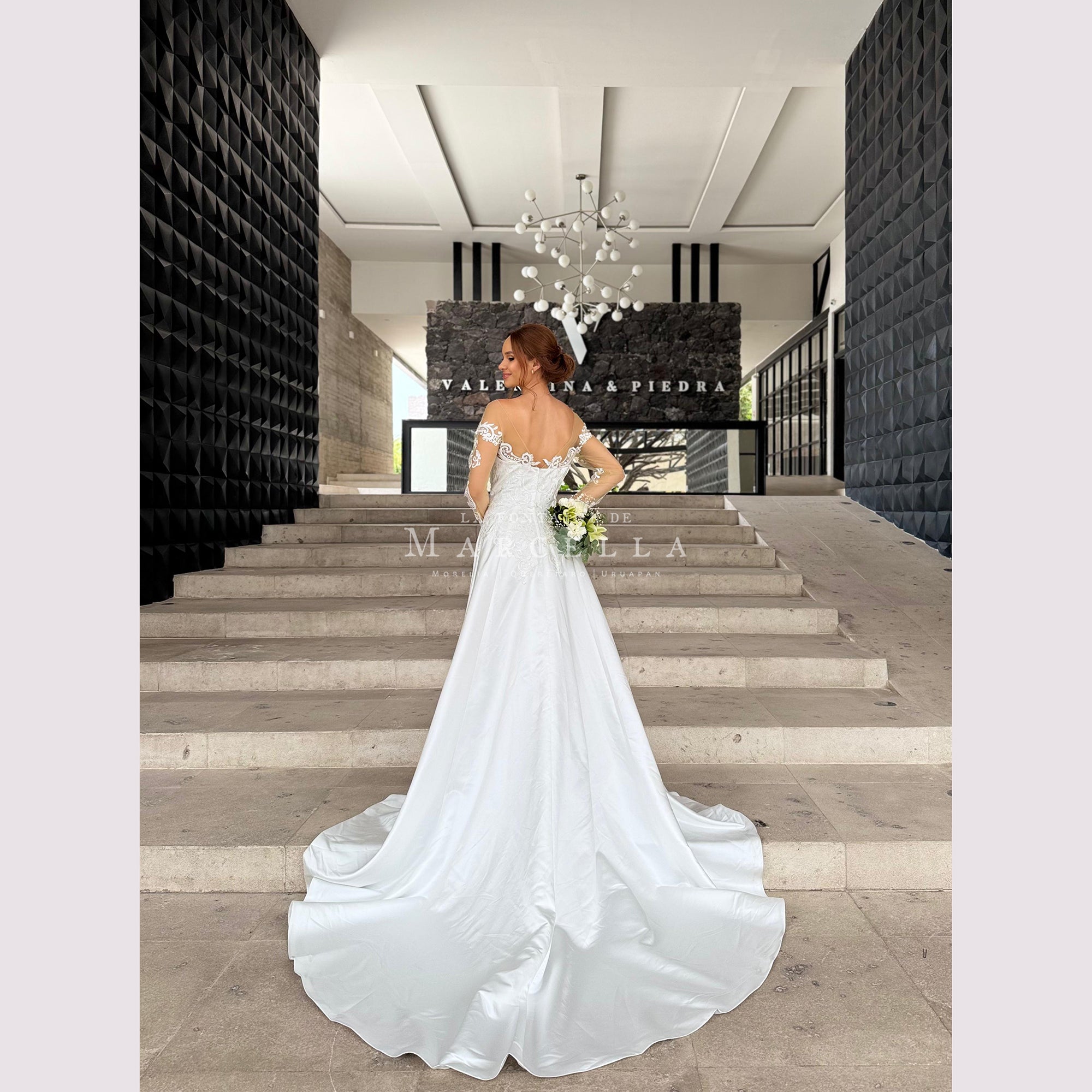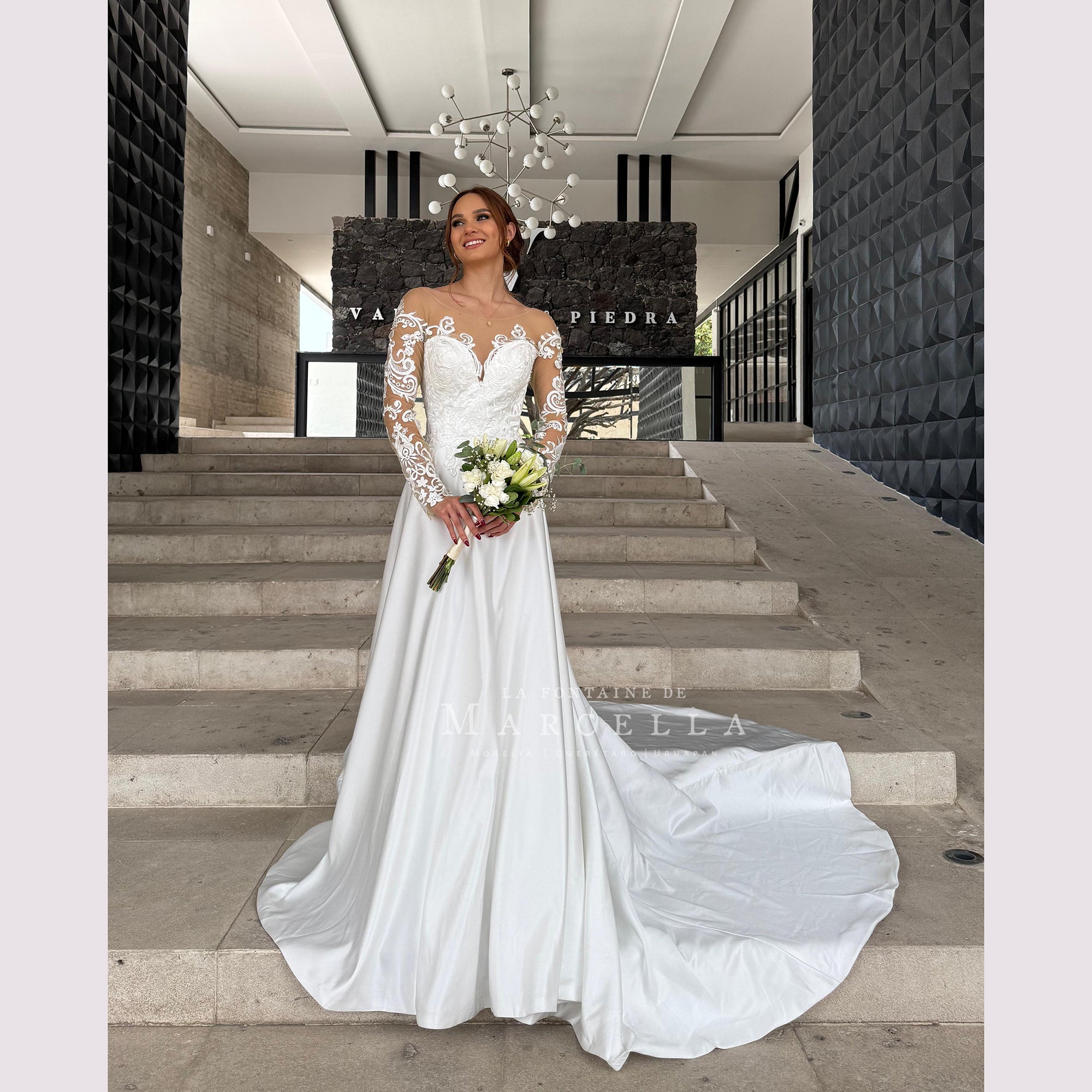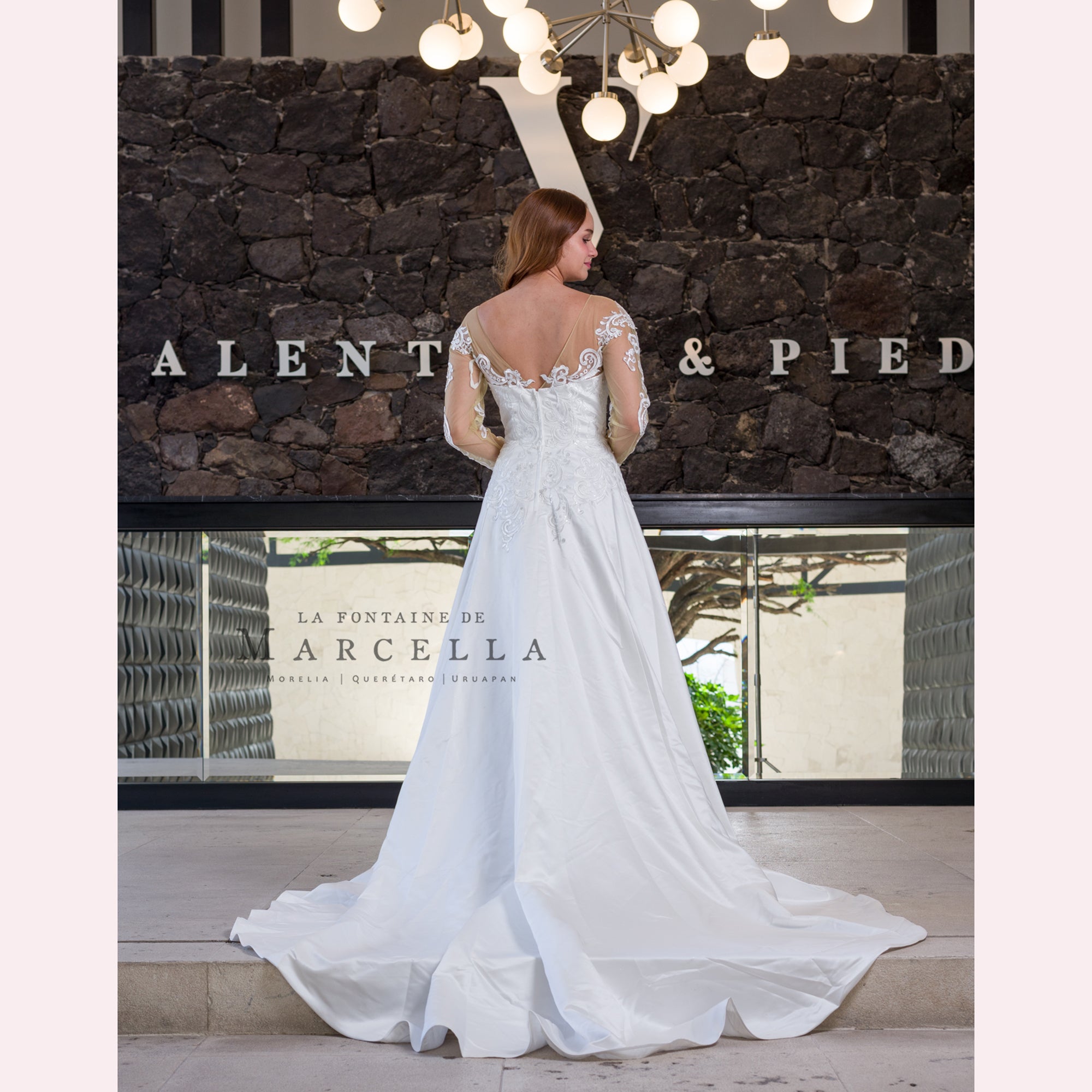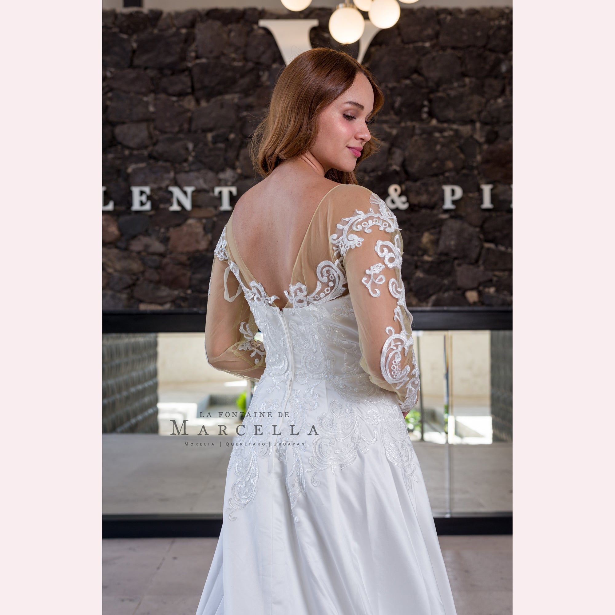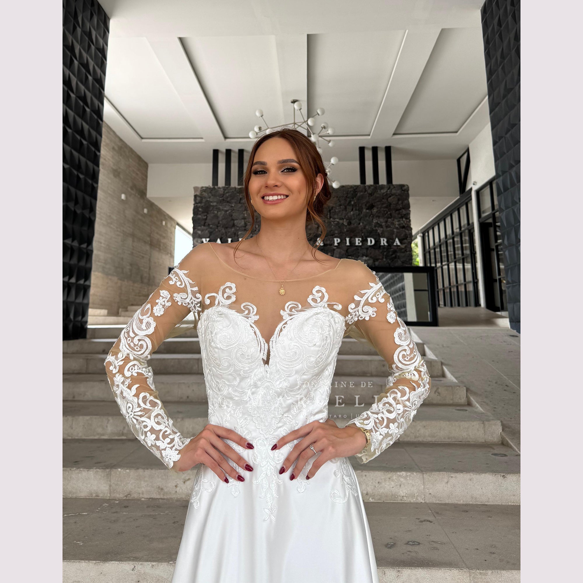 Vestido de novia de manga larga con hermosa aplicación y en corte A, es recomendado para cuerpos tipo Reloj de Arena y Rectangulo.Leer más