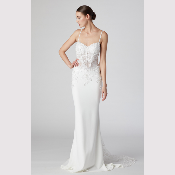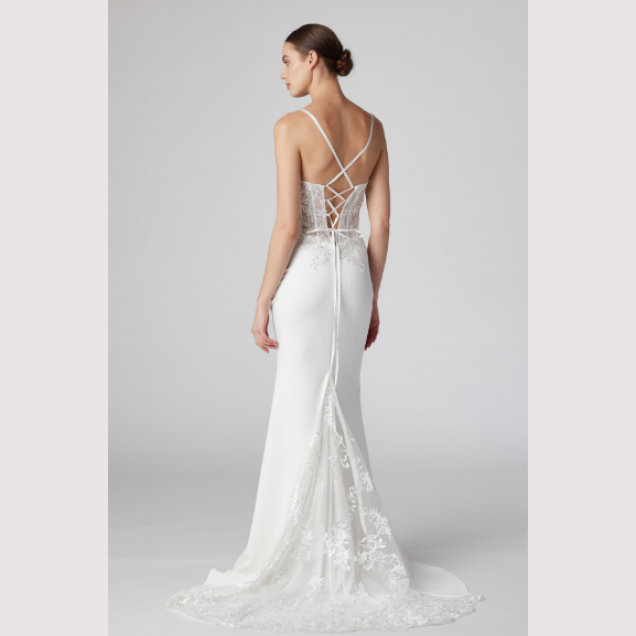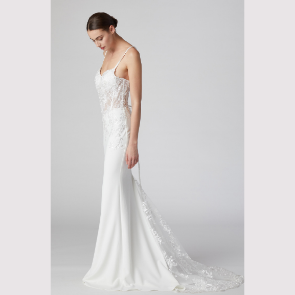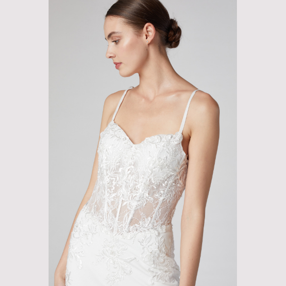 Vestido de novia con corte sirena de tirante delgado y corsé en la espalda, esta hermosamente adornado con aplicación en toda su cauda, es recomendado para cuerpos tipo Reloj de Arena y Pera.
