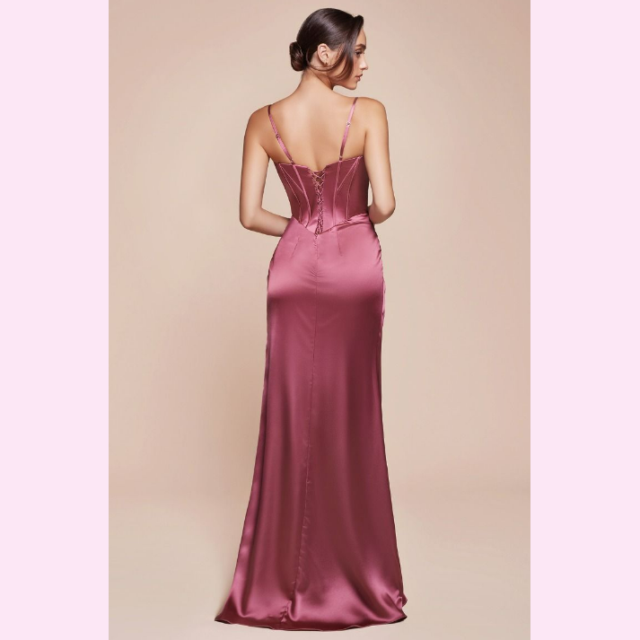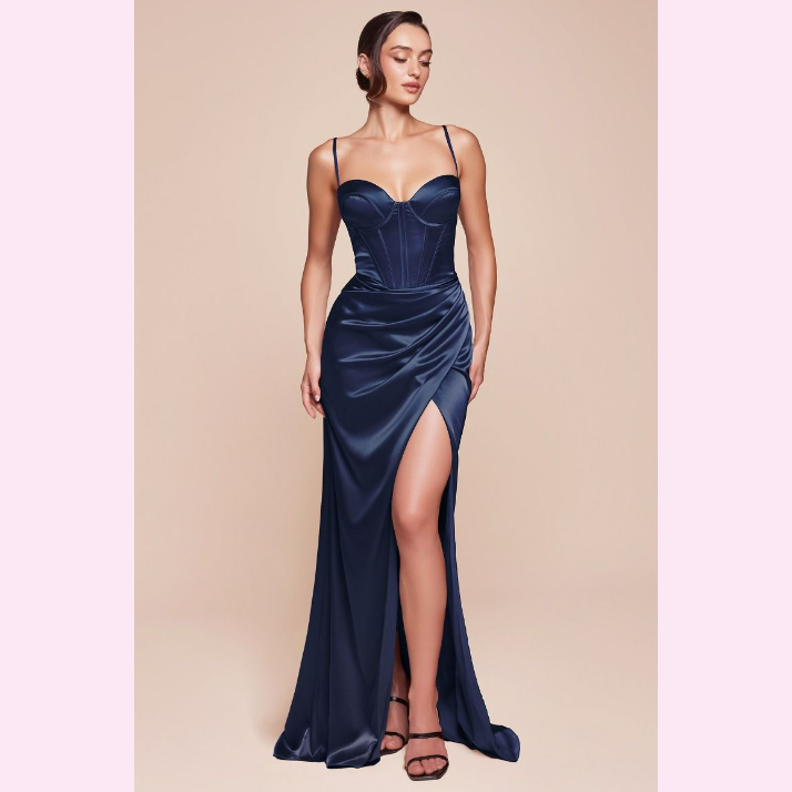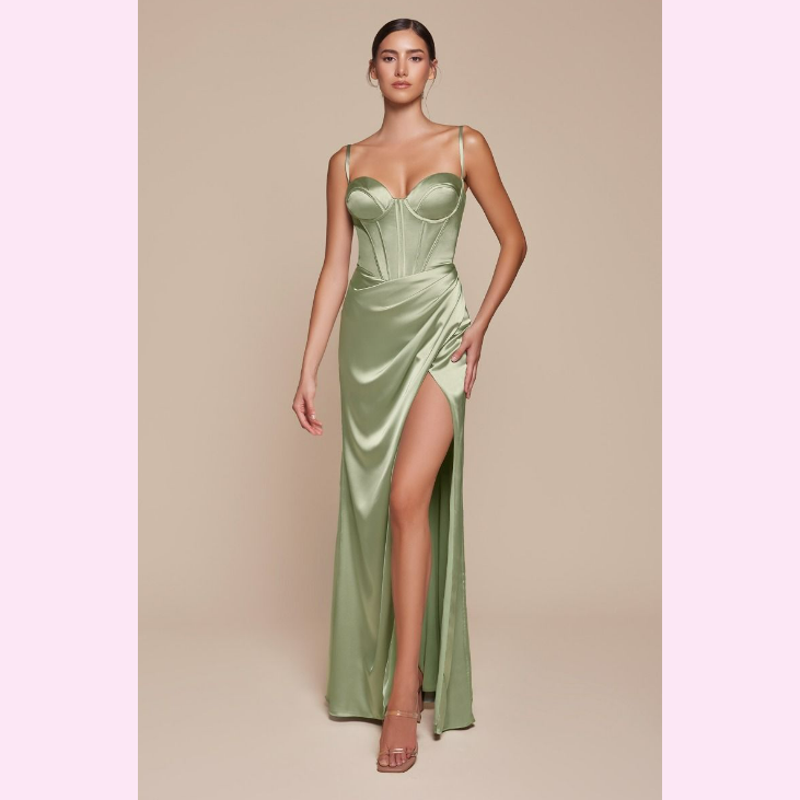 Vestido corte en A con escote corazón, vista de corse y tirante delgado, es recomendado para cuerpos tipo Reloj de Arena y Pera.