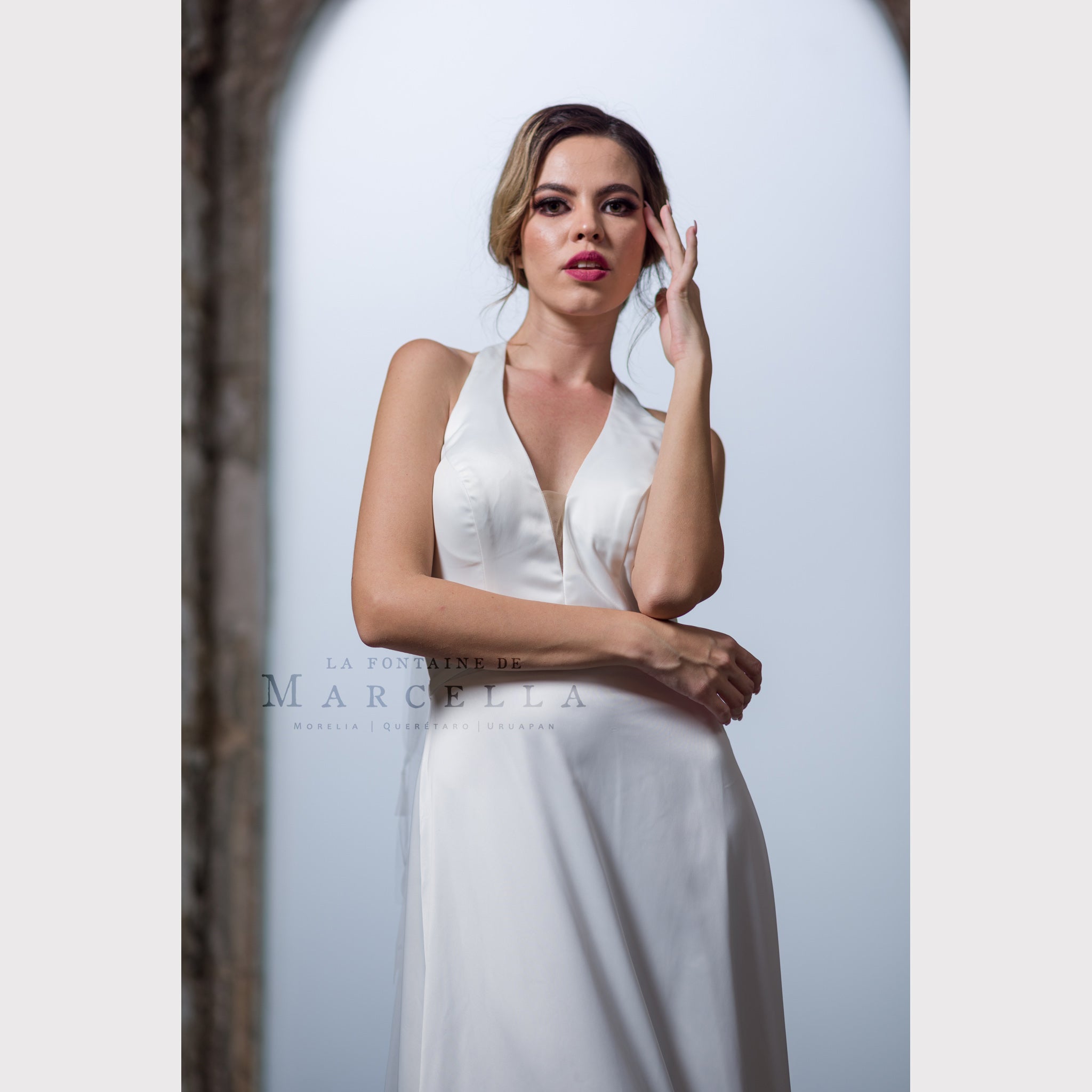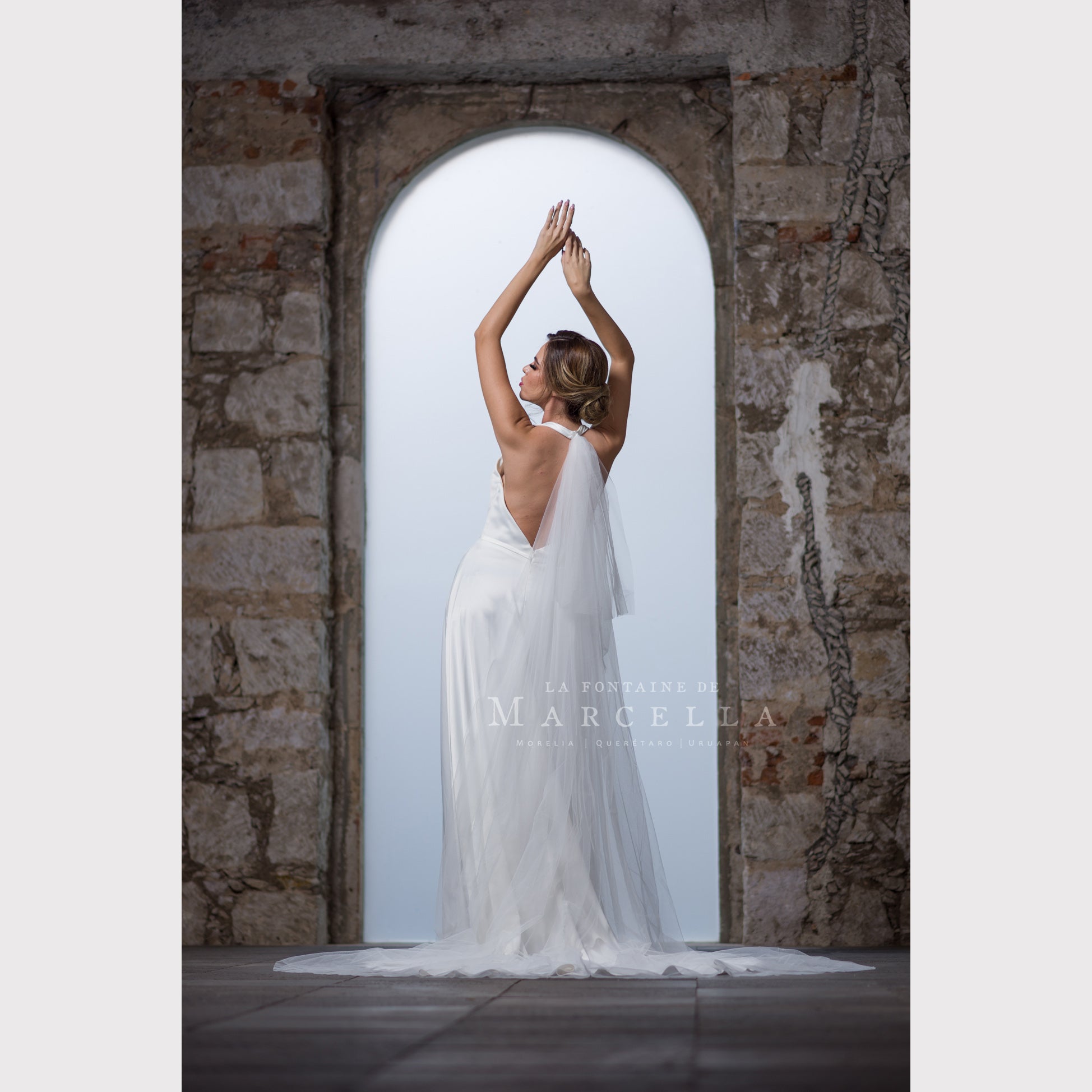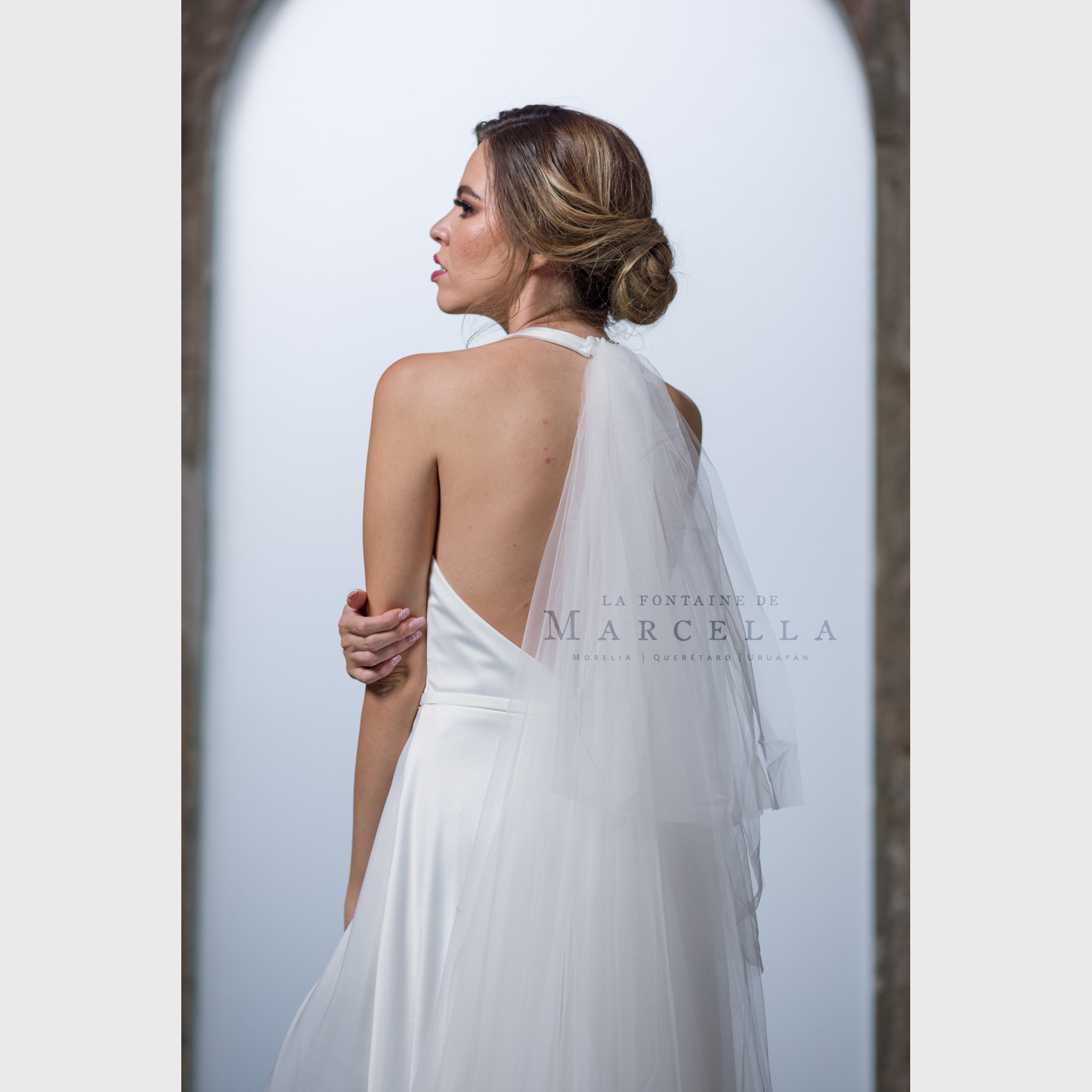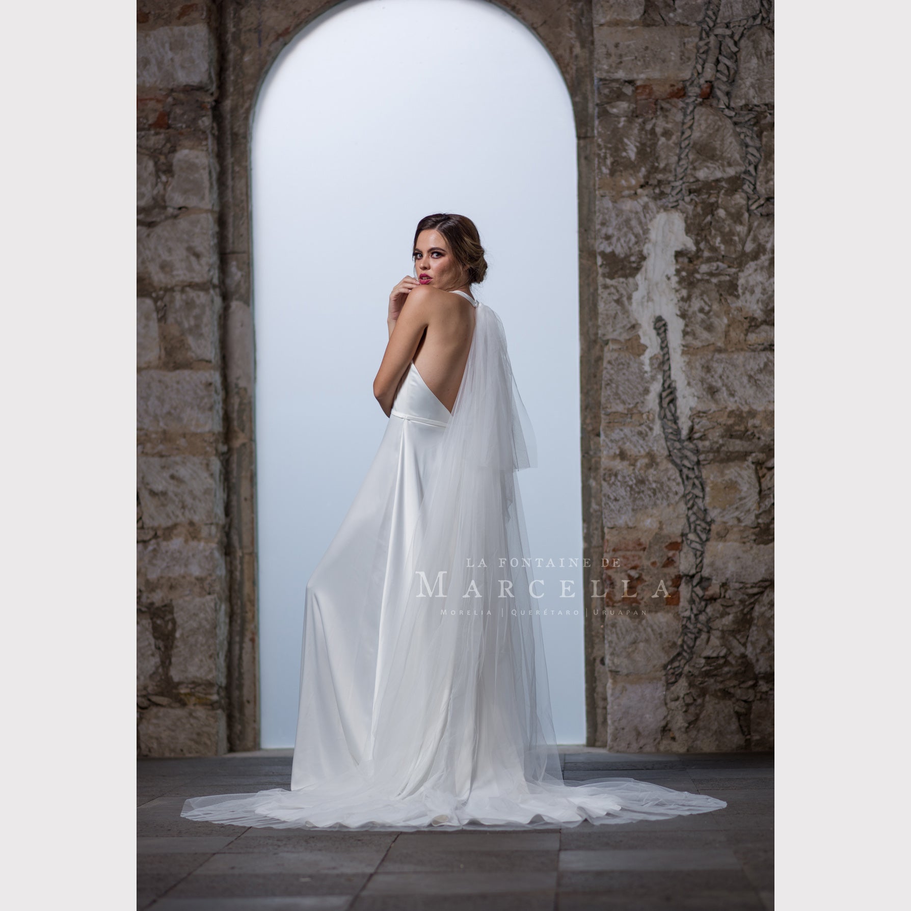 Vestido de novia de corte recto con escote en V y tirante grueso, cuenta con tul que hace efecto de capa a partir de la parte trasera del cuello, recomendado para cuerpos tipo Reloj de arena y Pera .Leer más