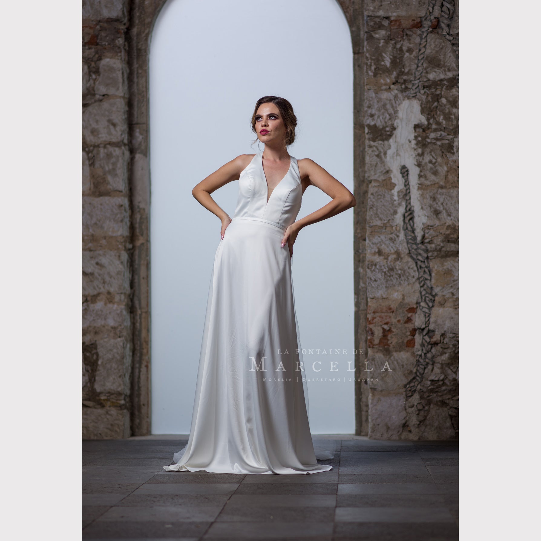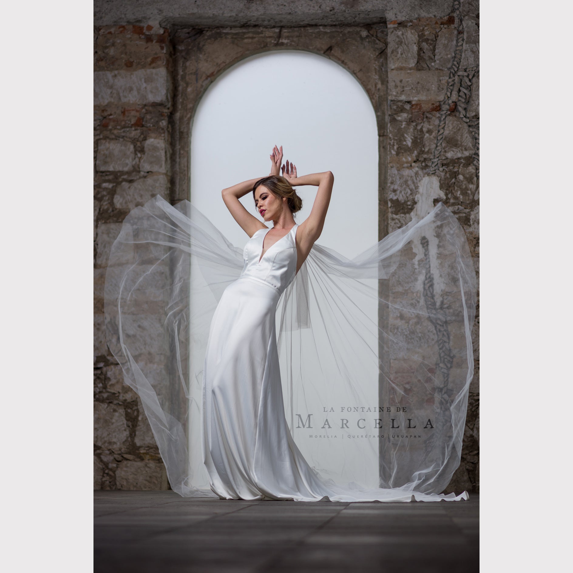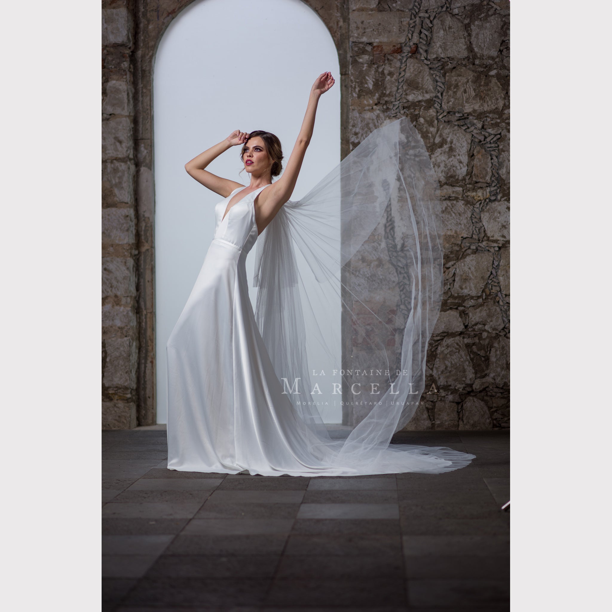 Vestido de novia de corte recto con escote en V y tirante grueso, cuenta con tul que hace efecto de capa a partir de la parte trasera del cuello, recomendado para cuerpos tipo Reloj de arena y Pera .