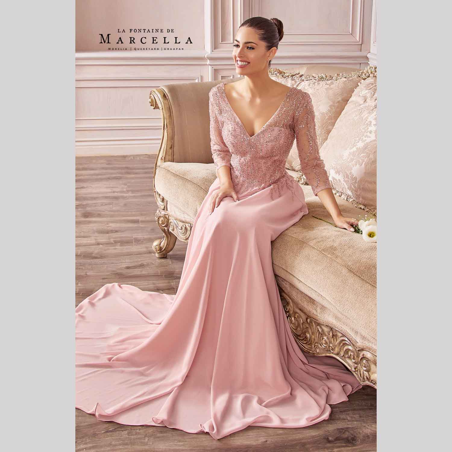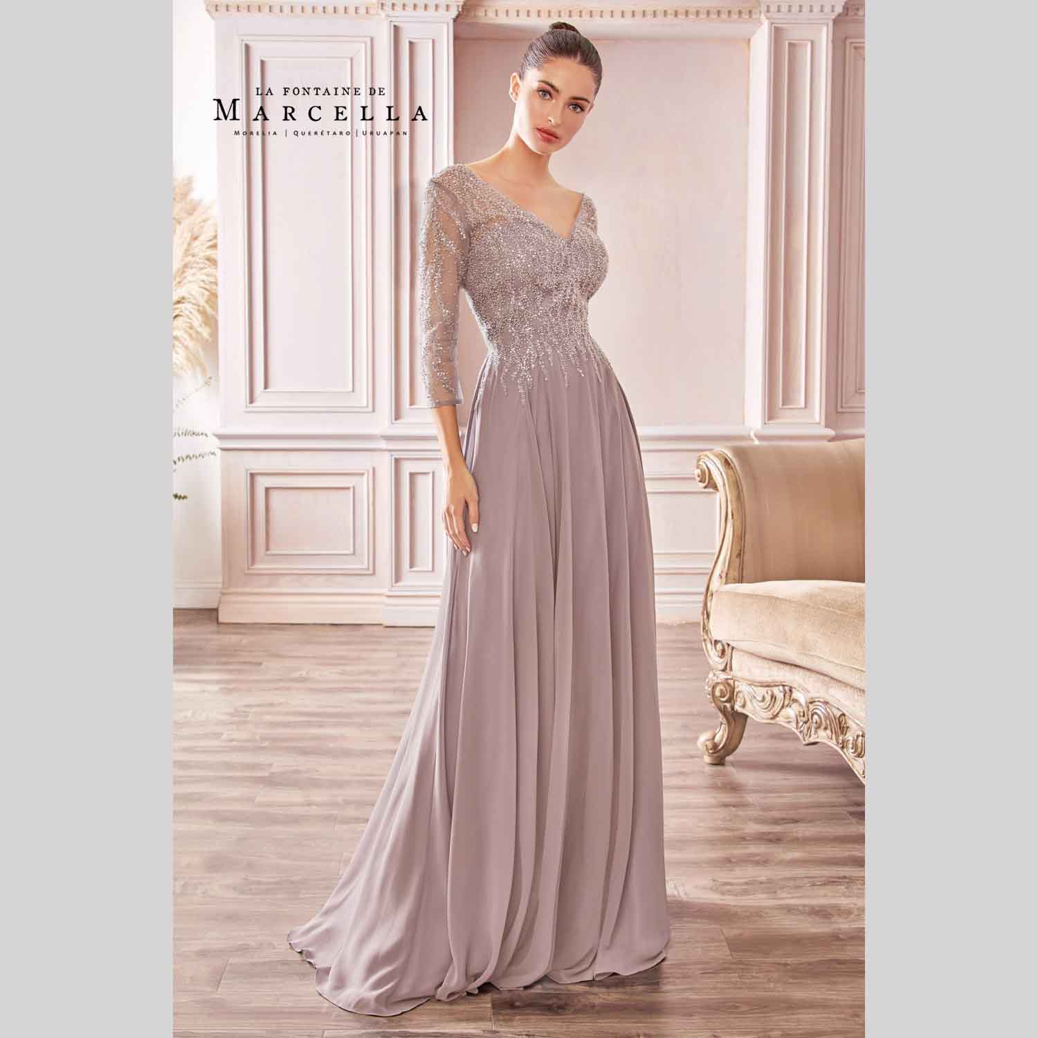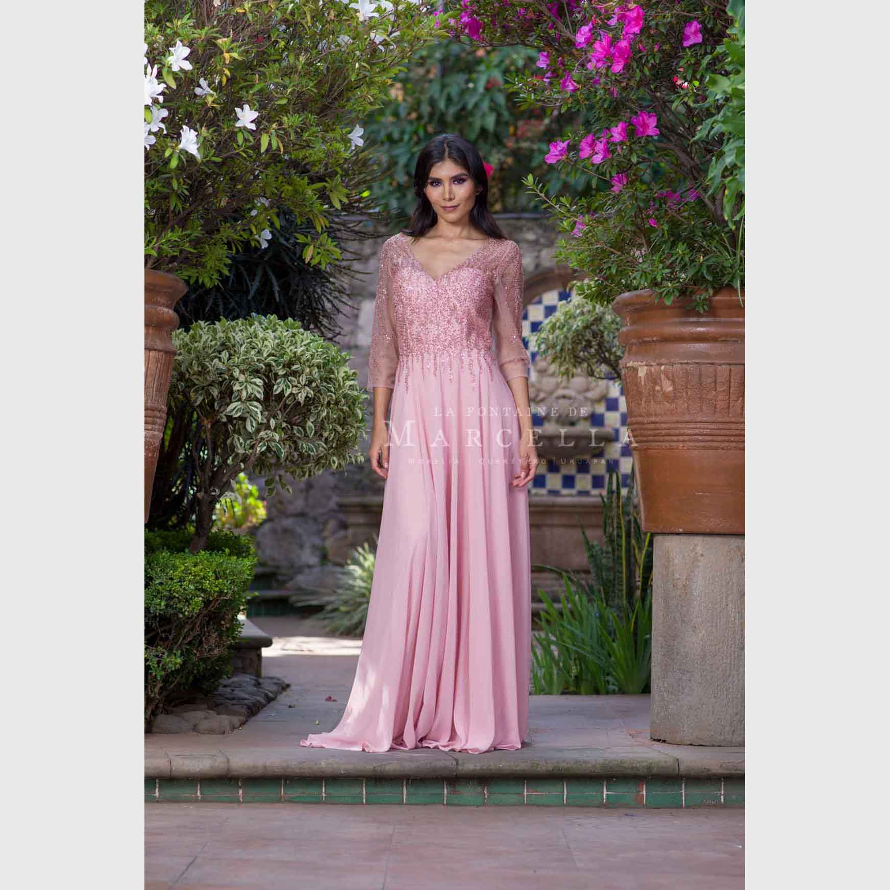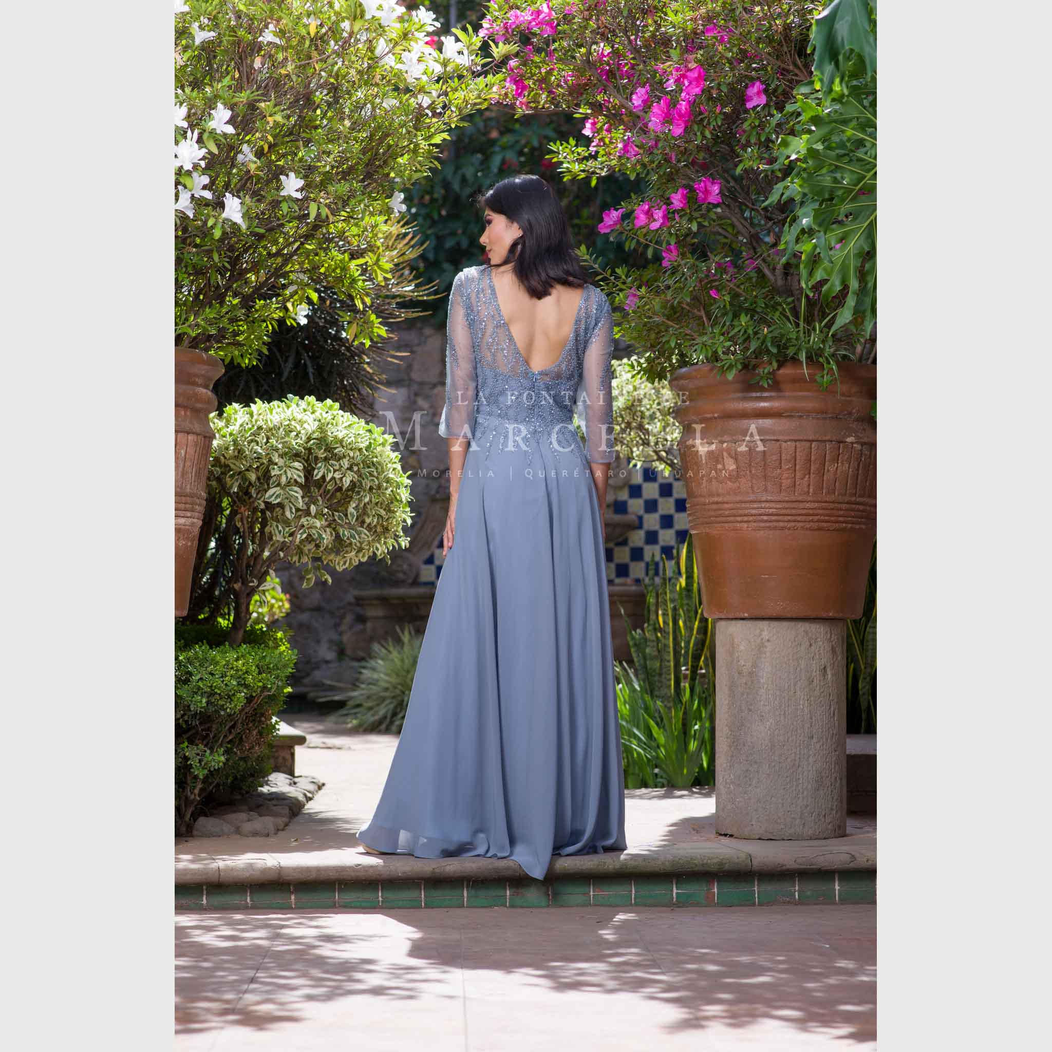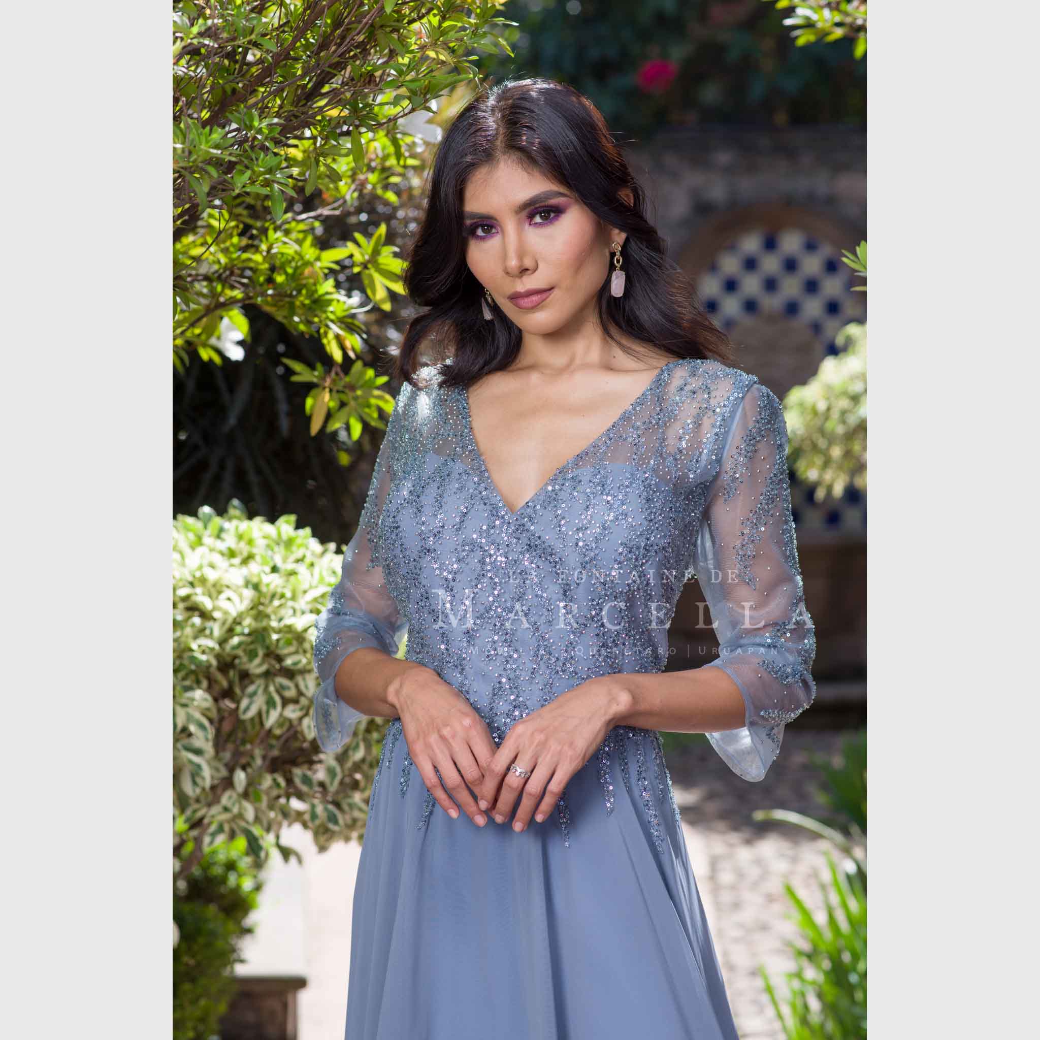Vestido adornado con aplicación brillante en la parte superior, de manga larga con transparencia. recomendado para cuerpos tipo Manzana y Rectángulo.Leer más