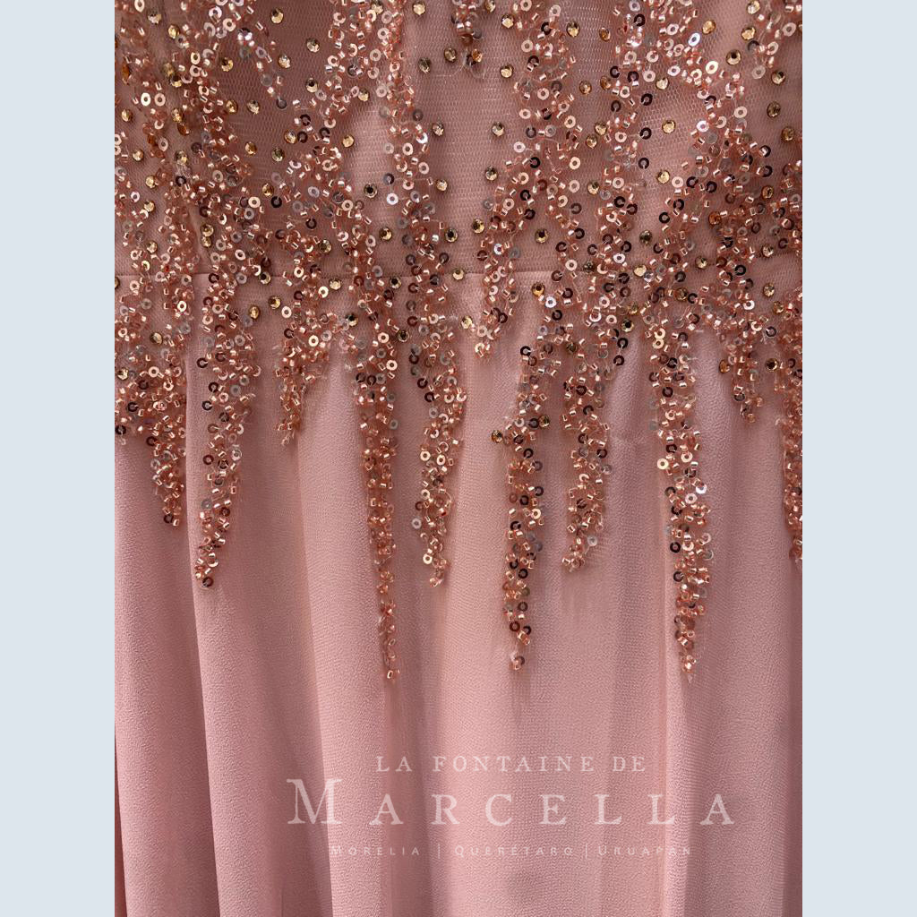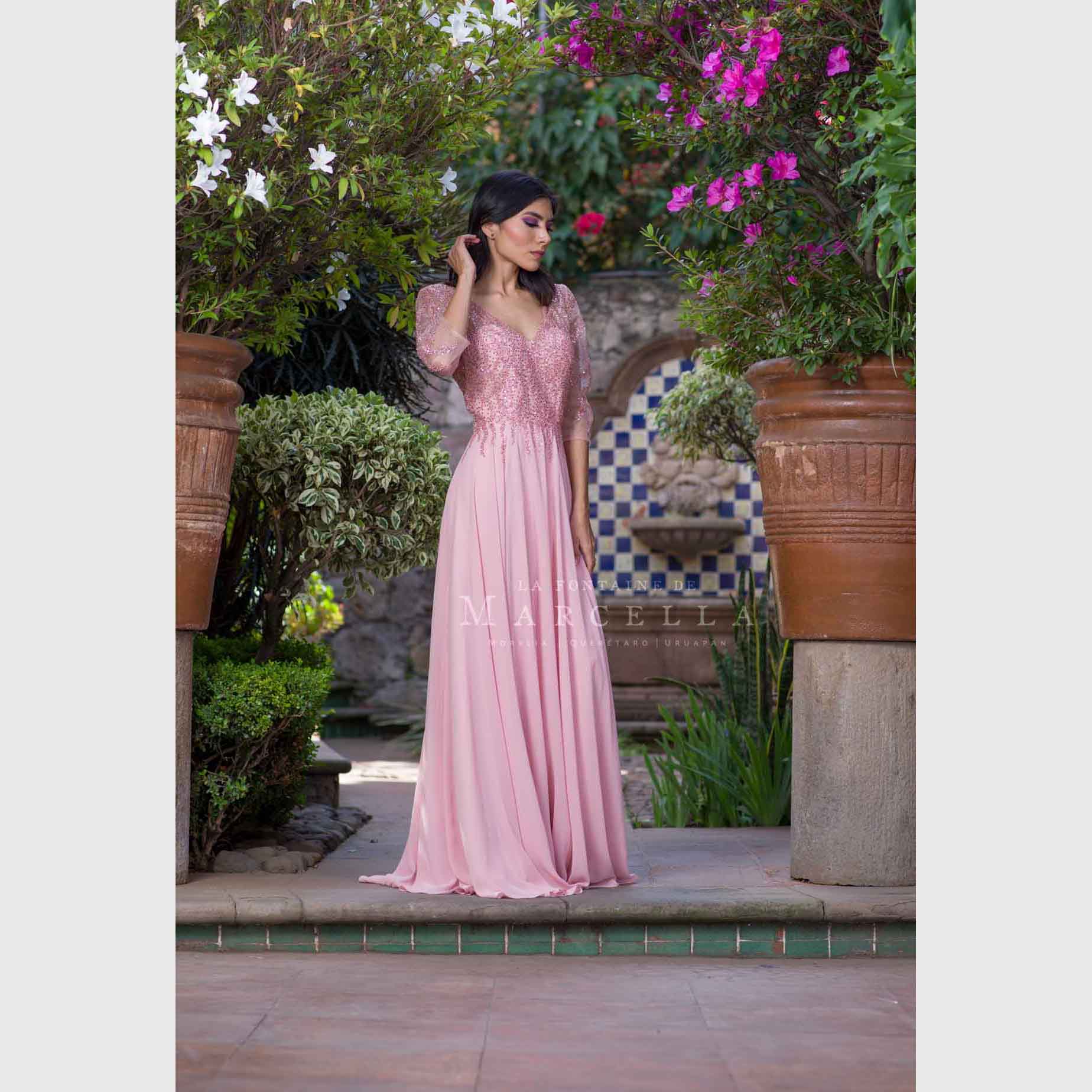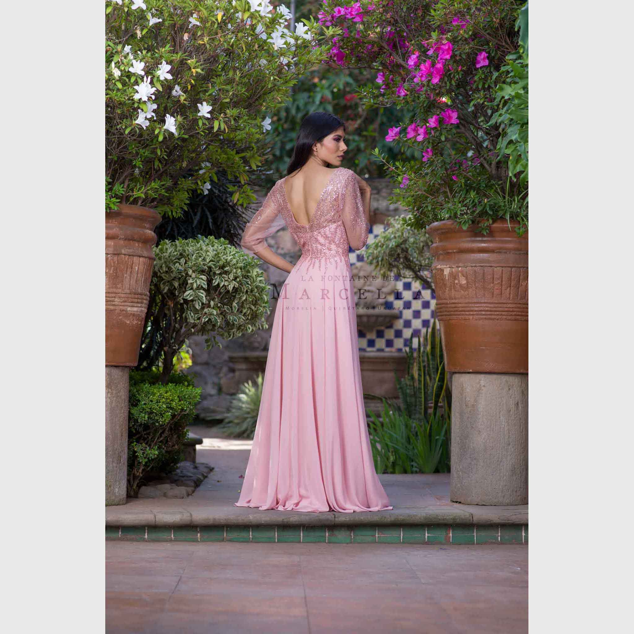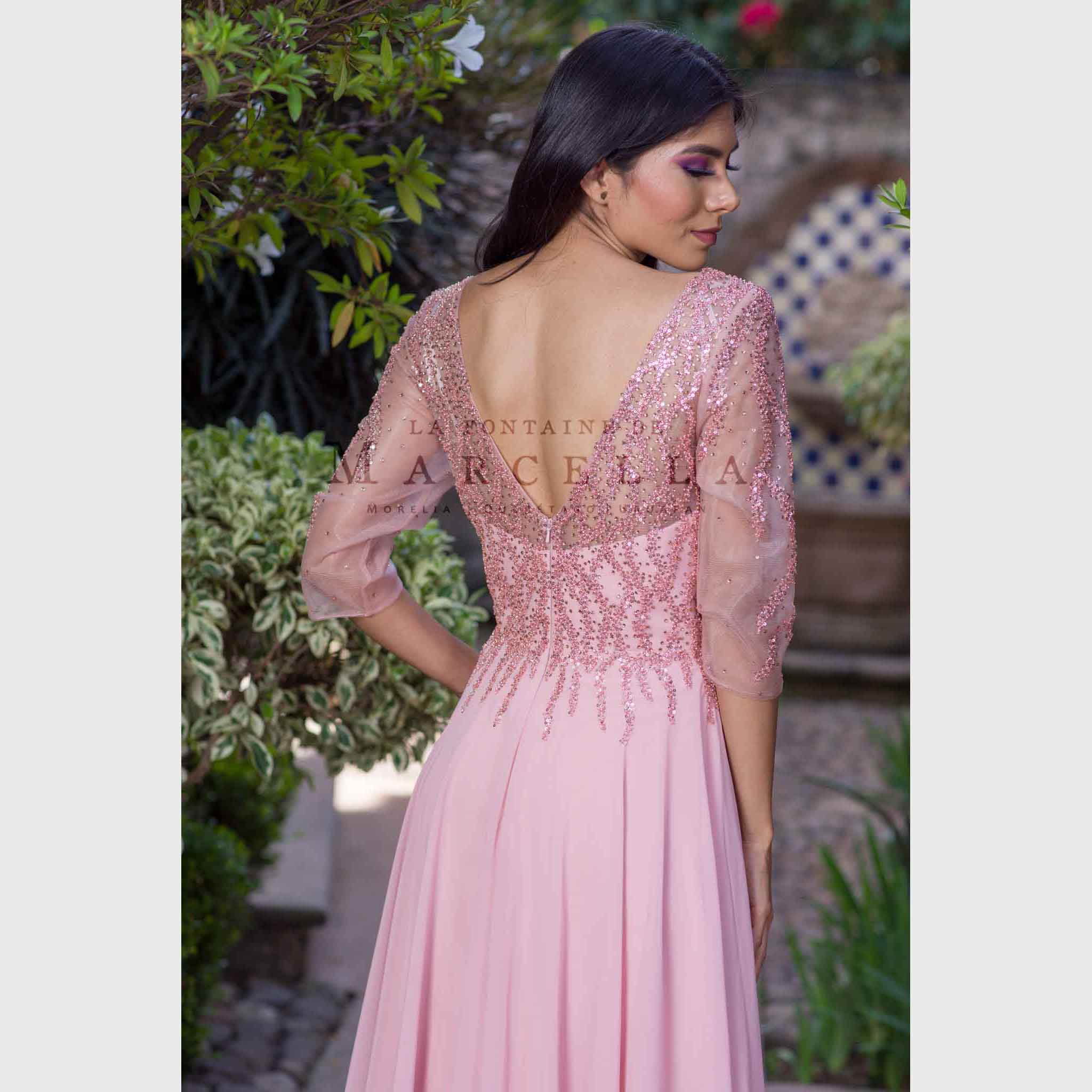 Vestido adornado con aplicación brillante en la parte superior, de manga larga con transparencia. recomendado para cuerpos tipo Manzana y Rectángulo.