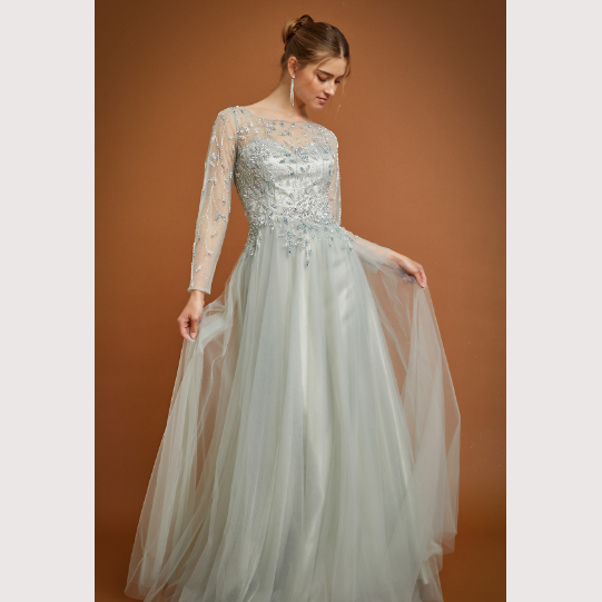 Vestido largo corte en A, con manga larga y adornado con pedrería de fantasía es recomendado para cuerpos tipo Manzana, Pera y Rectángulo.