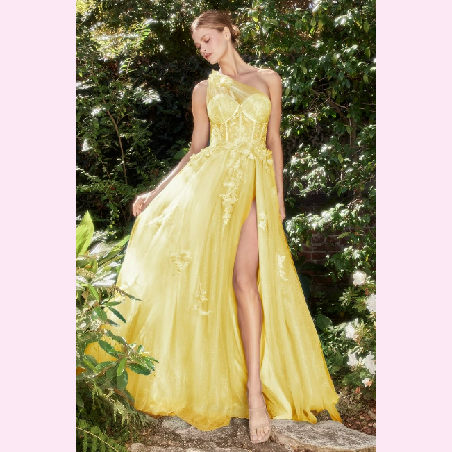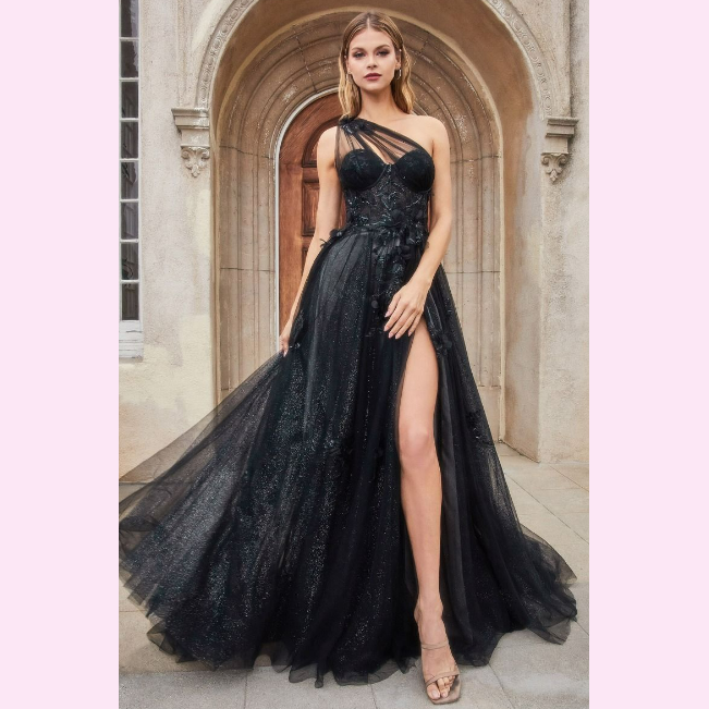 Vestido largo corte princesa con aplicación floral y una sola manga en Tul, es recomendado para cuerpos tipo Rectángulo y Triangulo Invertido.
