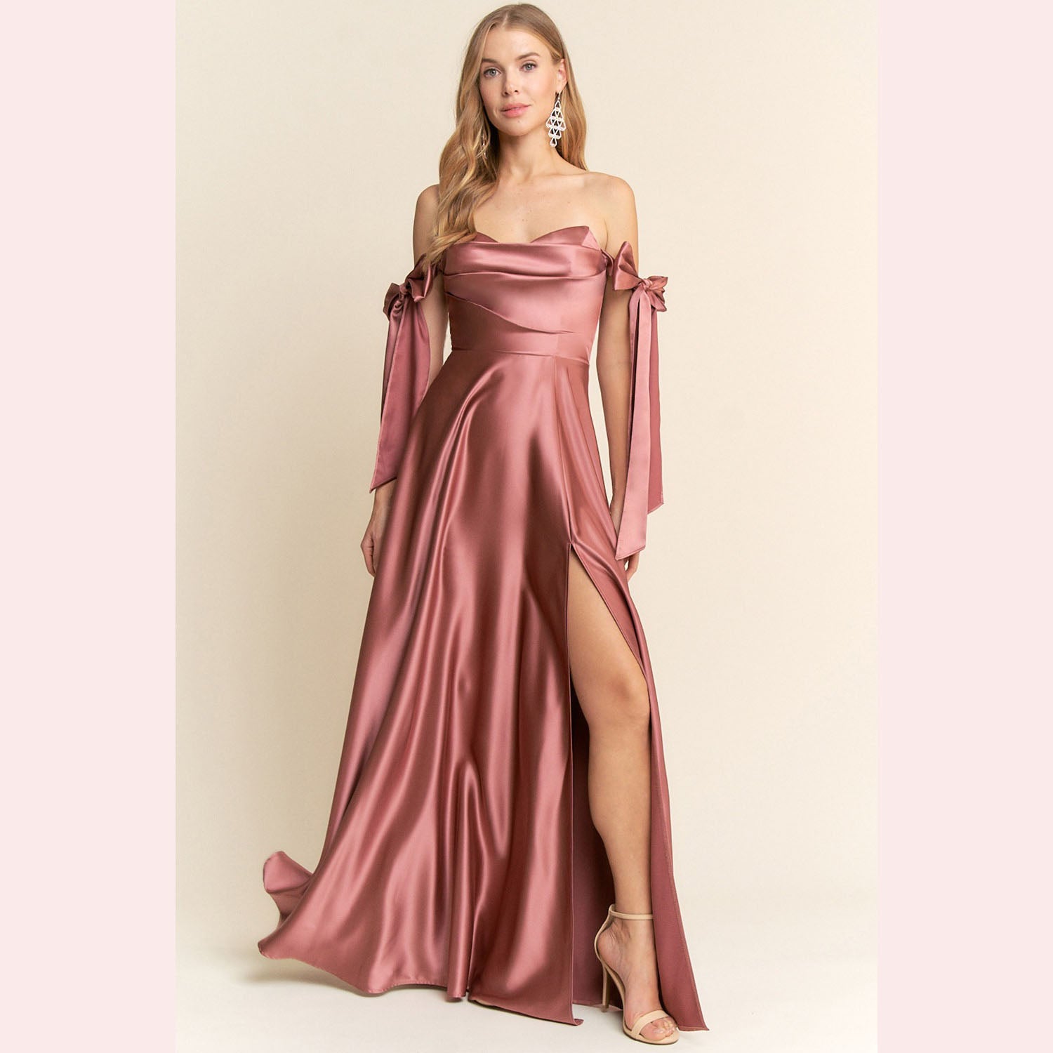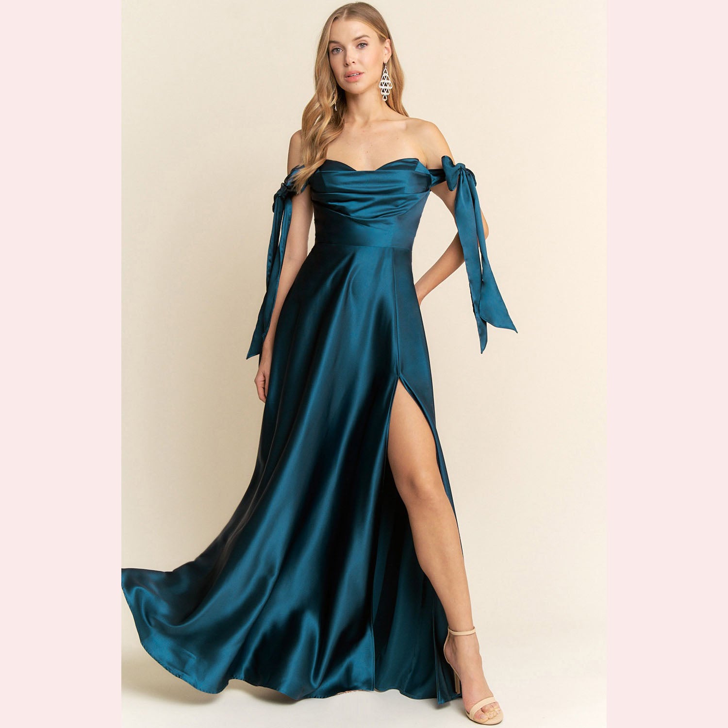 Vestido largo corte en A con manga de ojal en moño, es recomendado para cuerpos tipo Rectángulo y Pera.