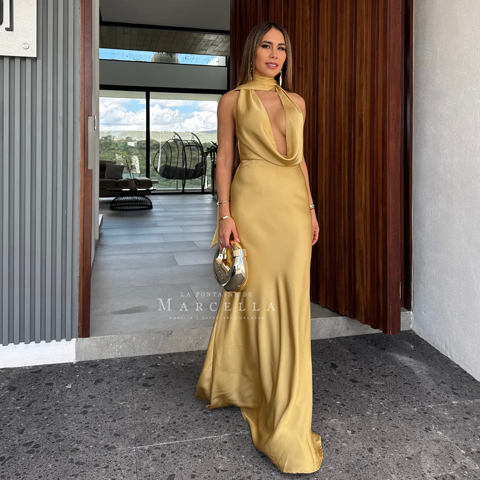 Vestido largo corte sirena con cuello de ojal que se amarra al cuello, es recomendado para cuerpos tipo Reloj de Arena y Pera. Leer más