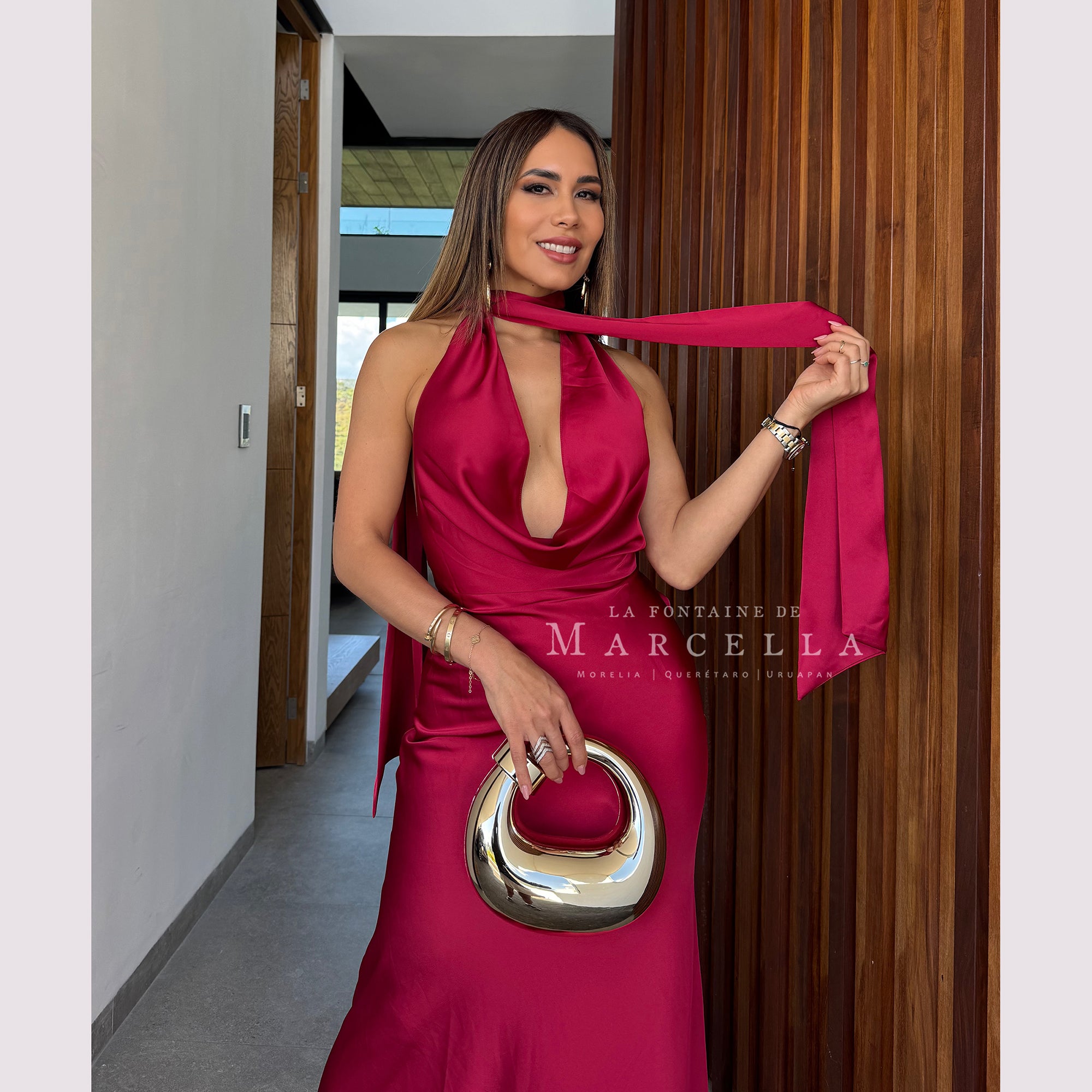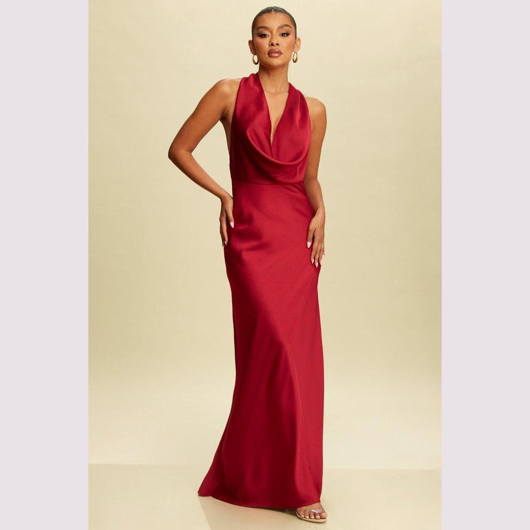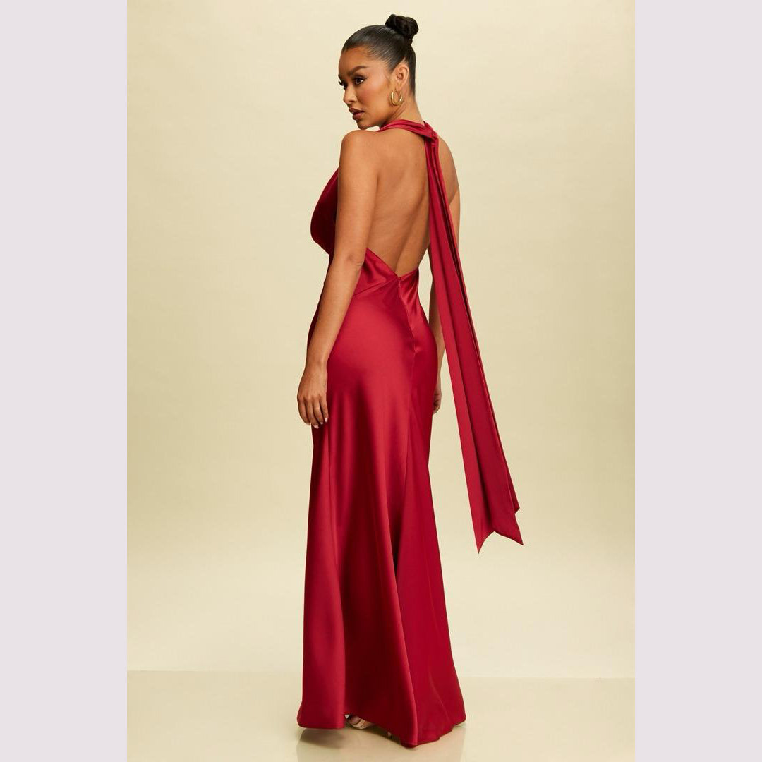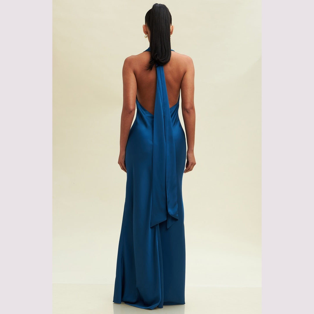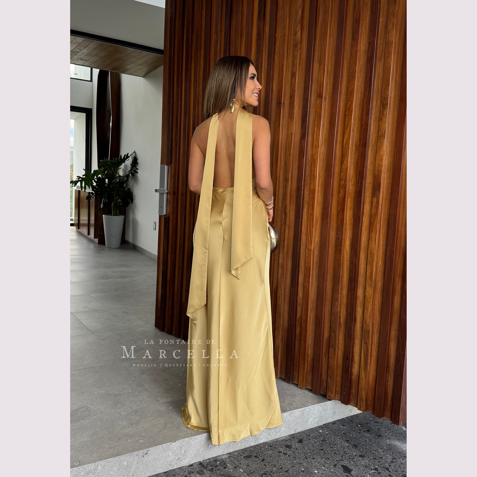 Vestido largo corte sirena con cuello de ojal que se amarra al cuello, es recomendado para cuerpos tipo Reloj de Arena y Pera.