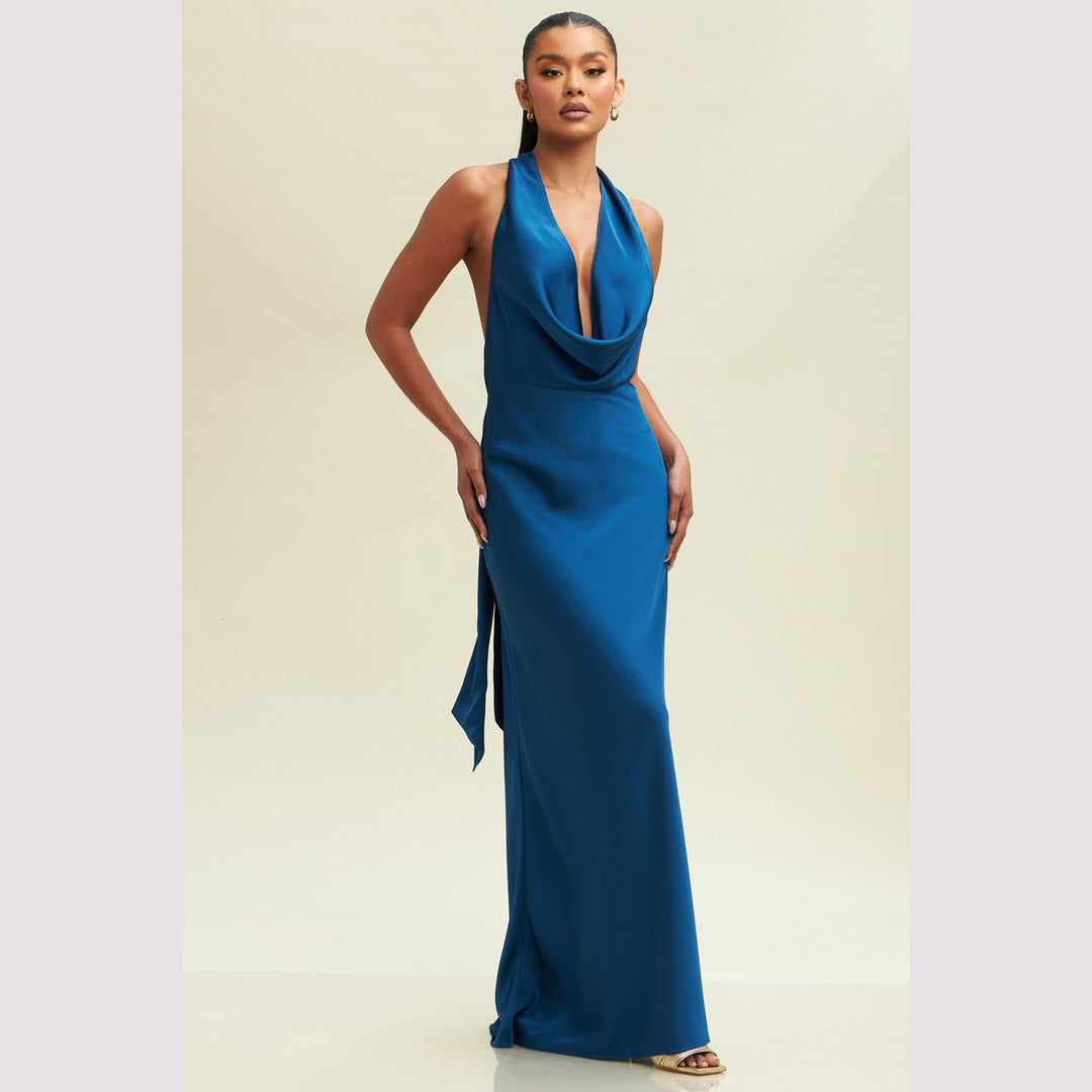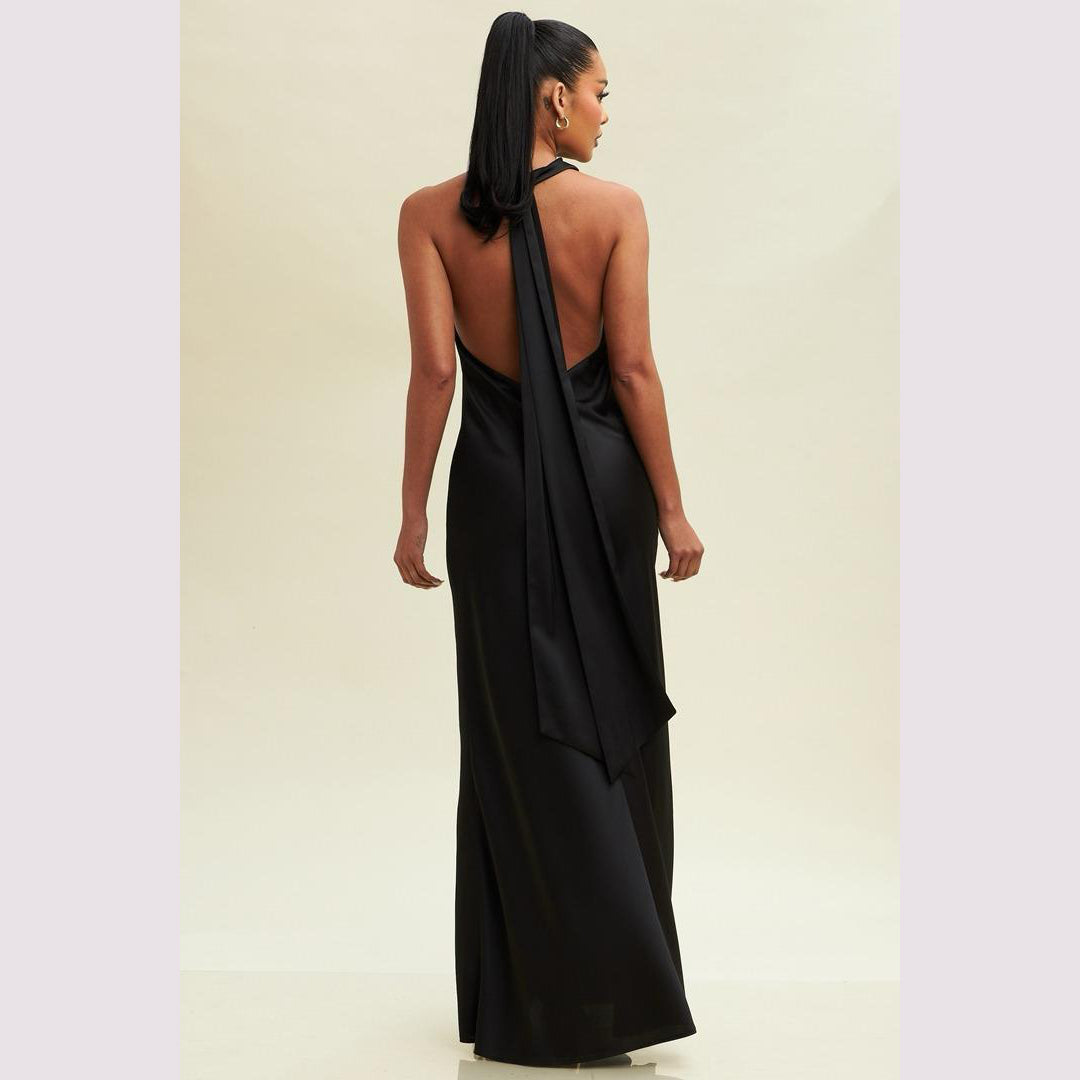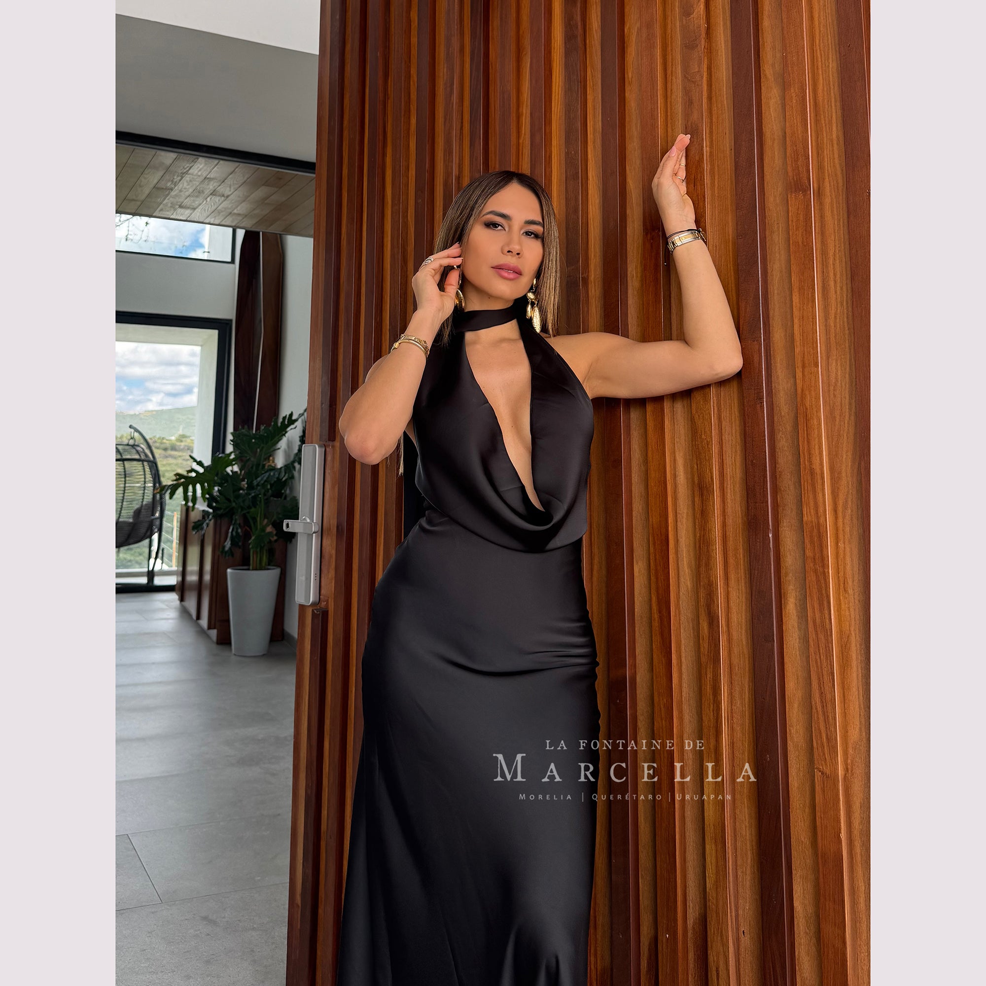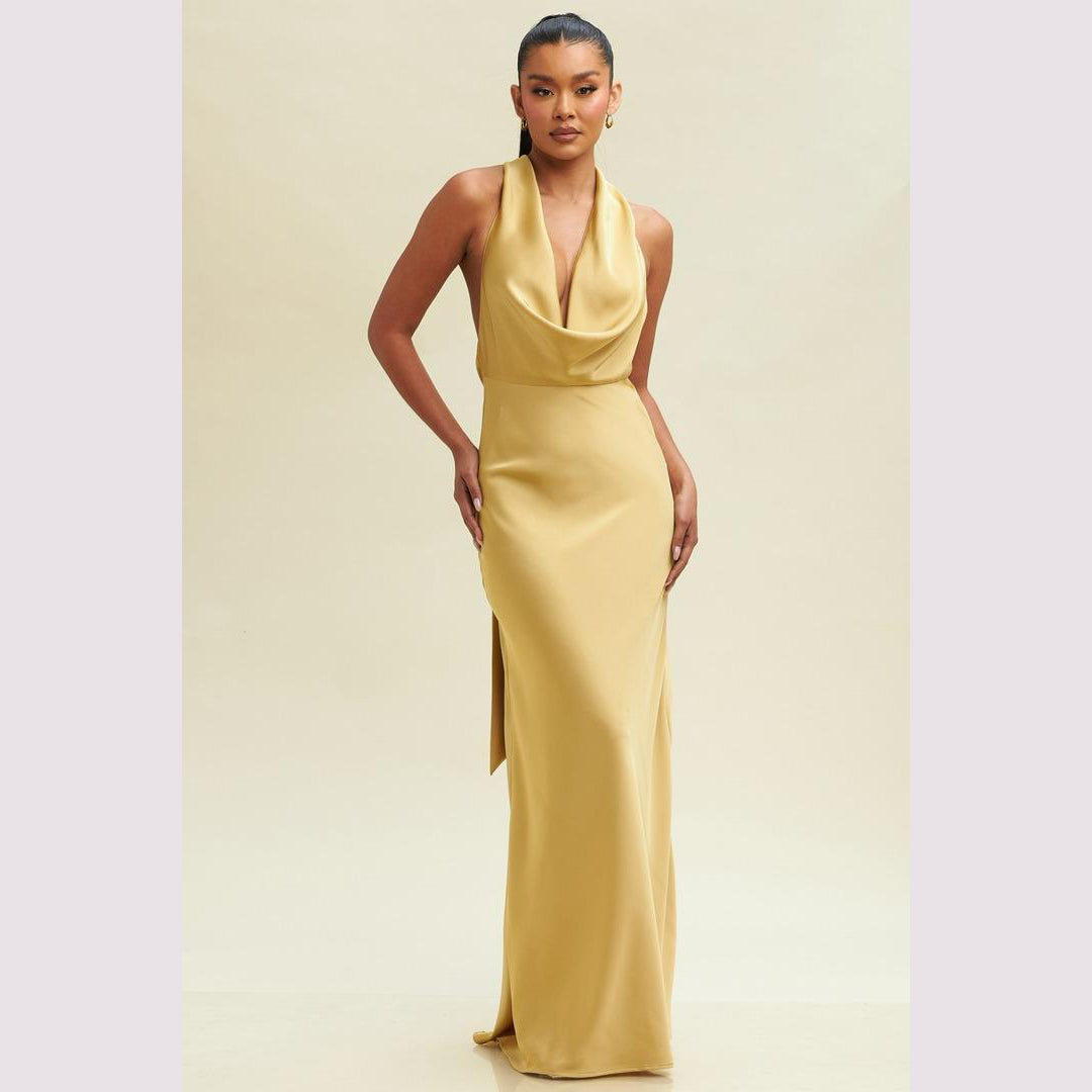 Vestido largo corte sirena con cuello de ojal que se amarra al cuello, es recomendado para cuerpos tipo Reloj de Arena y Pera.