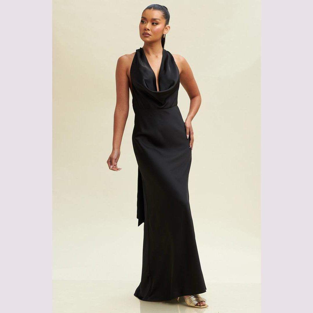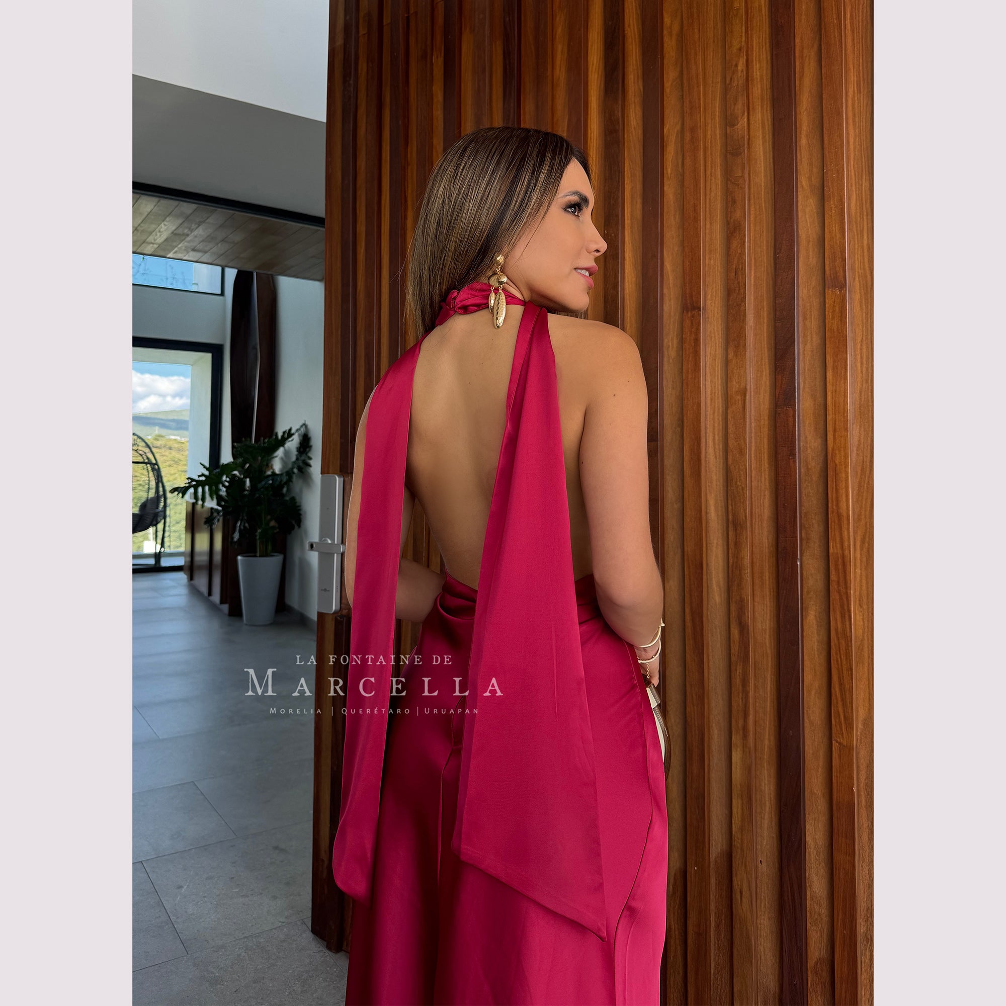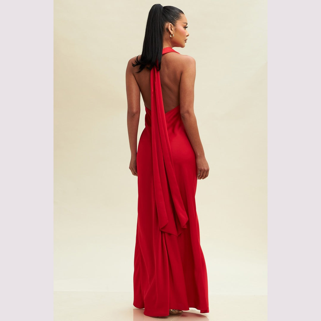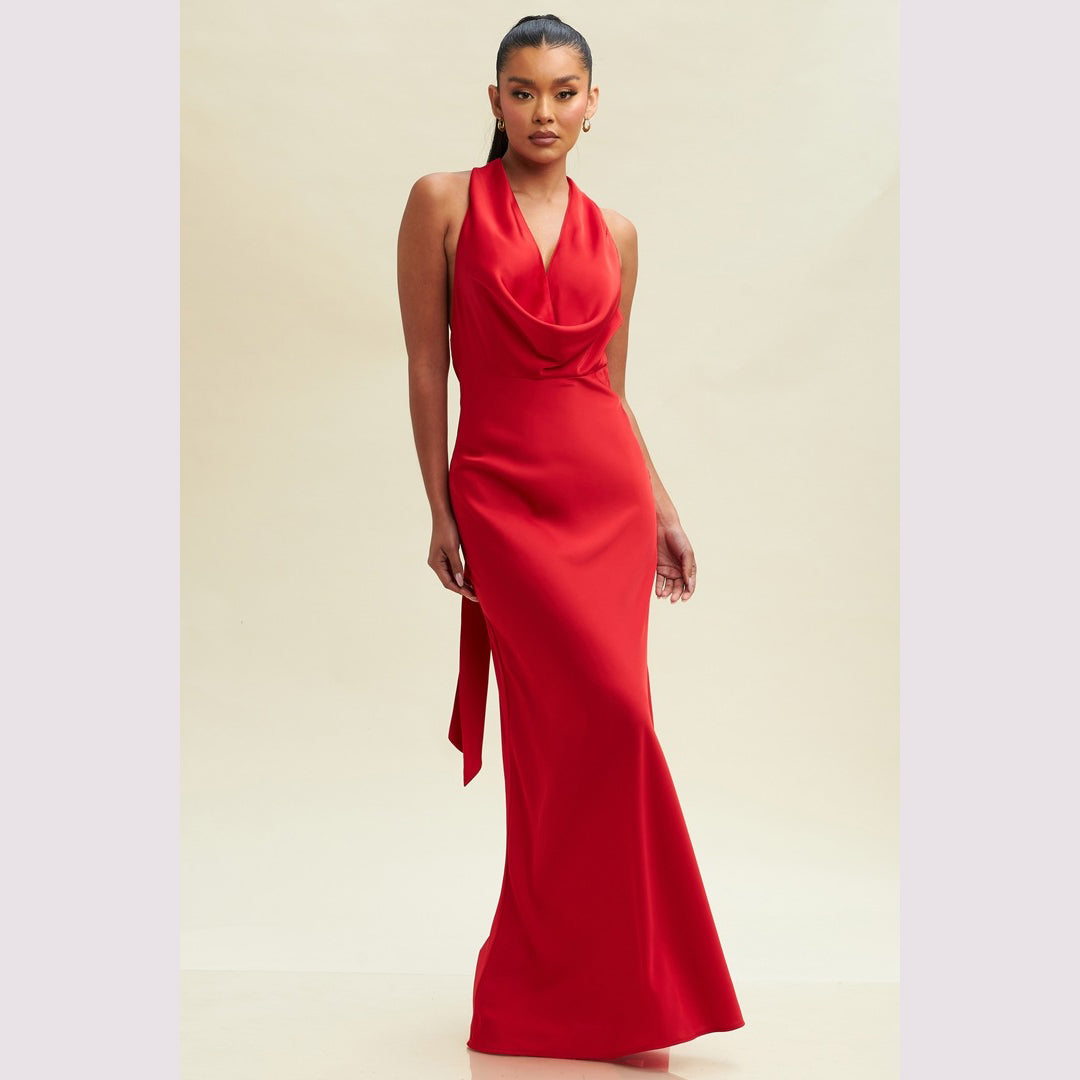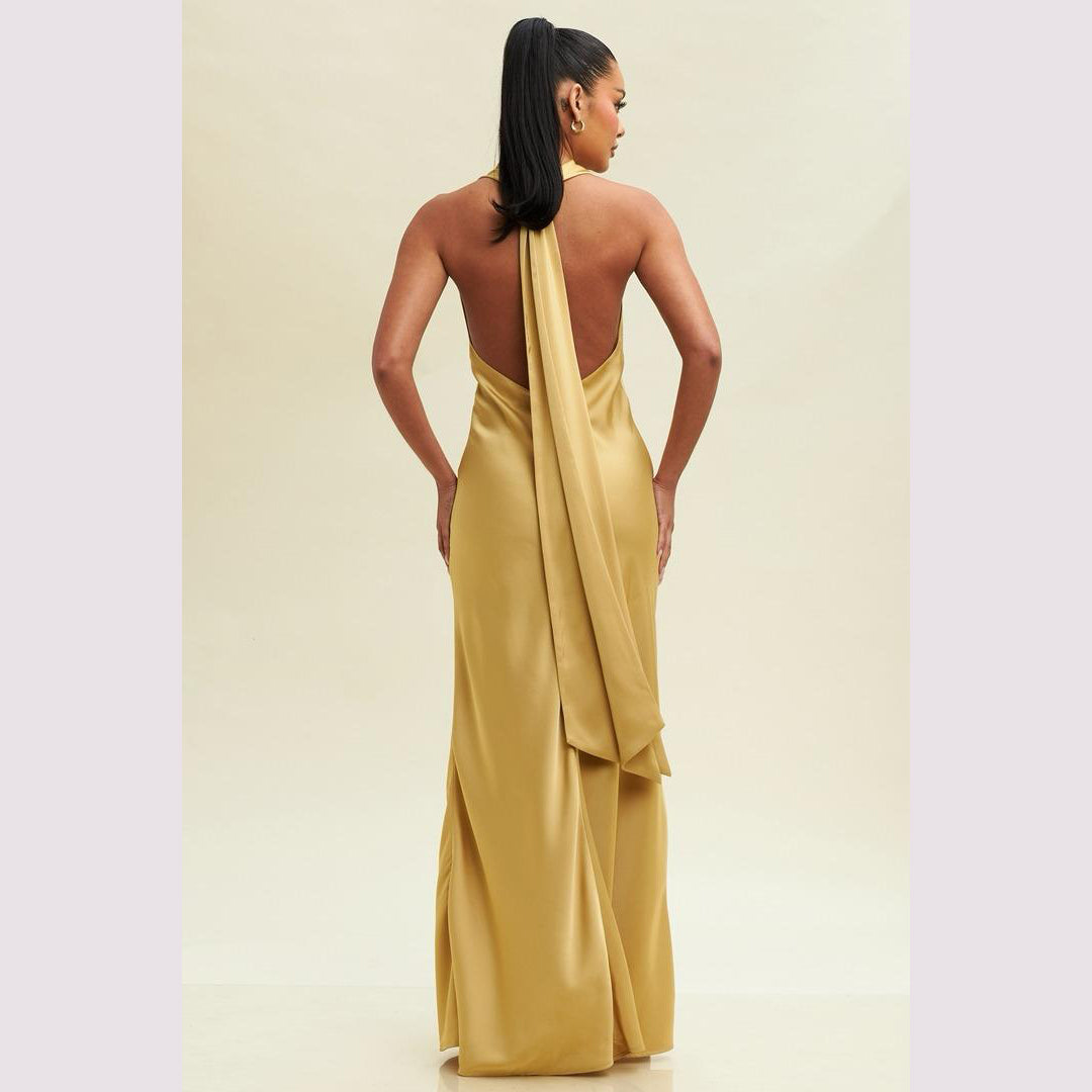Vestido largo corte sirena con cuello de ojal que se amarra al cuello, es recomendado para cuerpos tipo Reloj de Arena y Pera.