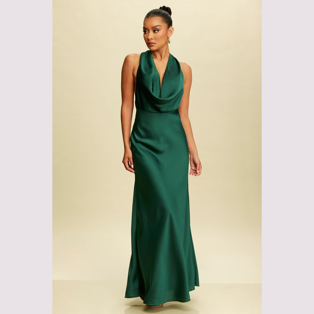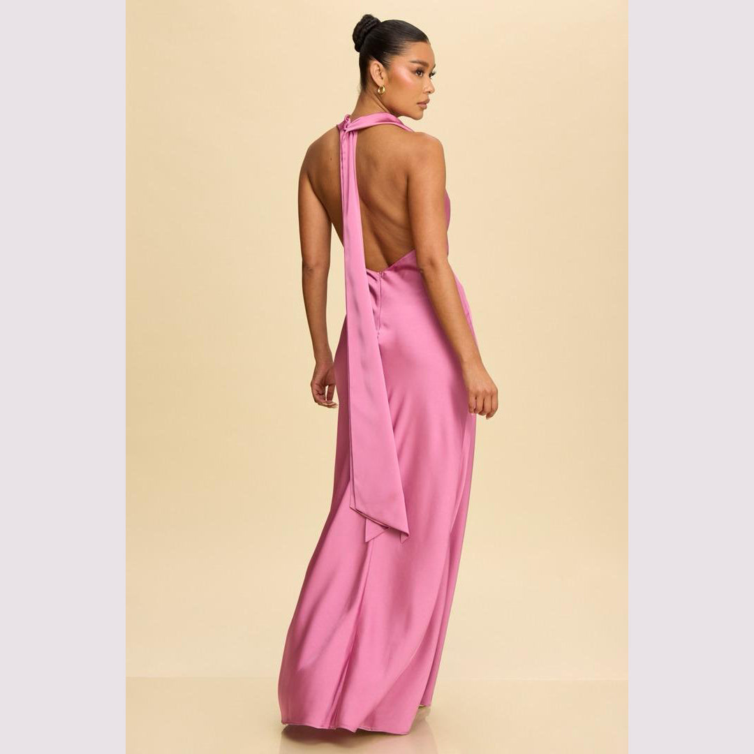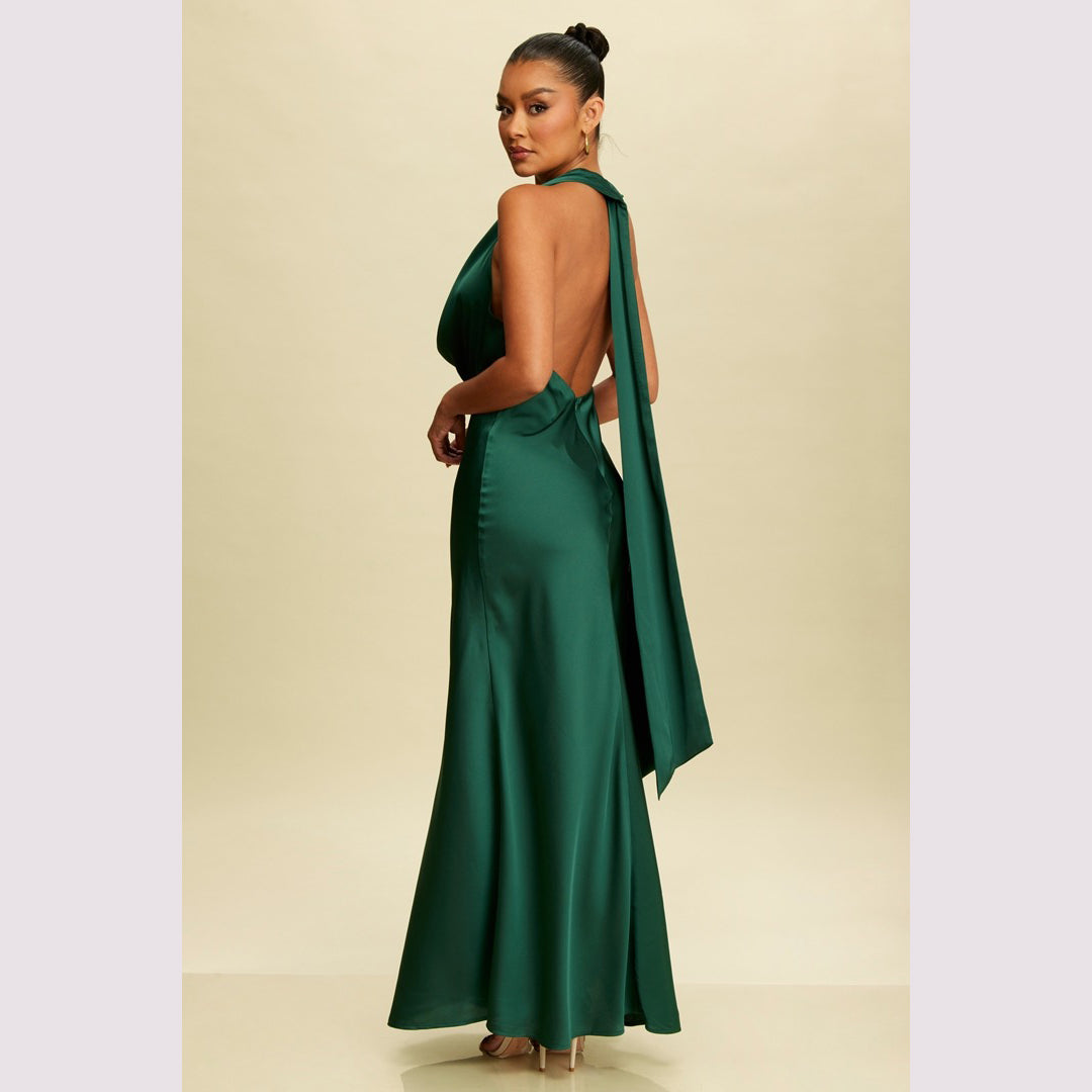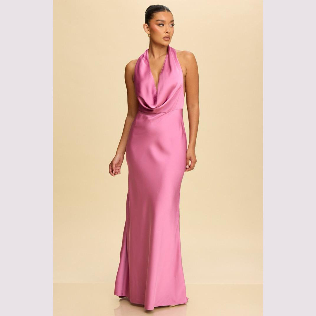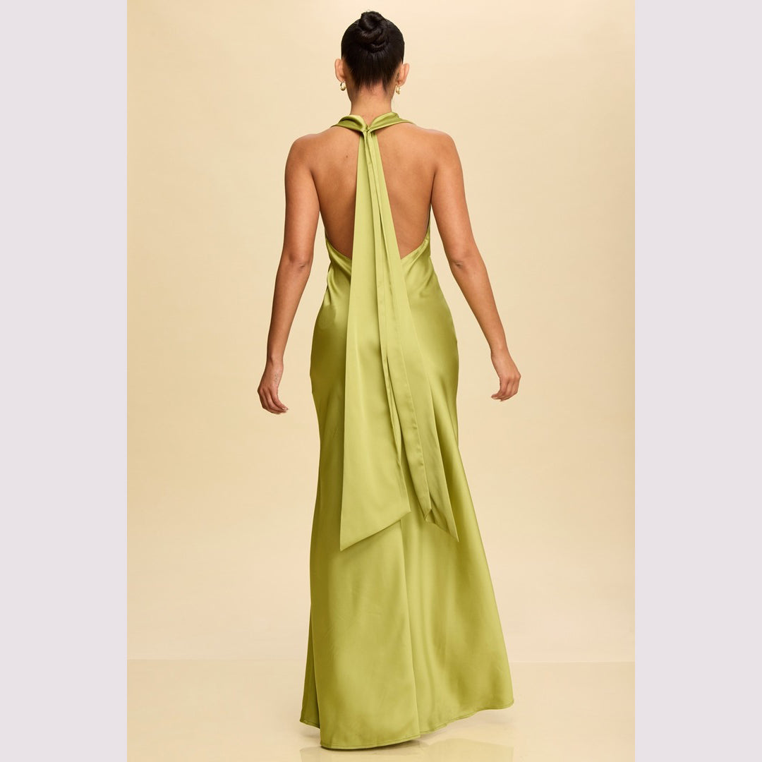 Vestido largo corte sirena con cuello de ojal que se amarra al cuello, es recomendado para cuerpos tipo Reloj de Arena y Pera.