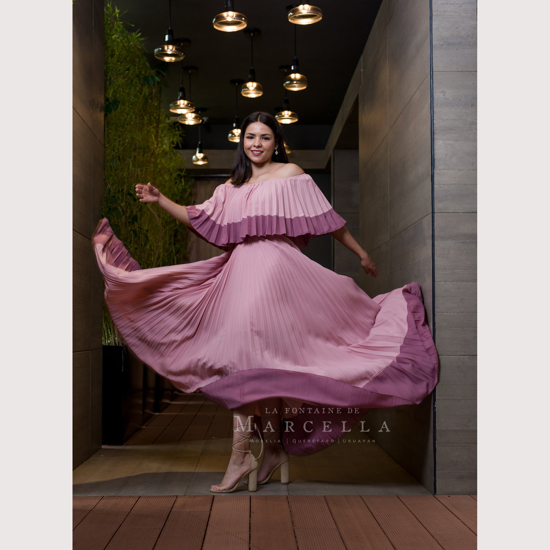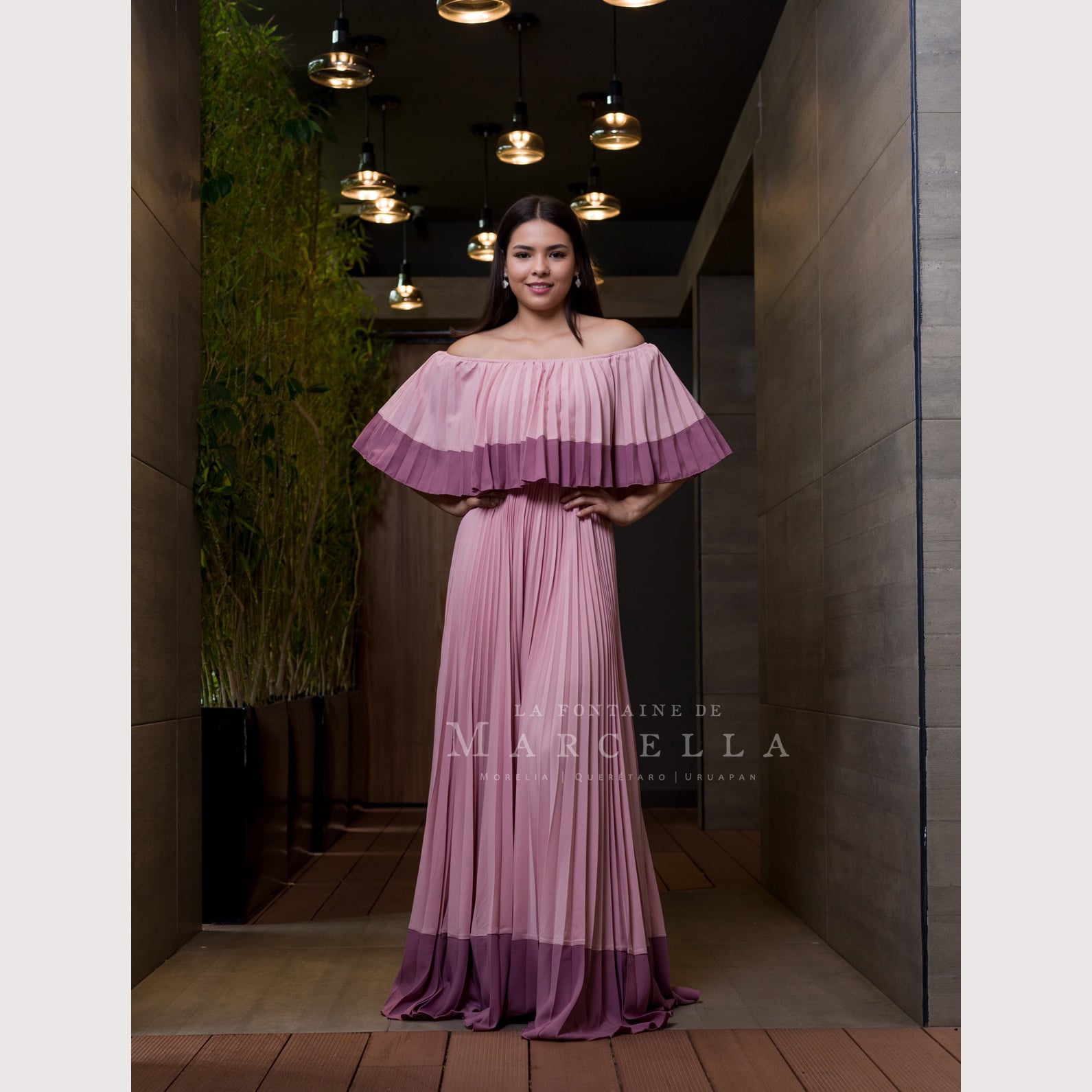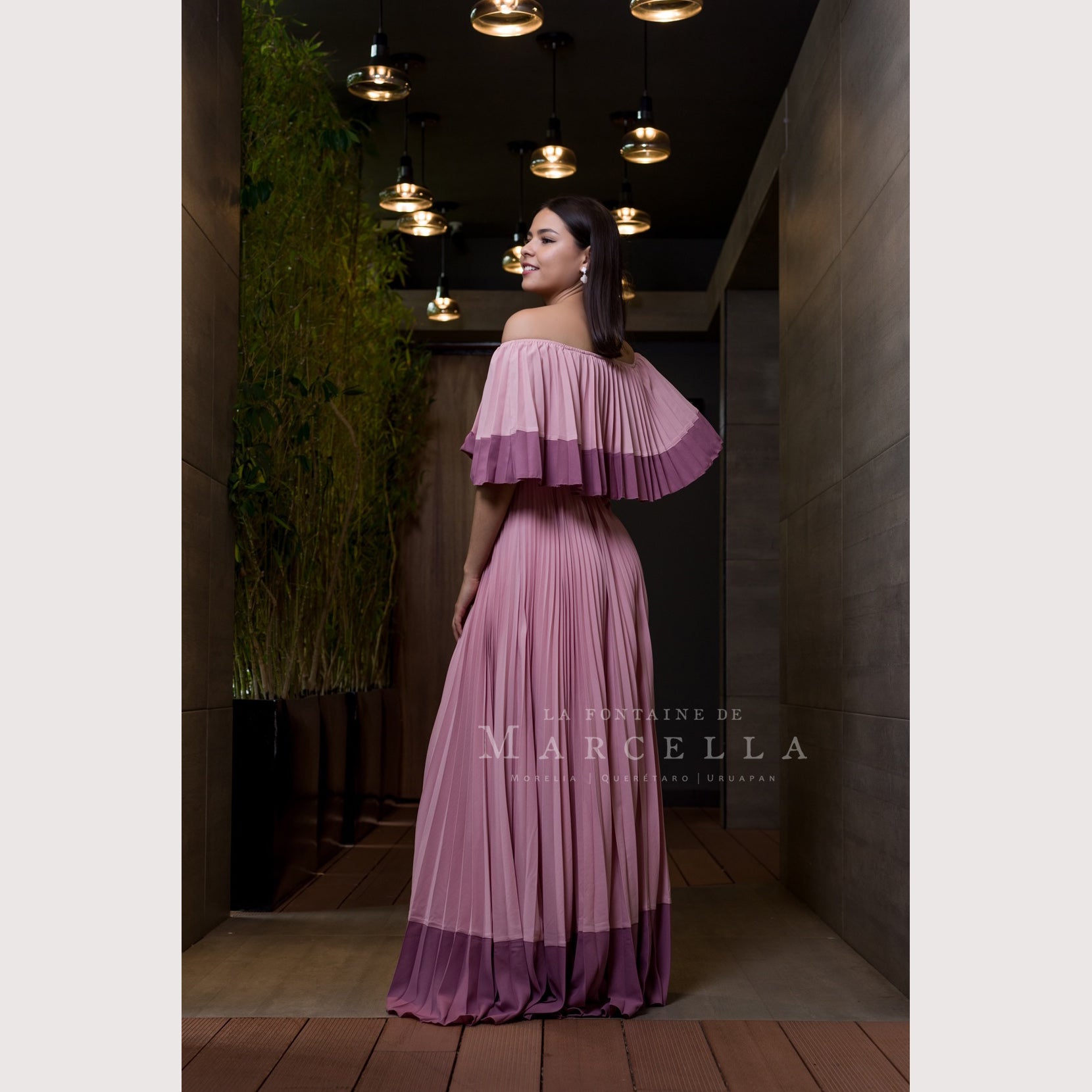 Vestido largo de manga al hombro, tablones delgados y a doble tono de color.