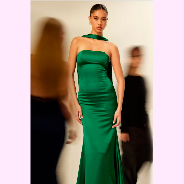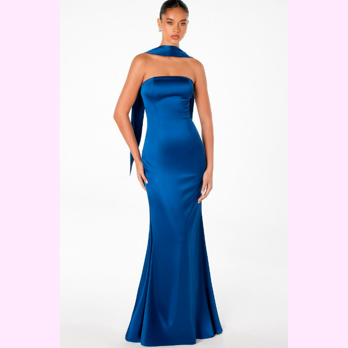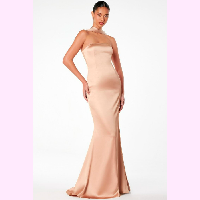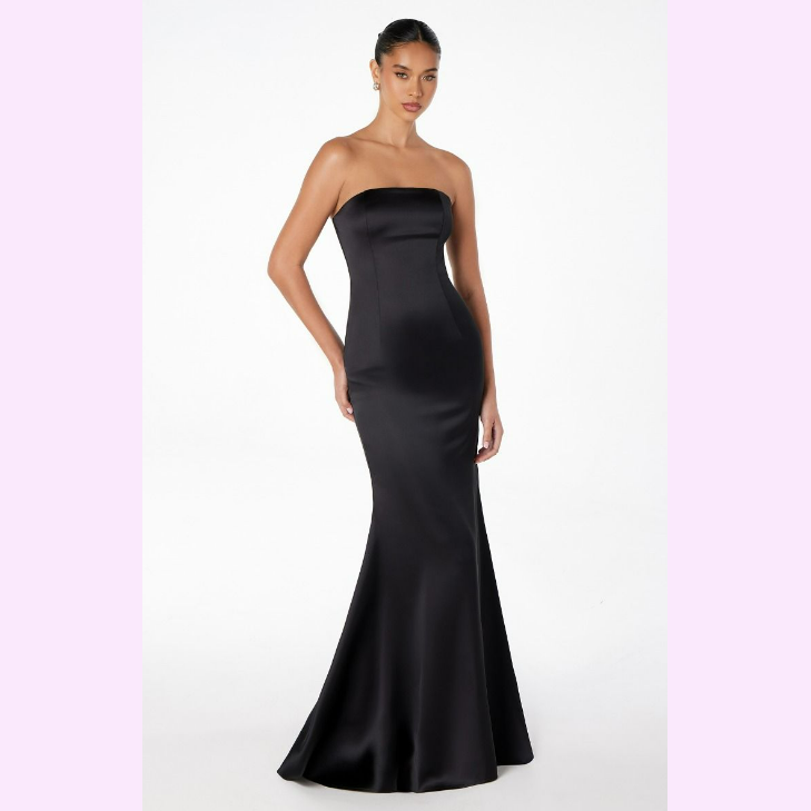 Vestido corte sirena strapless con de tela satinada, es recomendado para cuerpos tipo Reloj de Arena y Pera.