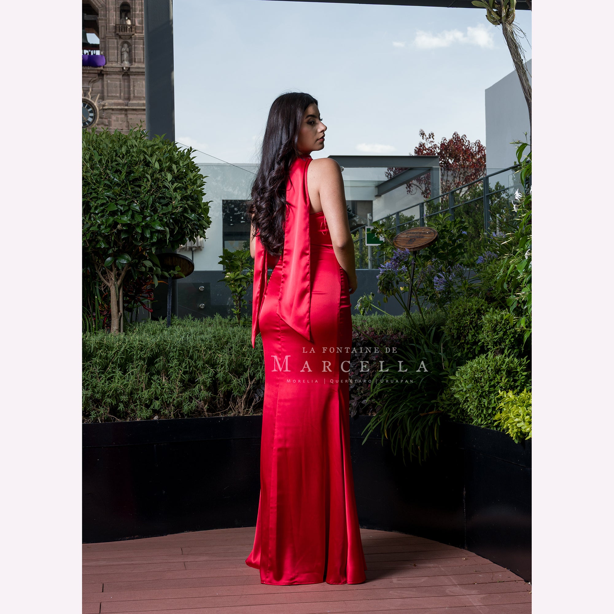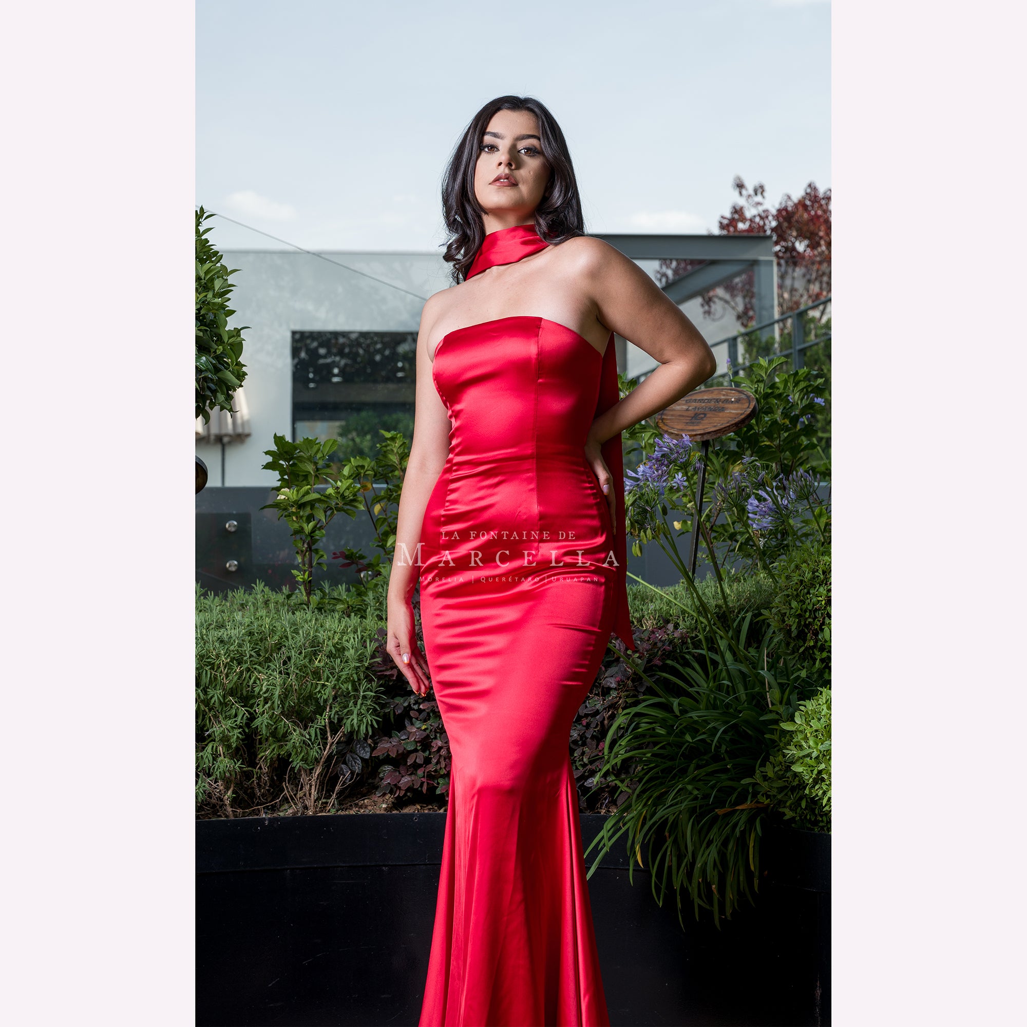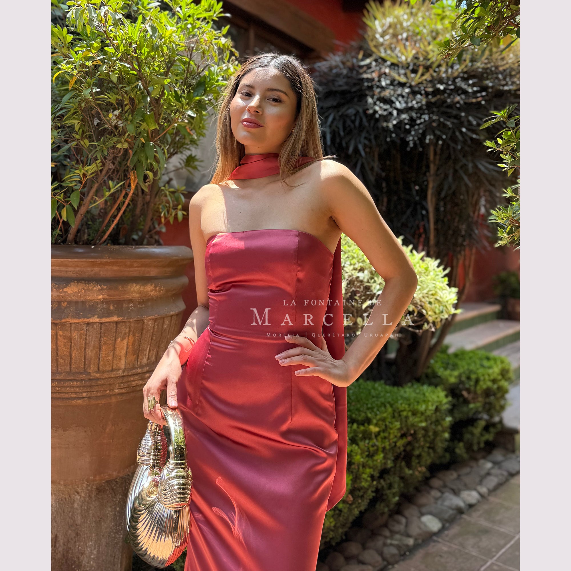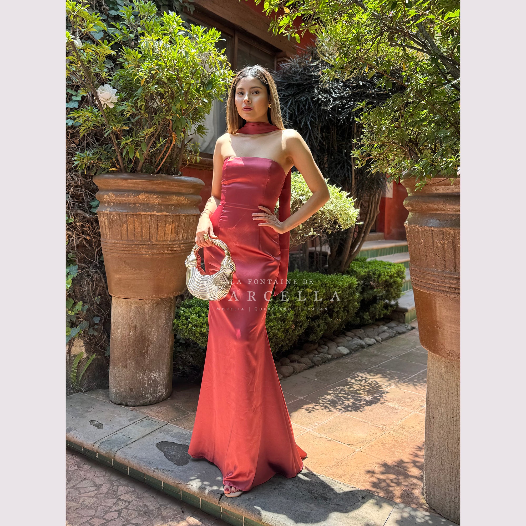Vestido corte sirena strapless con de tela satinada, es recomendado para cuerpos tipo Reloj de Arena y Pera. Incluye cinta para el cuello*Leer más