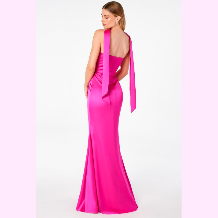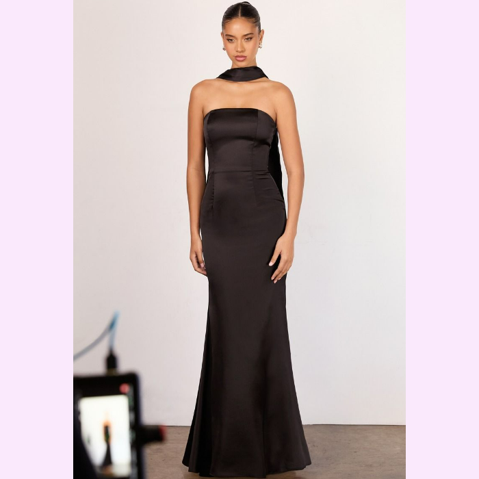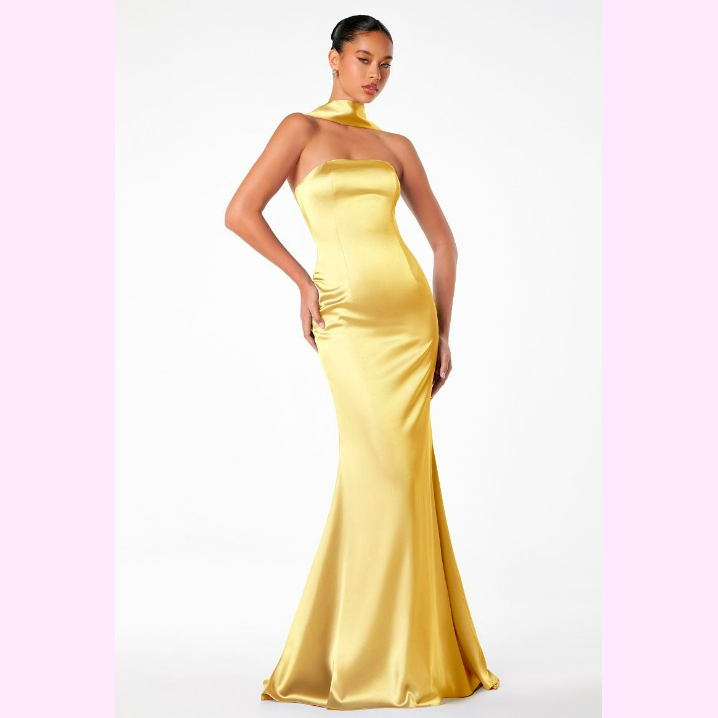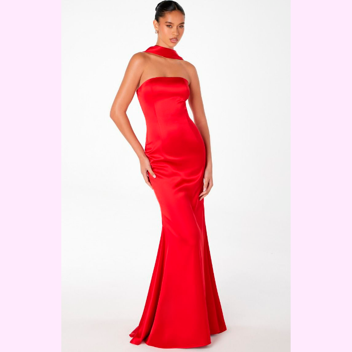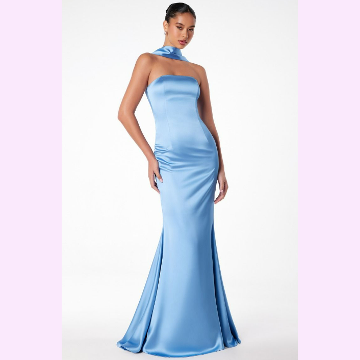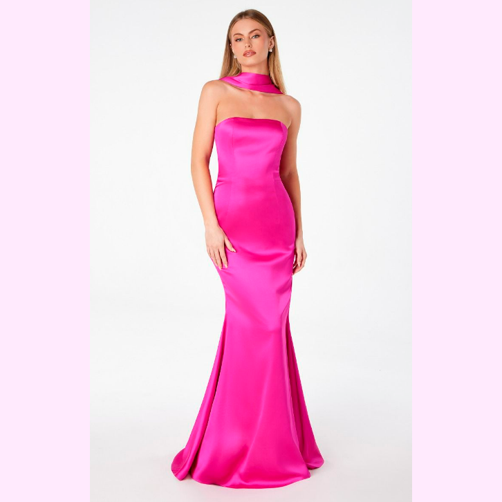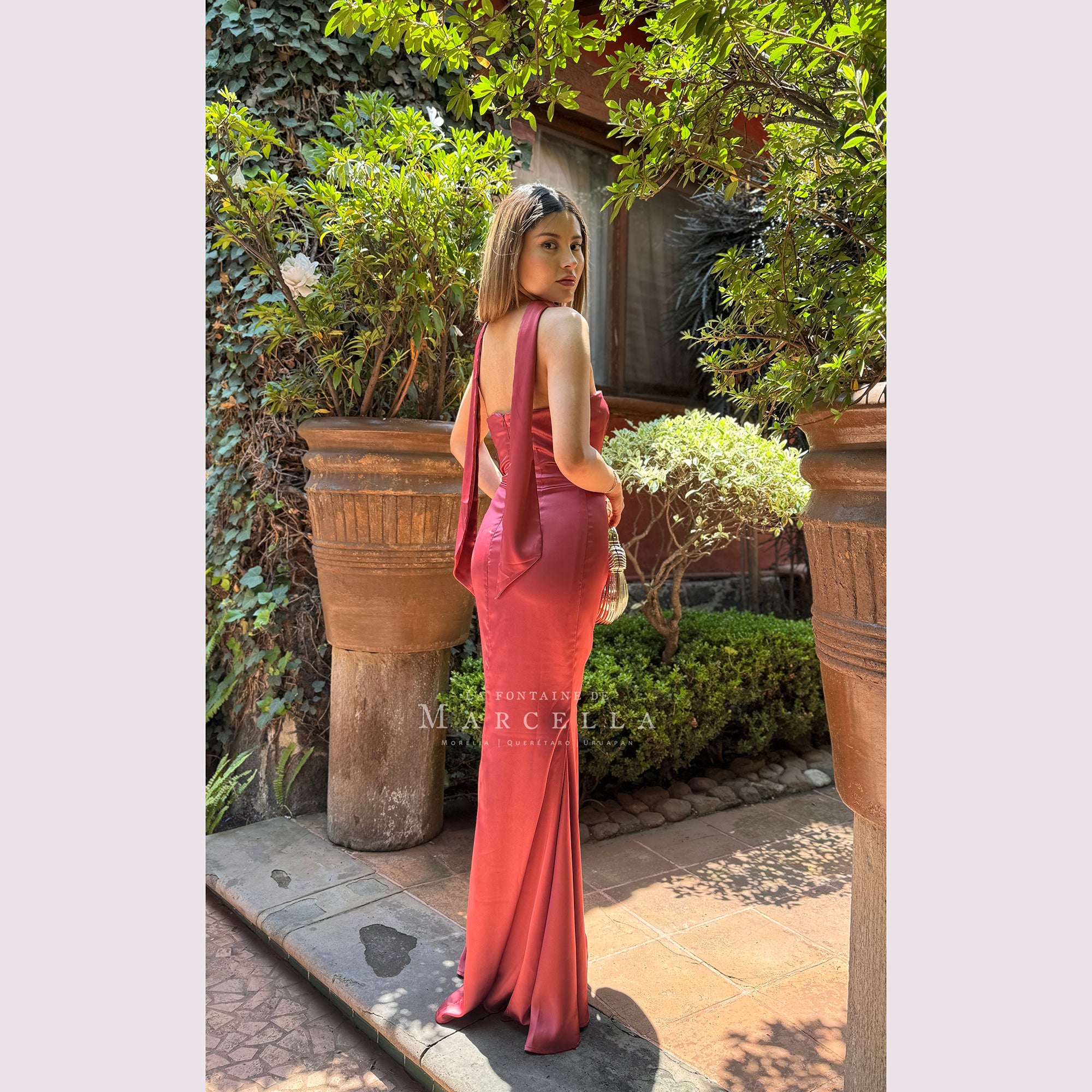 Vestido corte sirena strapless con de tela satinada, es recomendado para cuerpos tipo Reloj de Arena y Pera. Incluye cinta para el cuello*Leer más