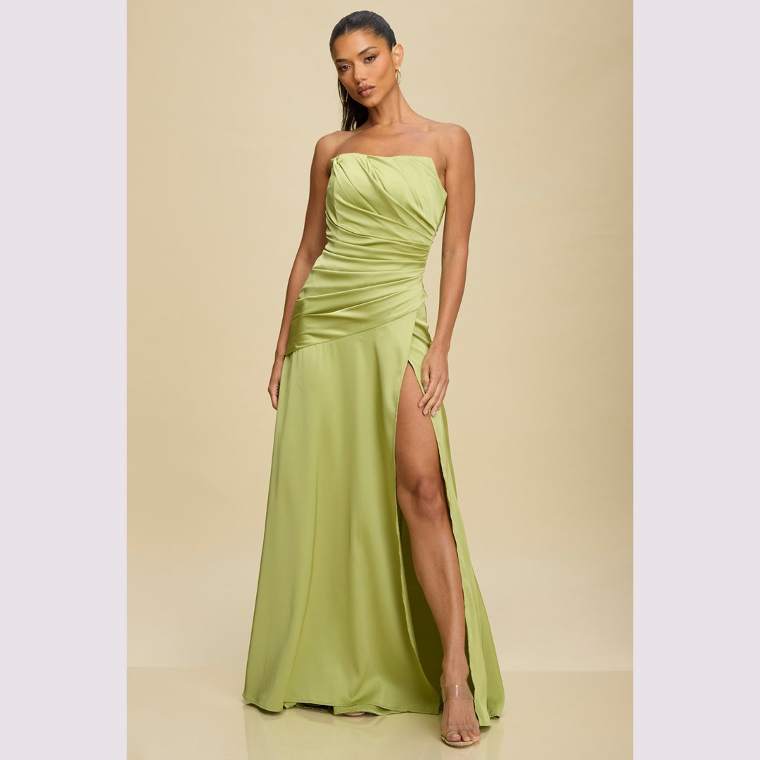 Vestido largo corte en A con abertura en la pierna y pliegues en la parte superior, es recomendado para cuerpos tipo Reloj de Arena y Triangulo Invertido.