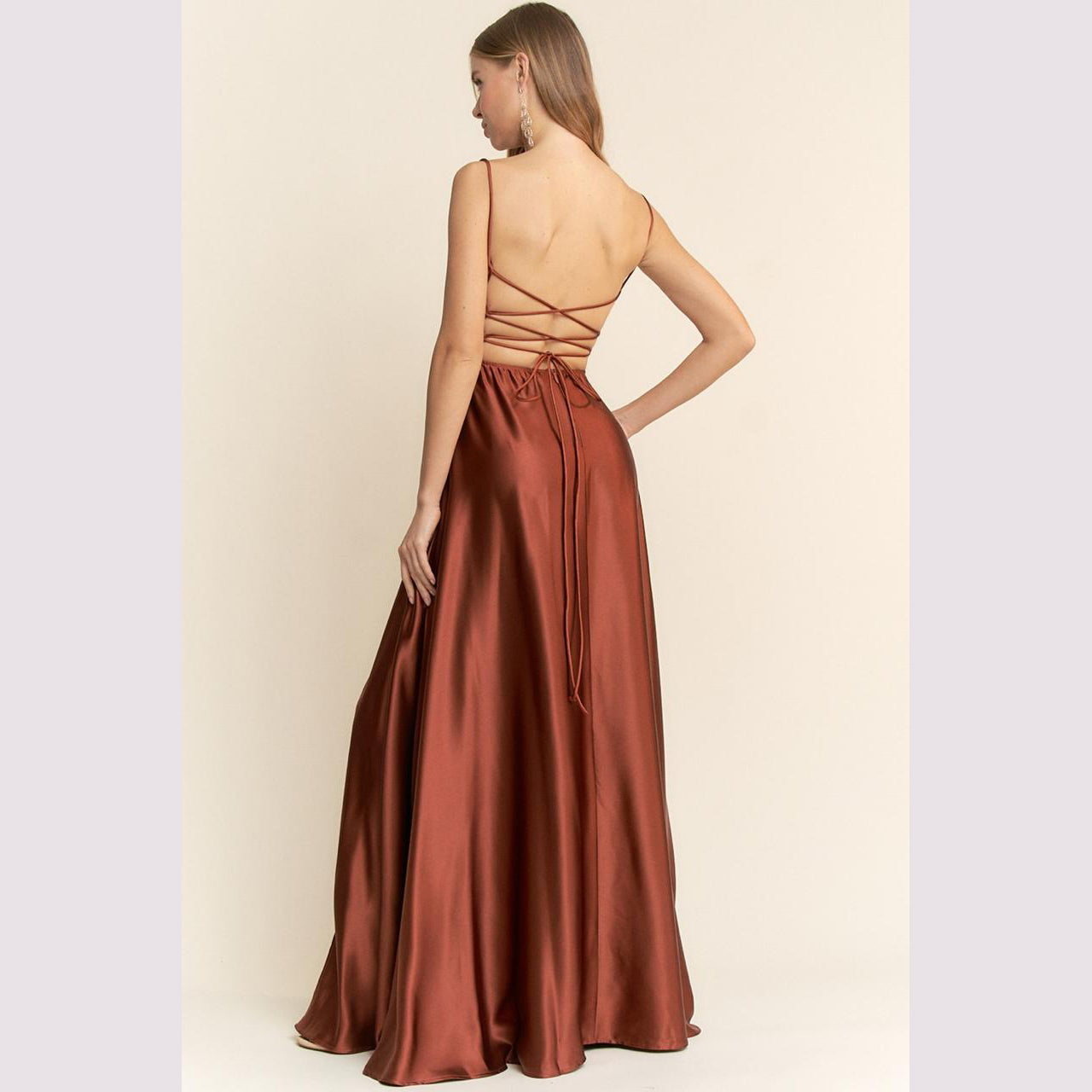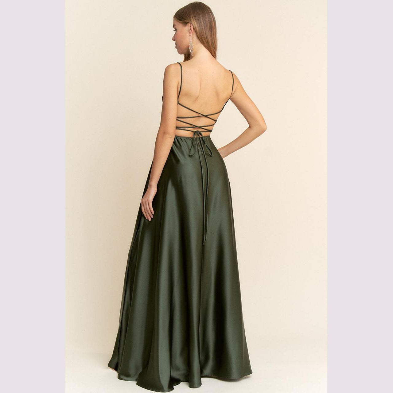 Vestido corte en A con espalda semi descubierta y escote corazón.