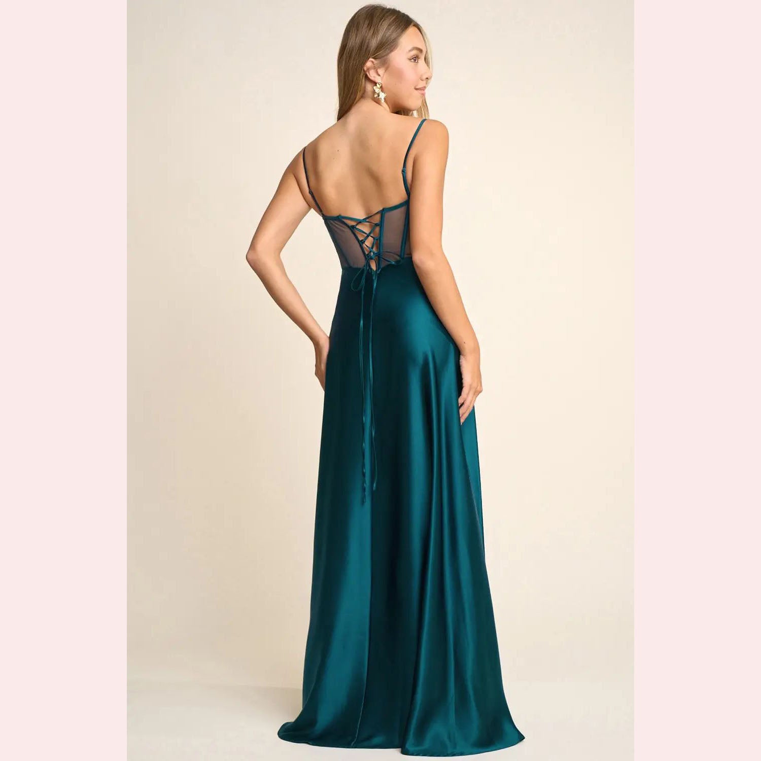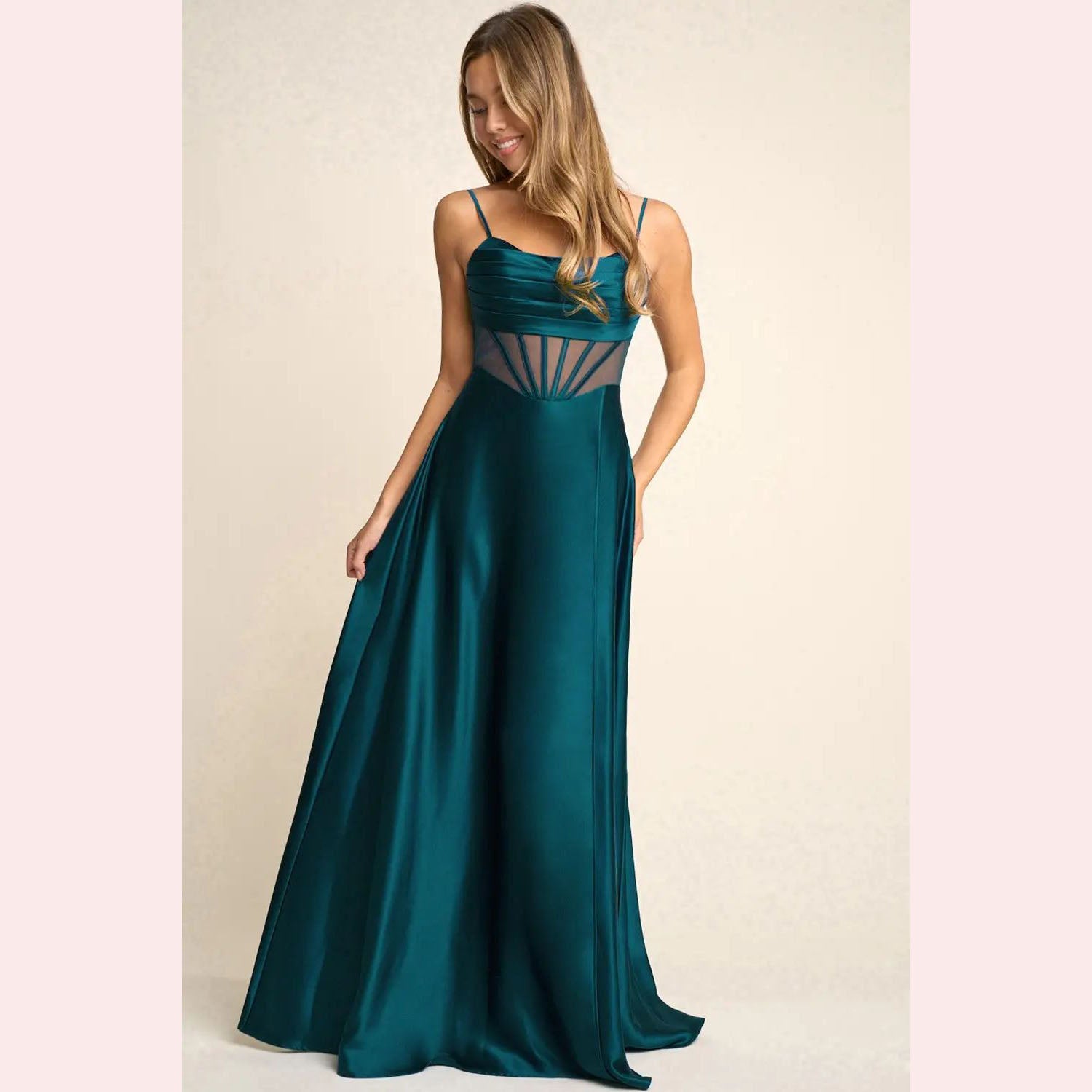 Vestido largo con varilla y transparencia a modo corsé, de tela satinada y tirante delgado es recomendado para los cuerpos tipo Reloj de Arena y Rectángulo.