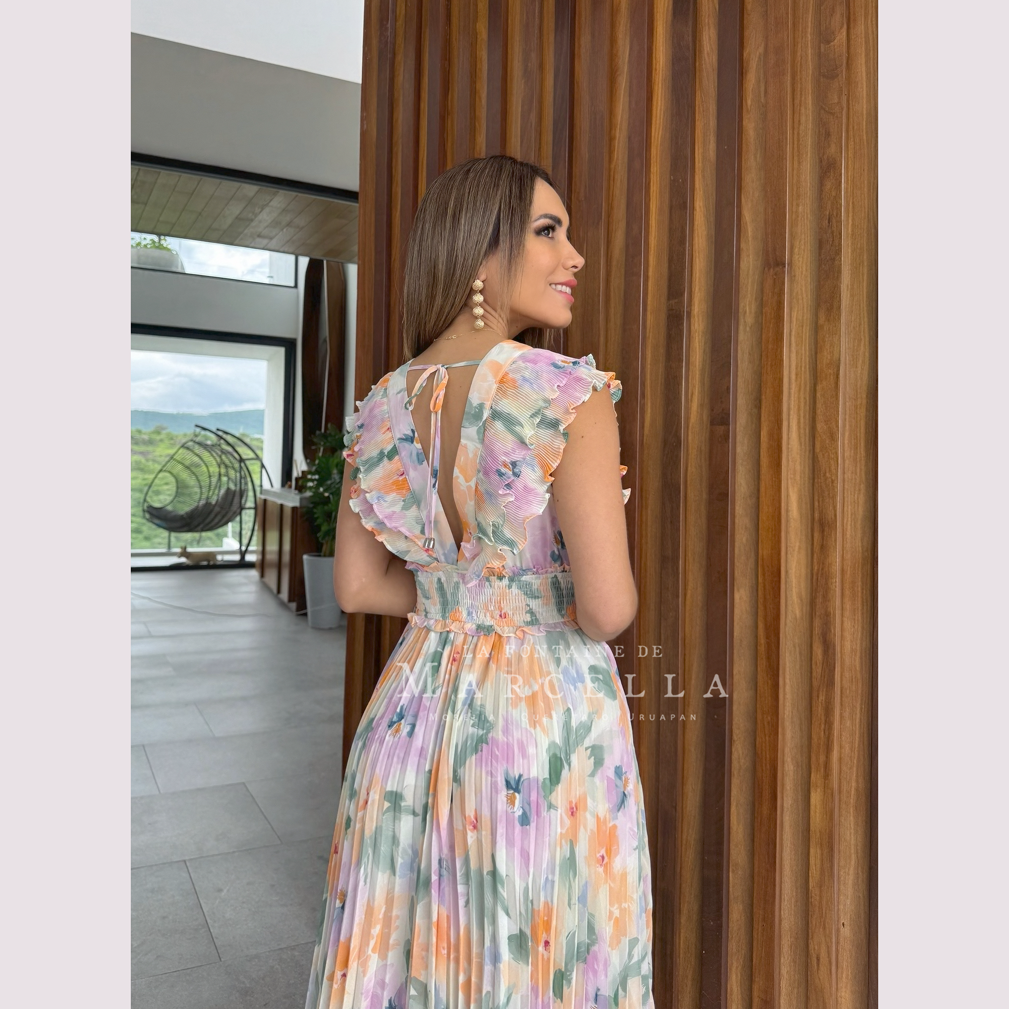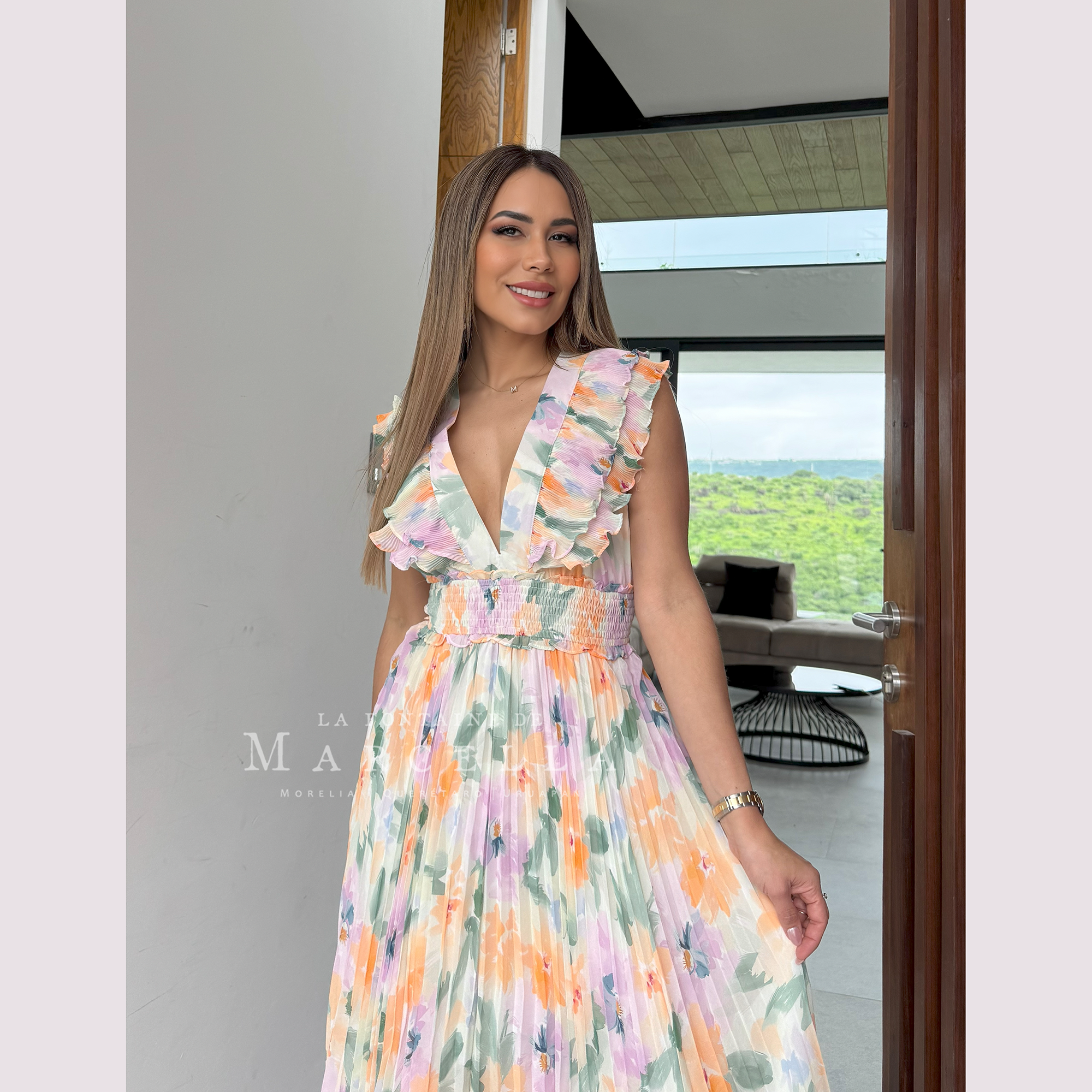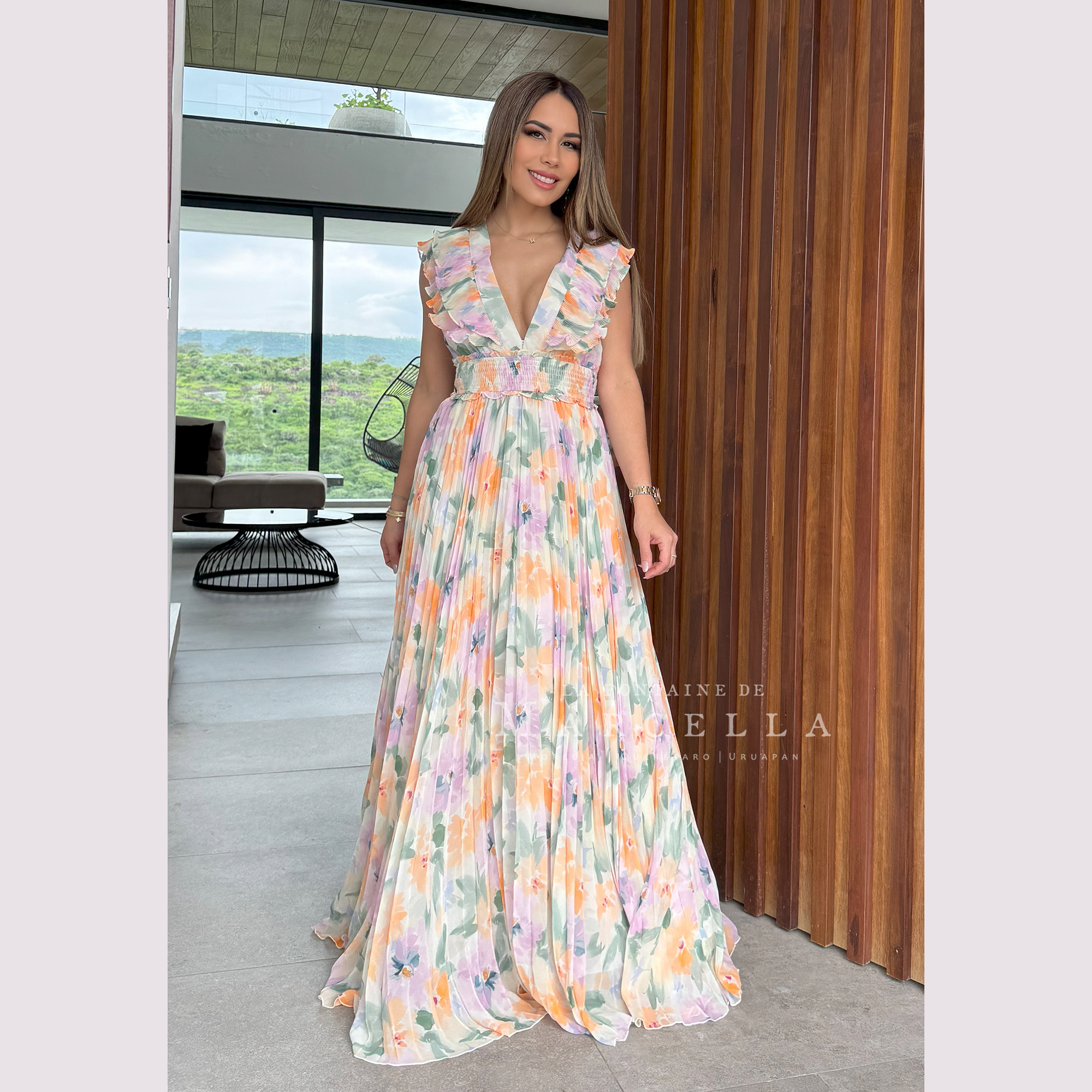 Vestido largo corte en A con olan en los hombros y escote en V.Leer más