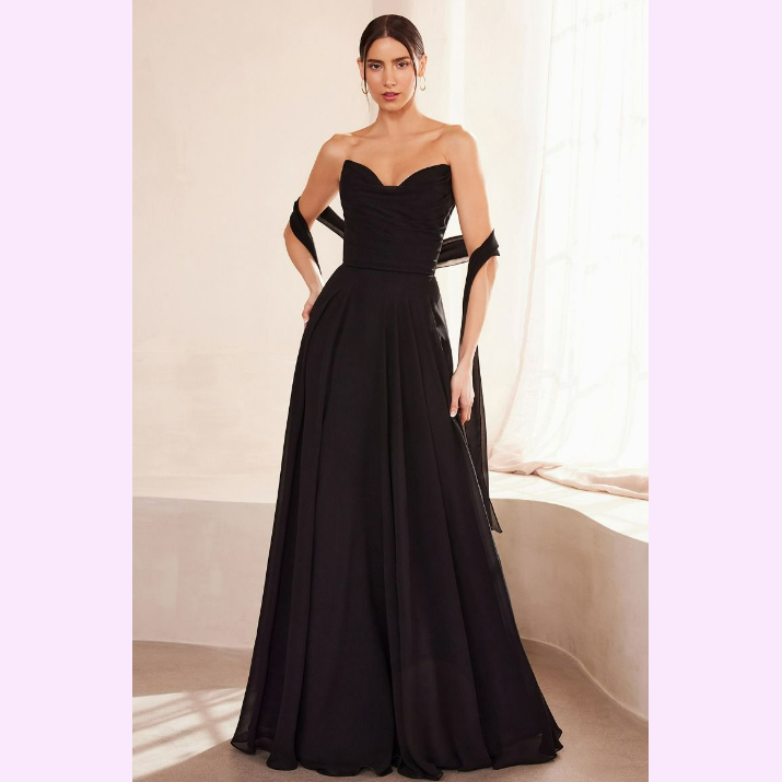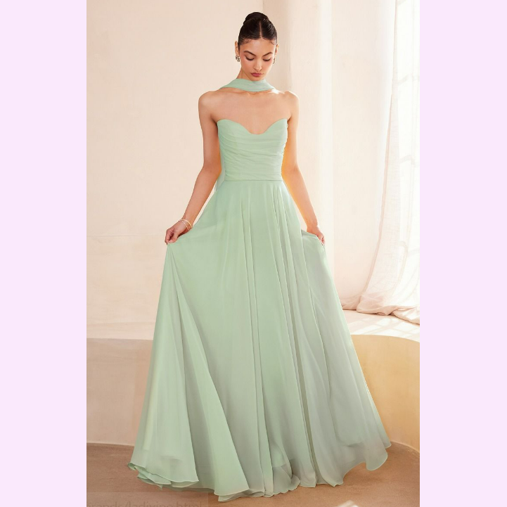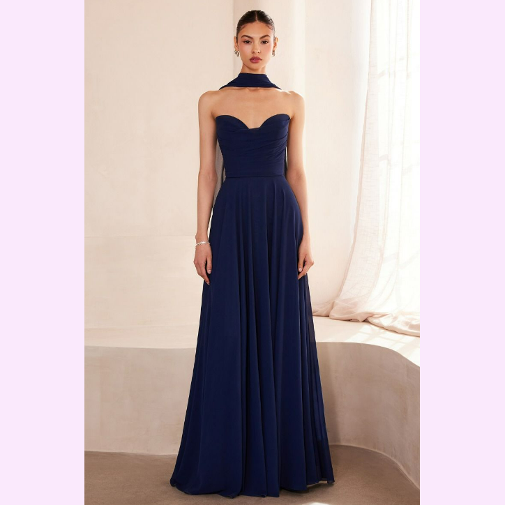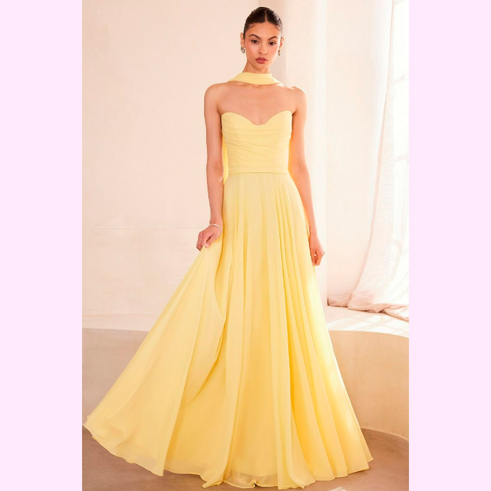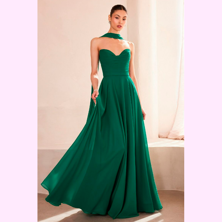Vestido corte en A con corsé y escote de corazón, incluye pashmina, es recomendado para cuerpos tipo Rectángulo y Pera.