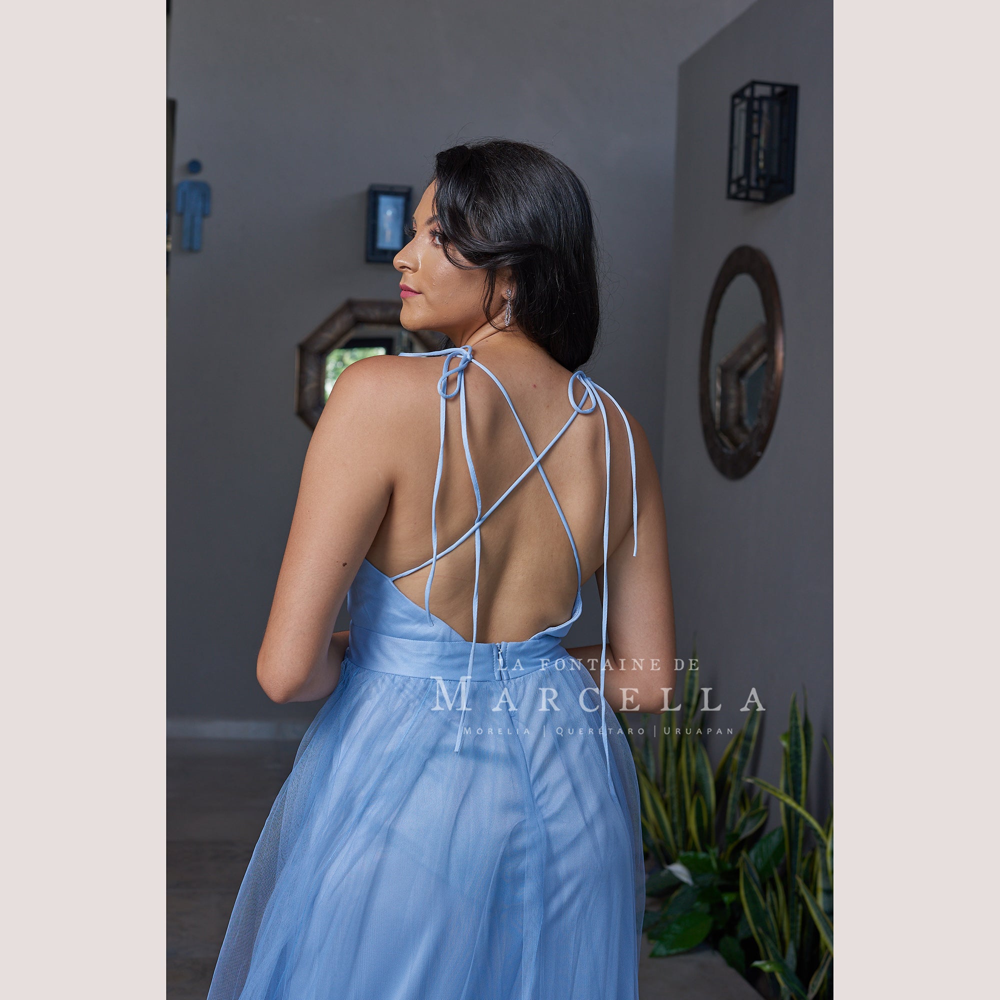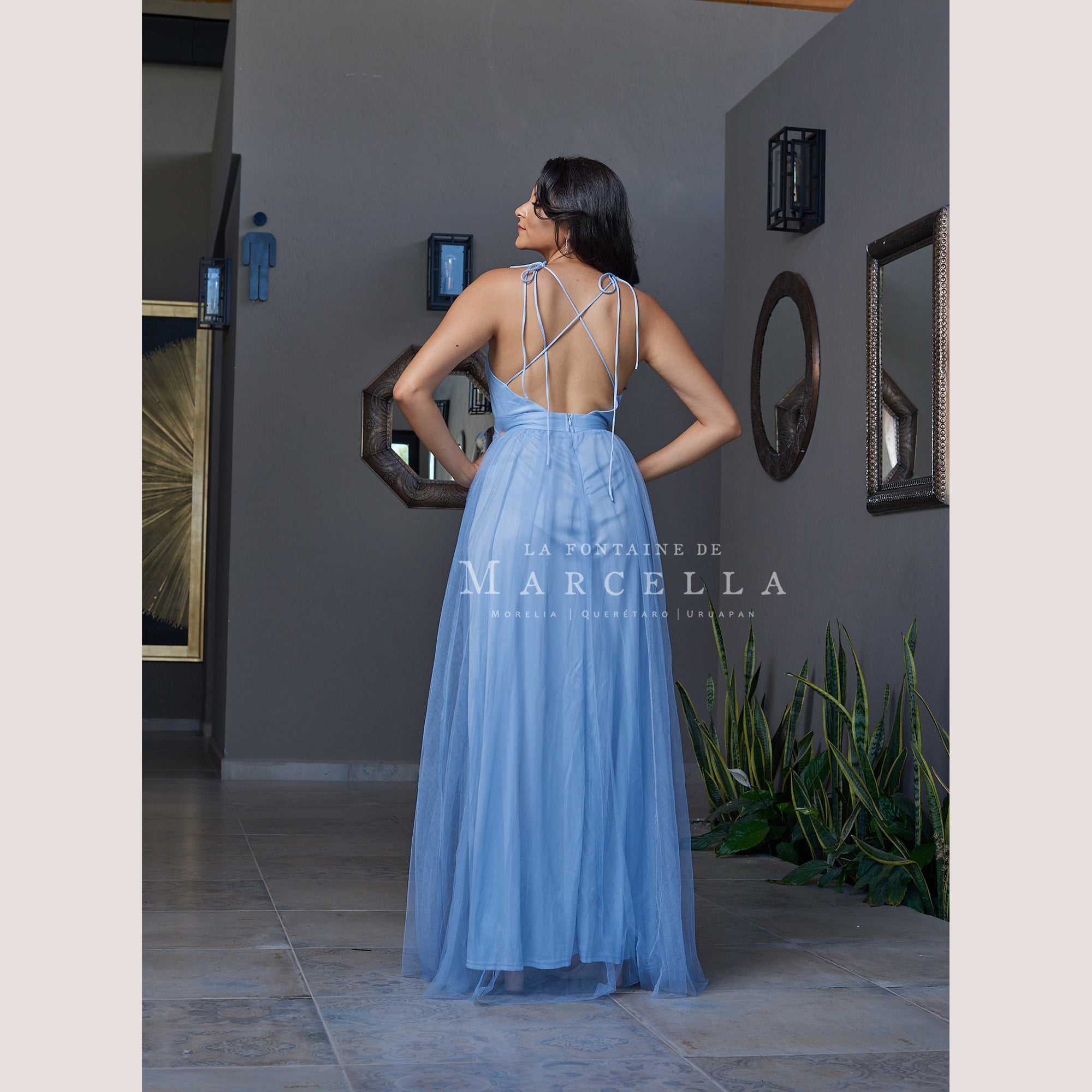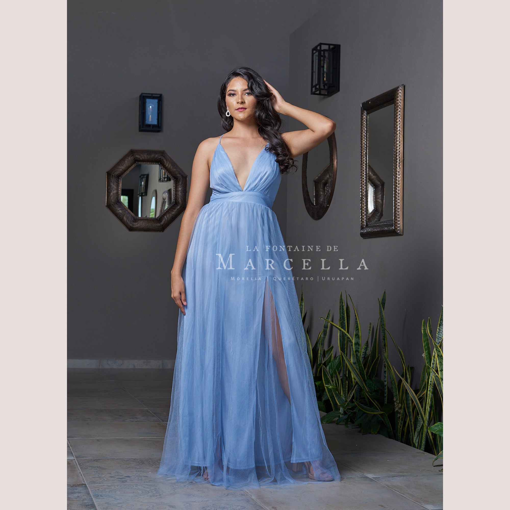 Vestido de tul ligero con escote en V y doble abertura a las piernas, recomendado para cuerpos tipo Reloj de Arena y Pera.