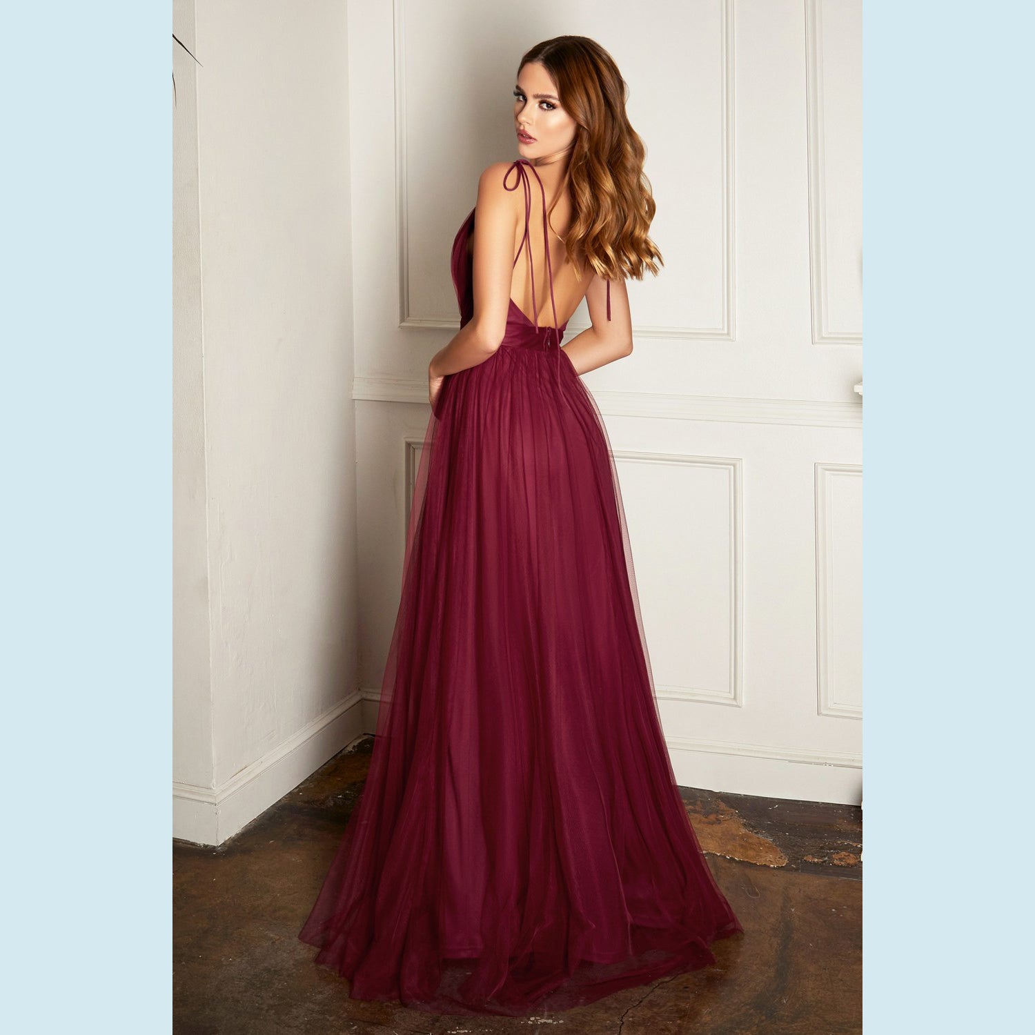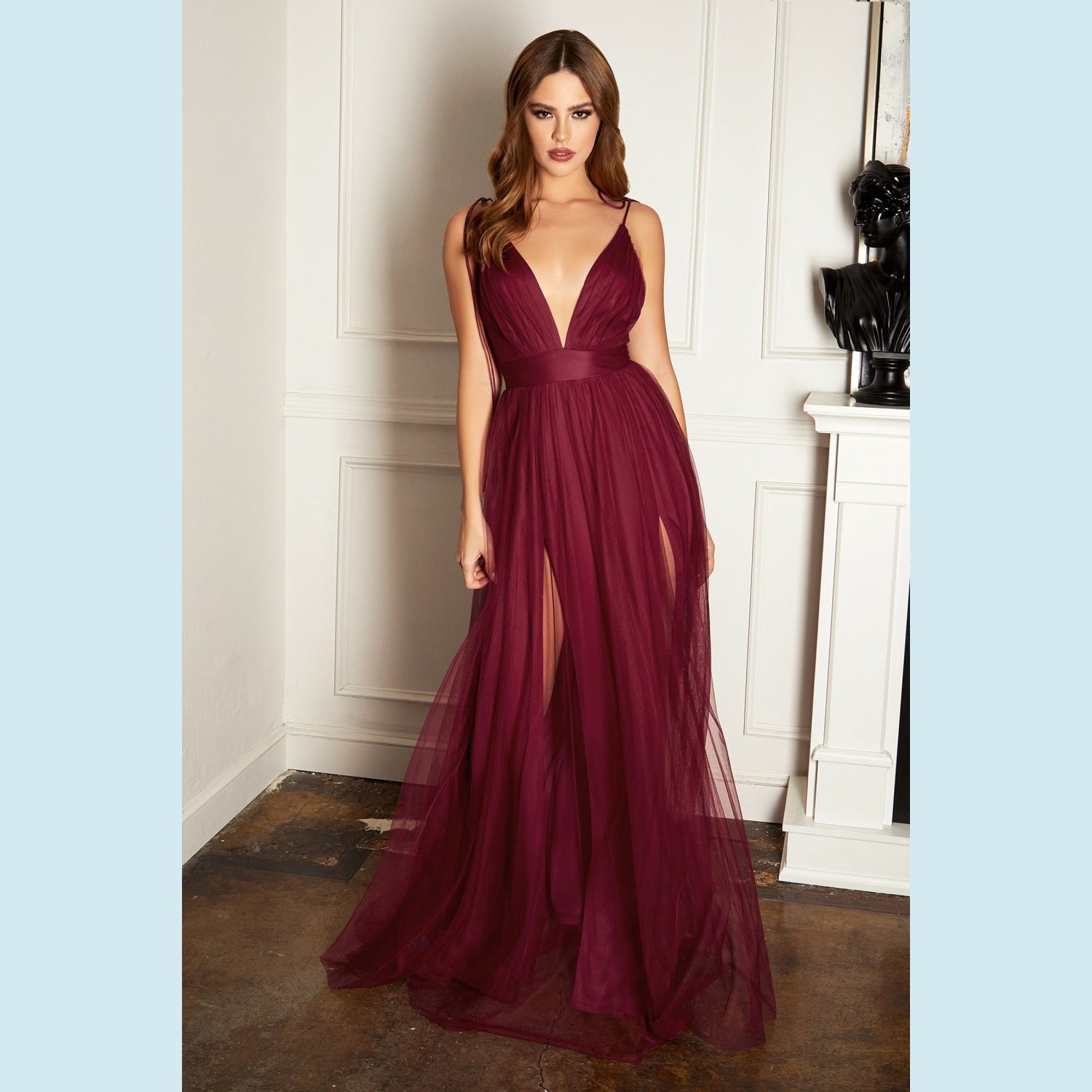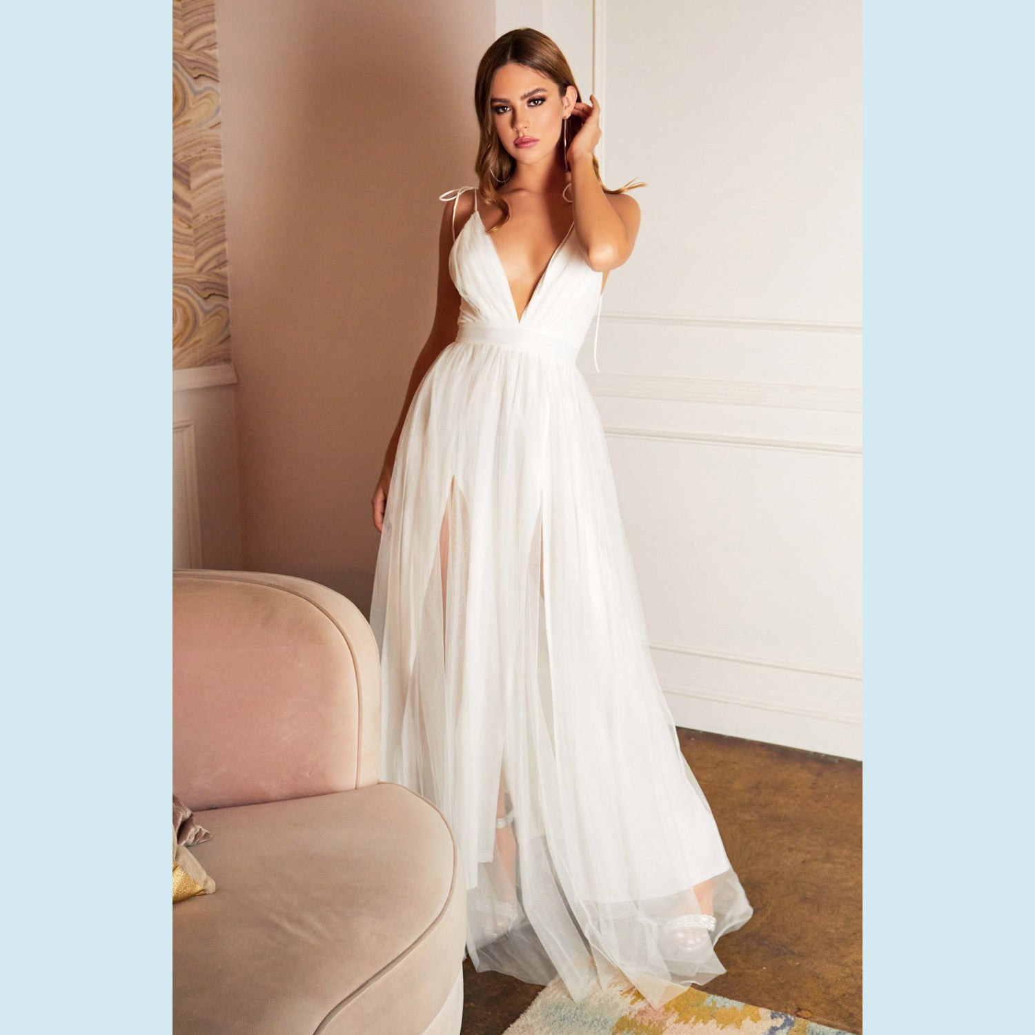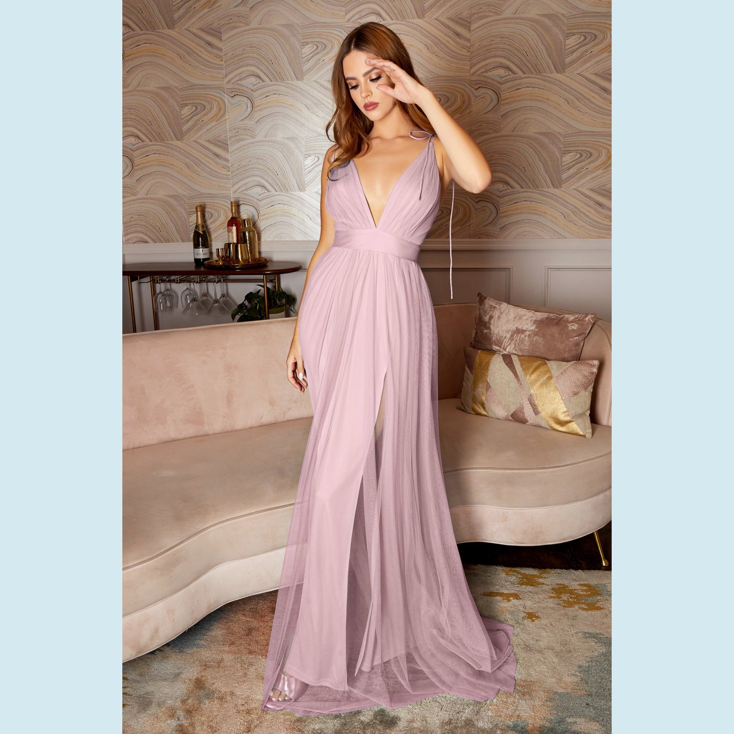 Vestido de tul ligero con escote en V y doble abertura a las piernas, recomendado para cuerpos tipo Reloj de Arena y Pera.