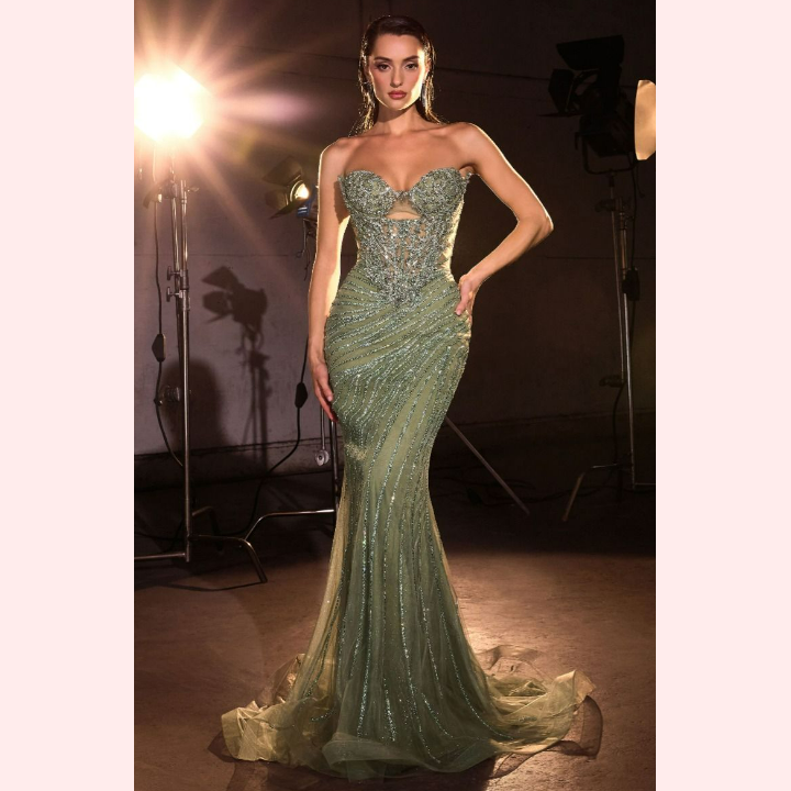 Vestido corte sirena strapless con escote corazón adornado hermosamente con pedrería de Fantasía, es recomendado para cuerpos tipo Reloj de Arena y Pera.