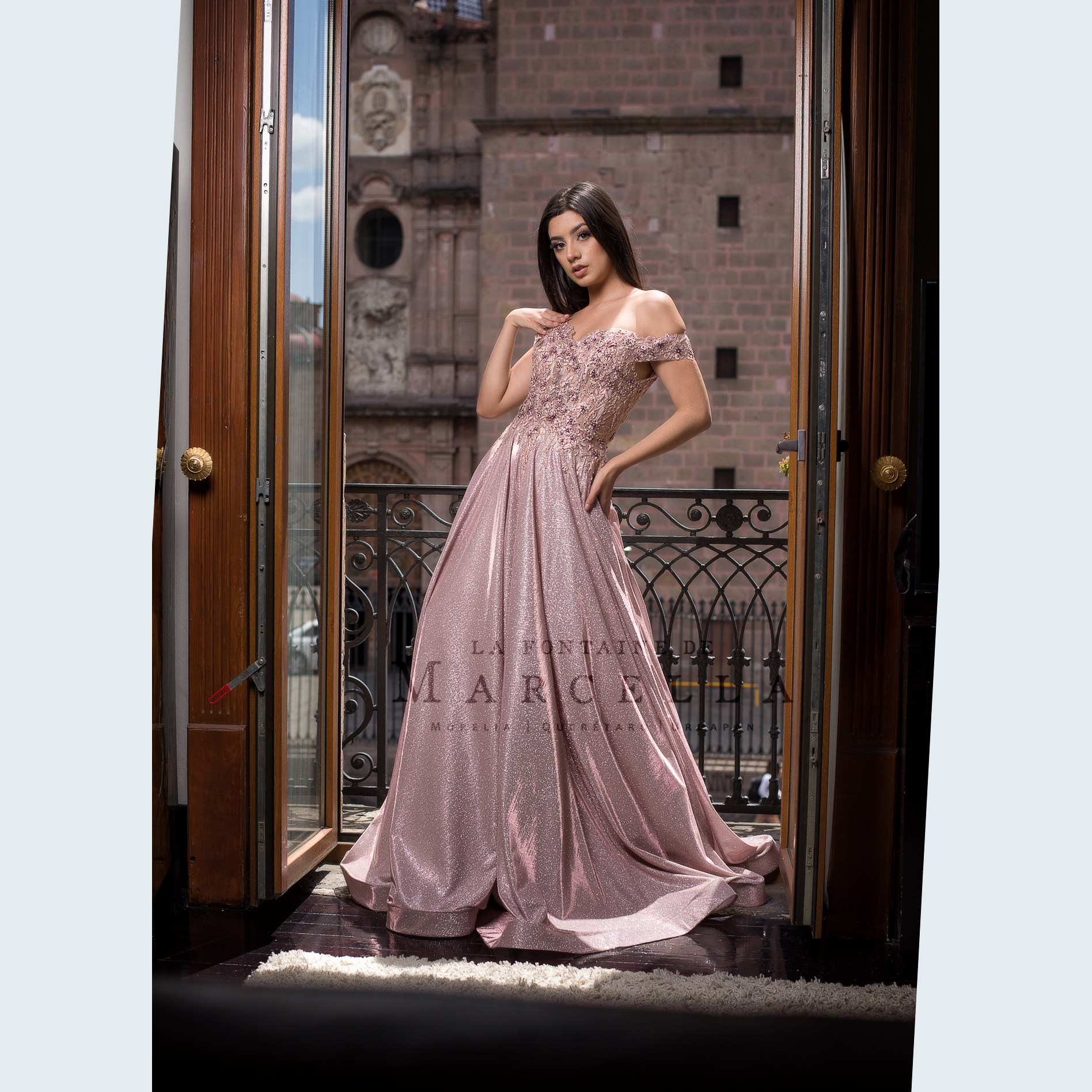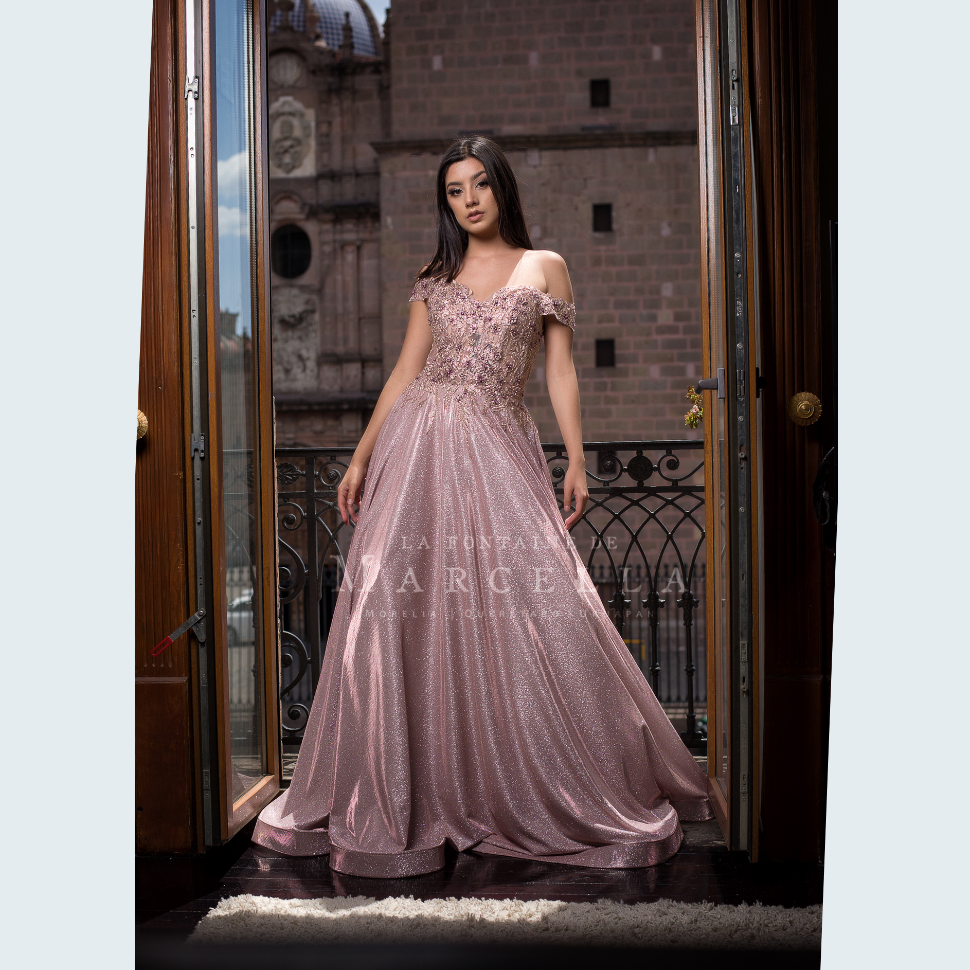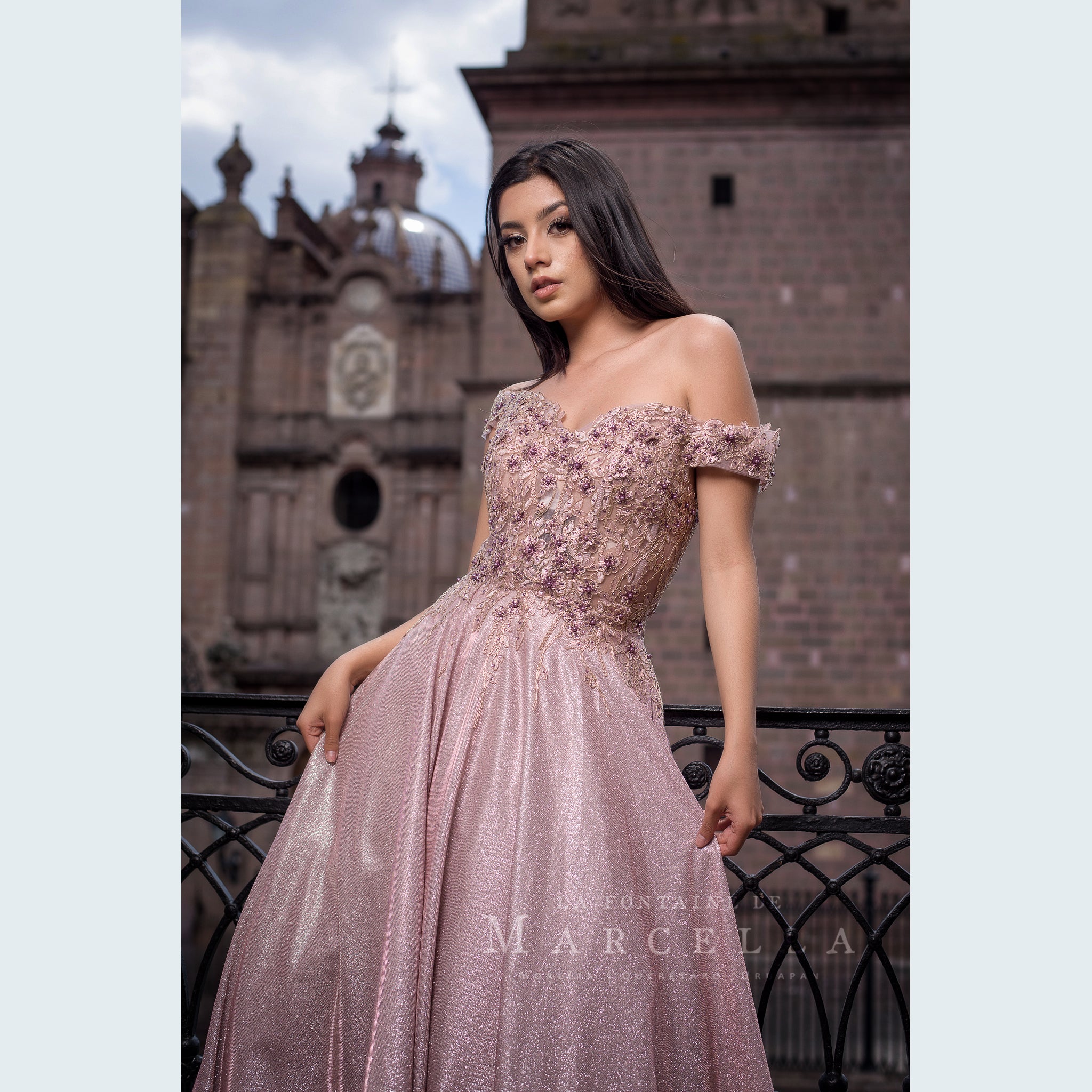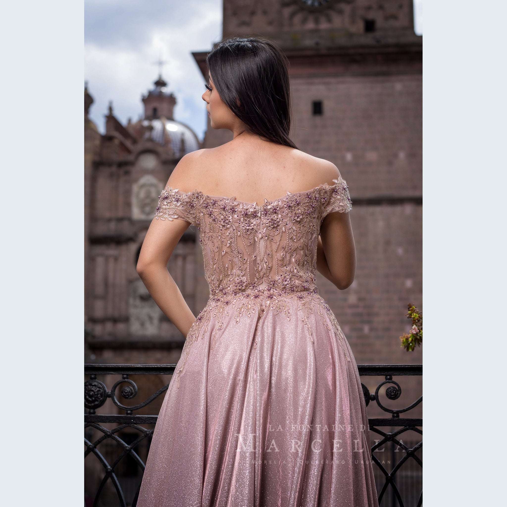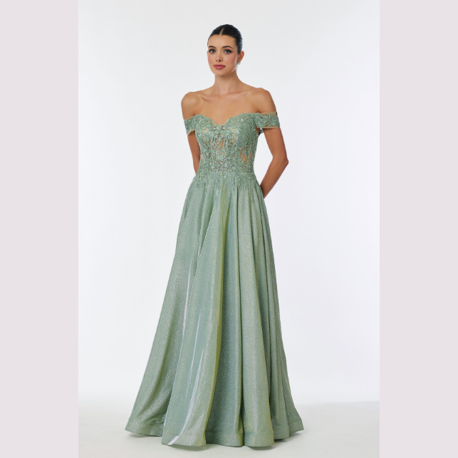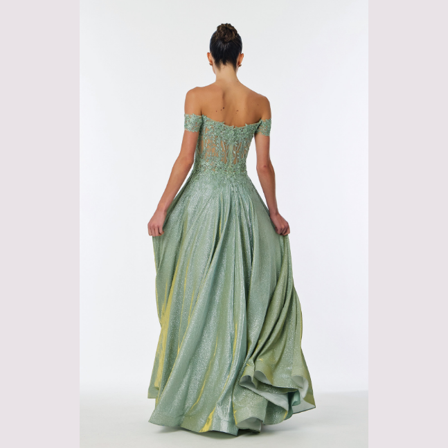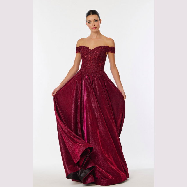 Vestido de corte A con tela brillante y adornado con patrón floral en la parte superior, recomendado para cuerpos tipo Rectángulo y Pera.