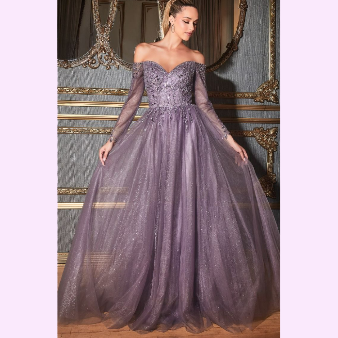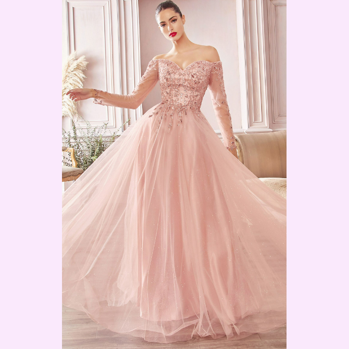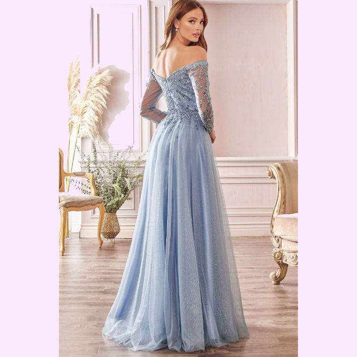 Vestido largo corte en A con manga larga y cuello de ojal, es recomendado para cuerpos tipo Triangulo Invertido y Pera.