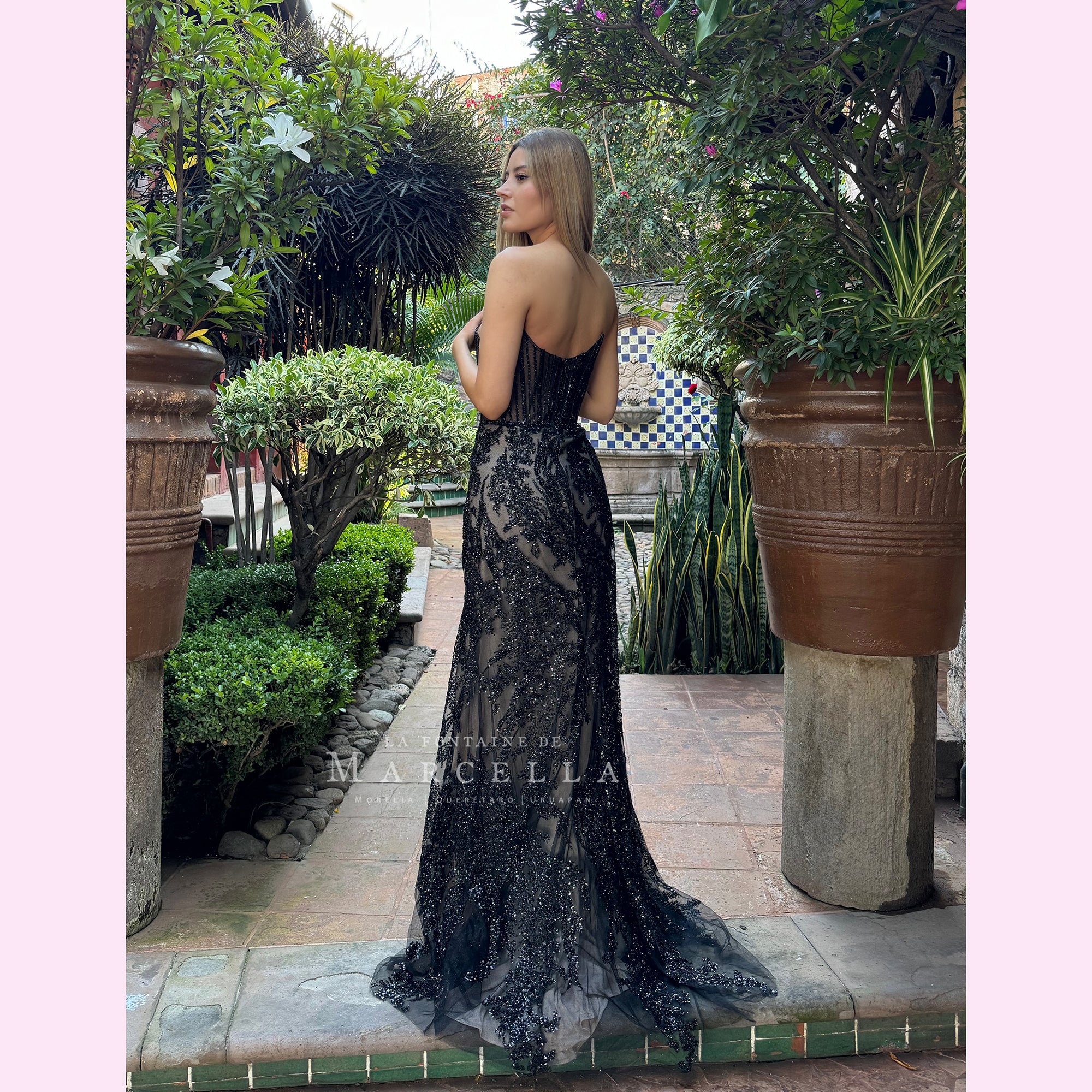 Vestido corte sirena con escote corazón, transparencia en la parte superior y abertura en la pierna, es recomendado para cuerpos tipo Reloj de Arena y Pera.