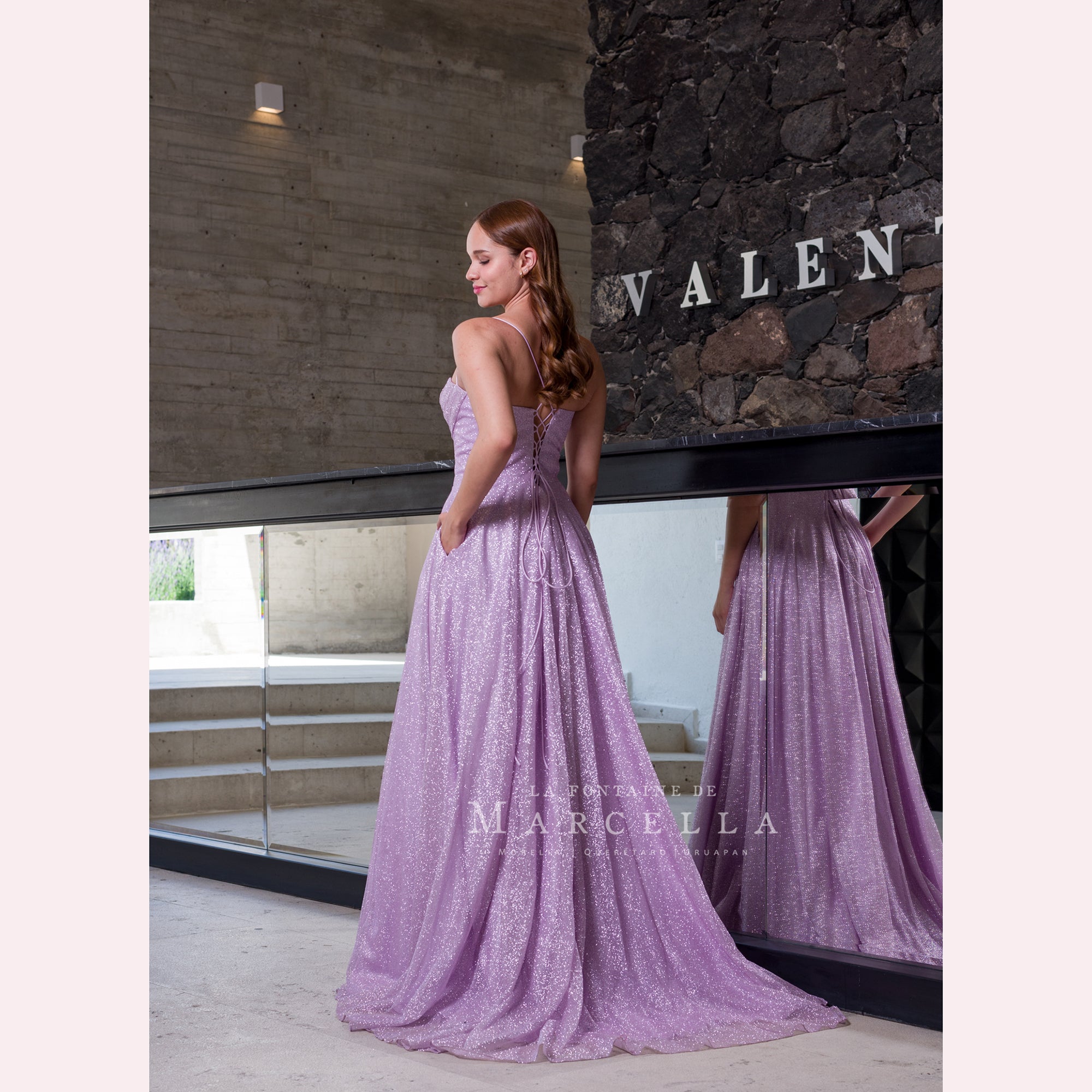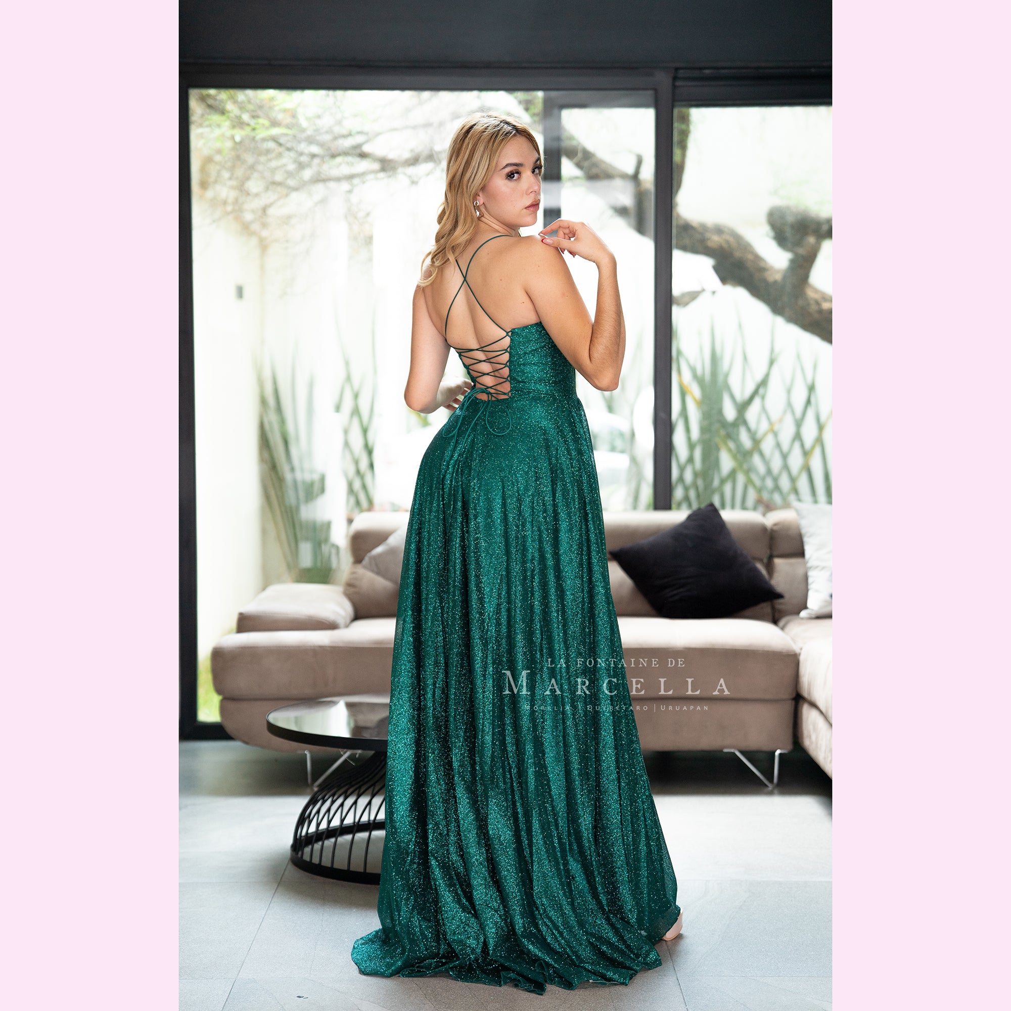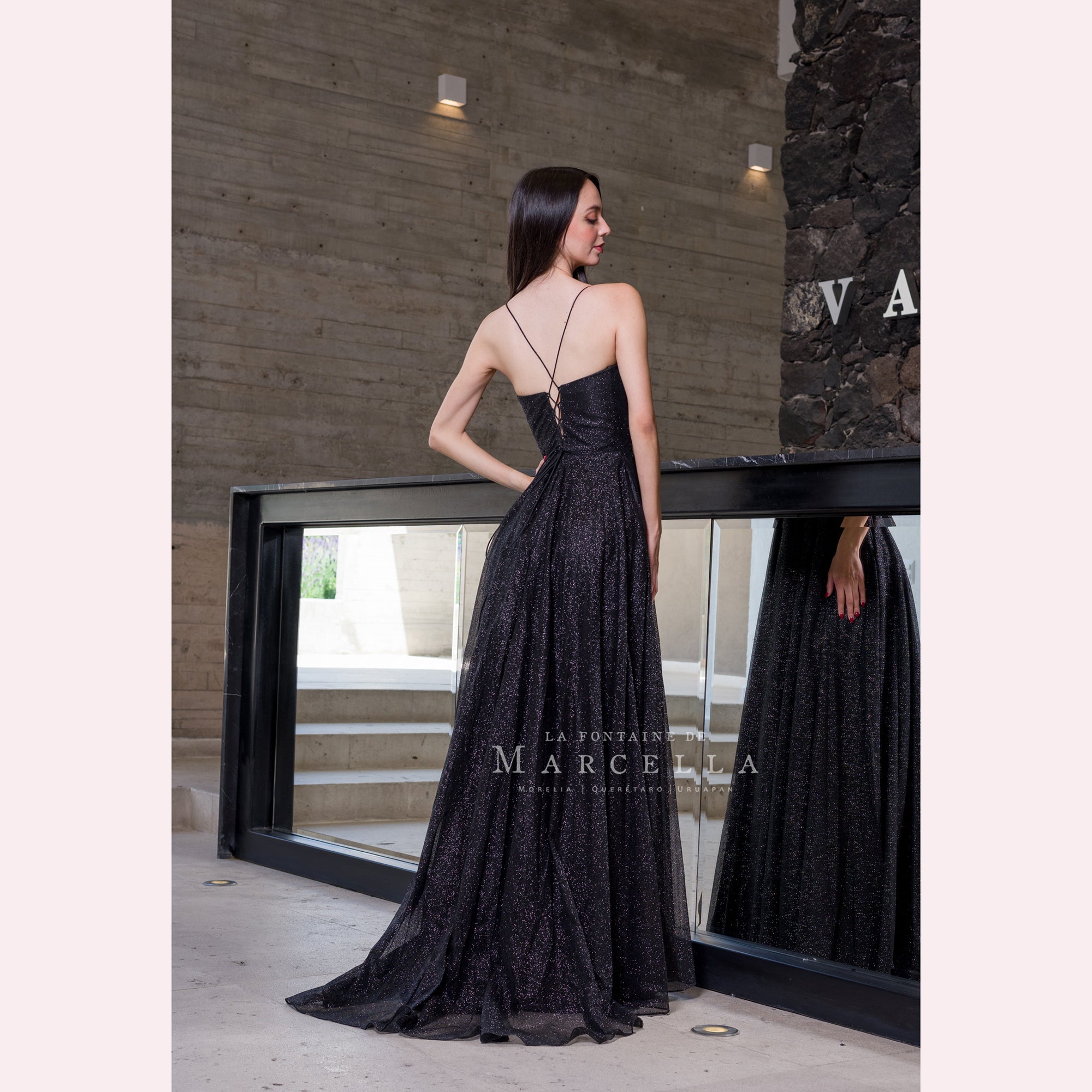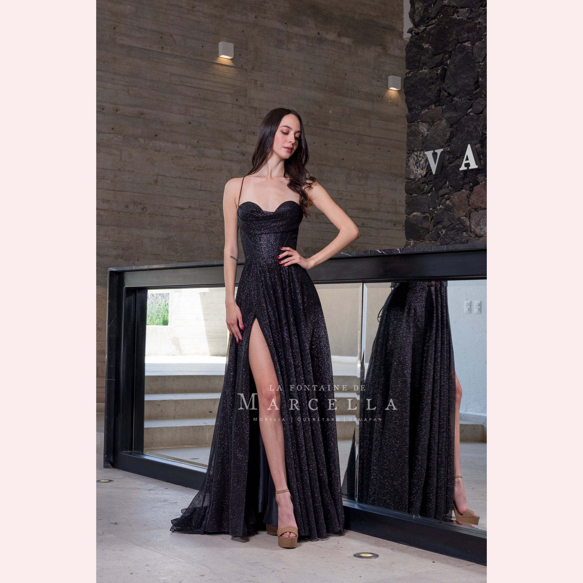 Vestido largo corte A de tela brillante y vista de varilla, recomendado para cuerpos tipo Triangulo Invertido y Rectángulo.Leer más