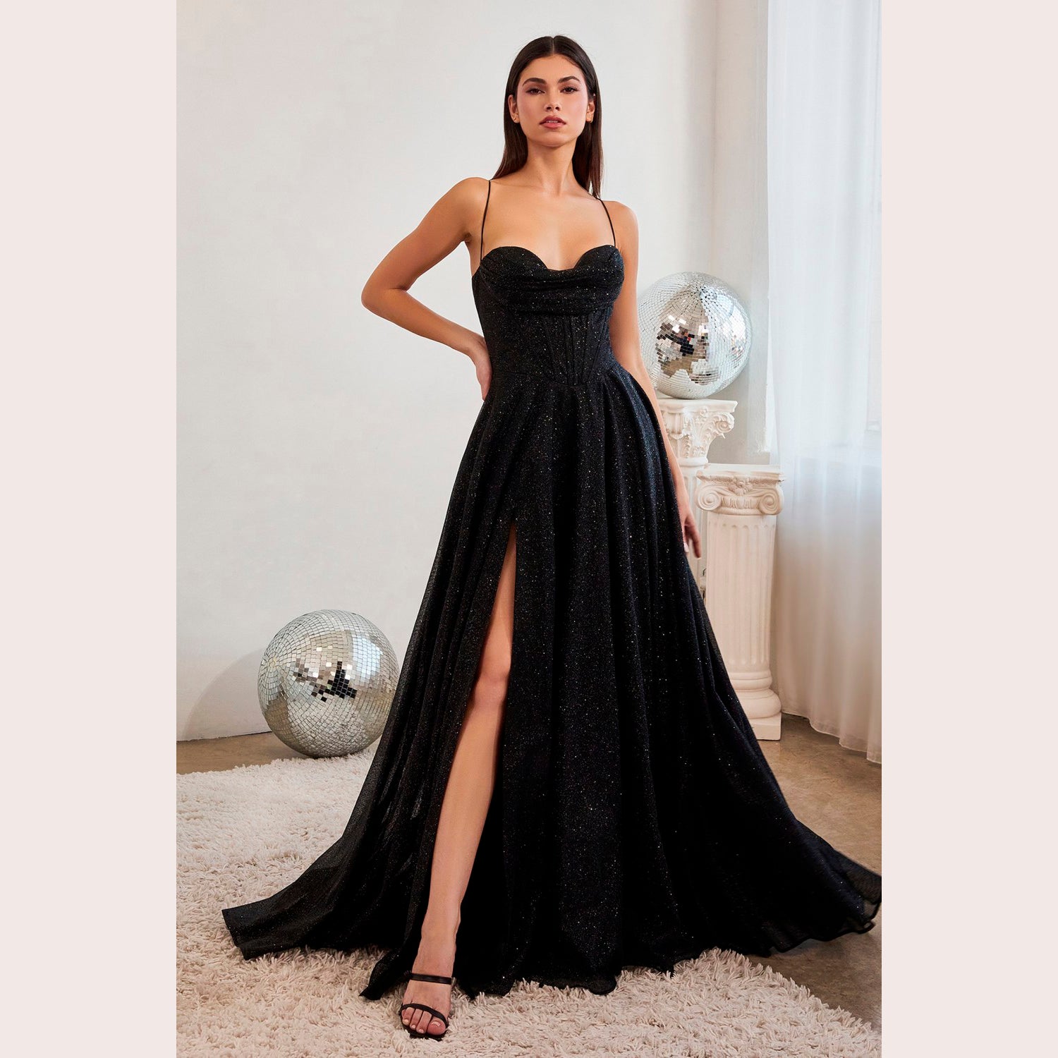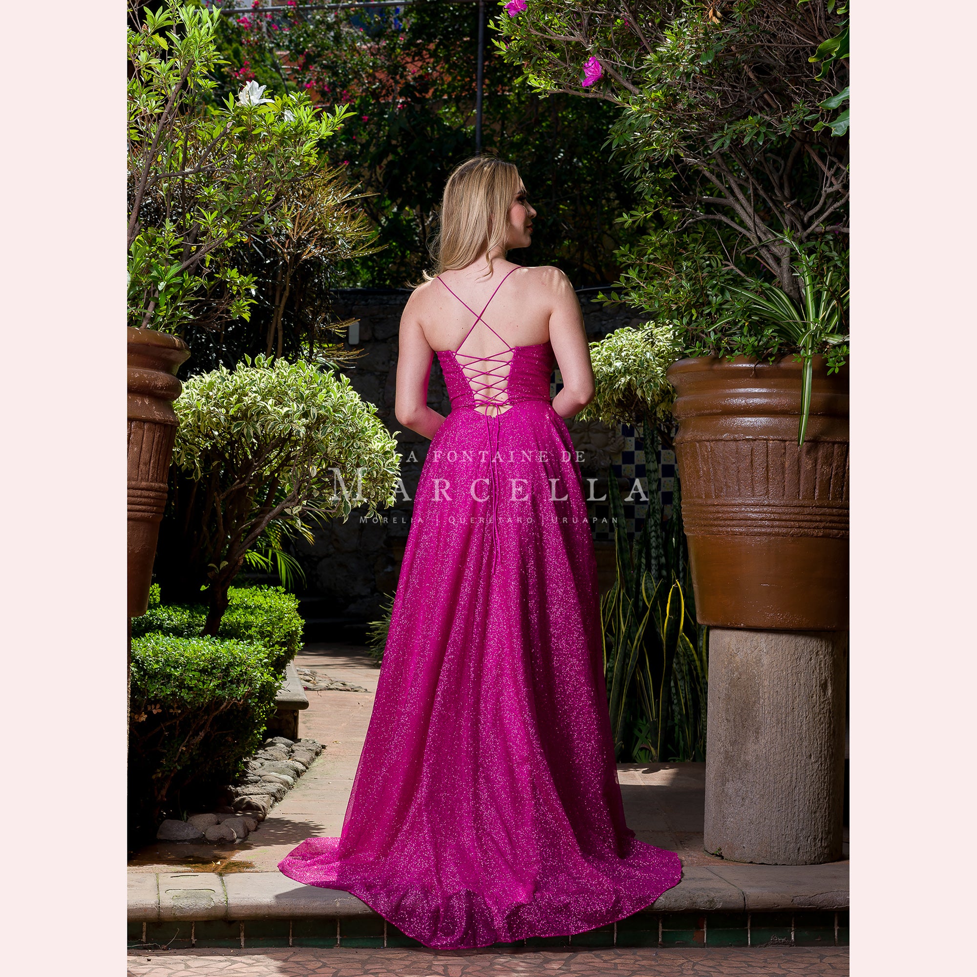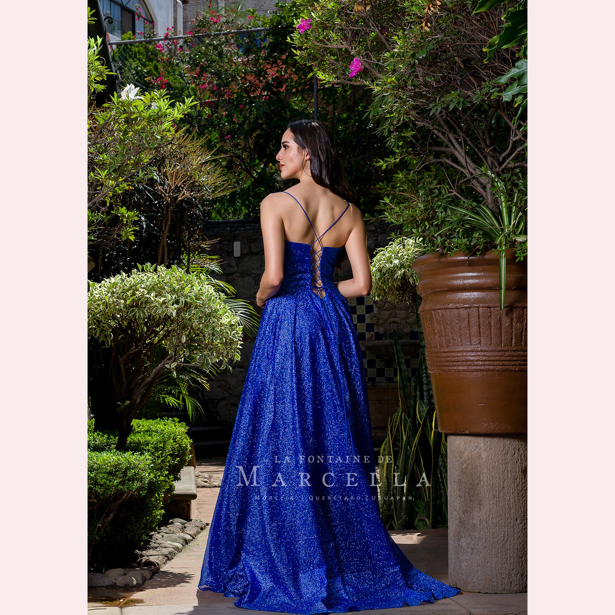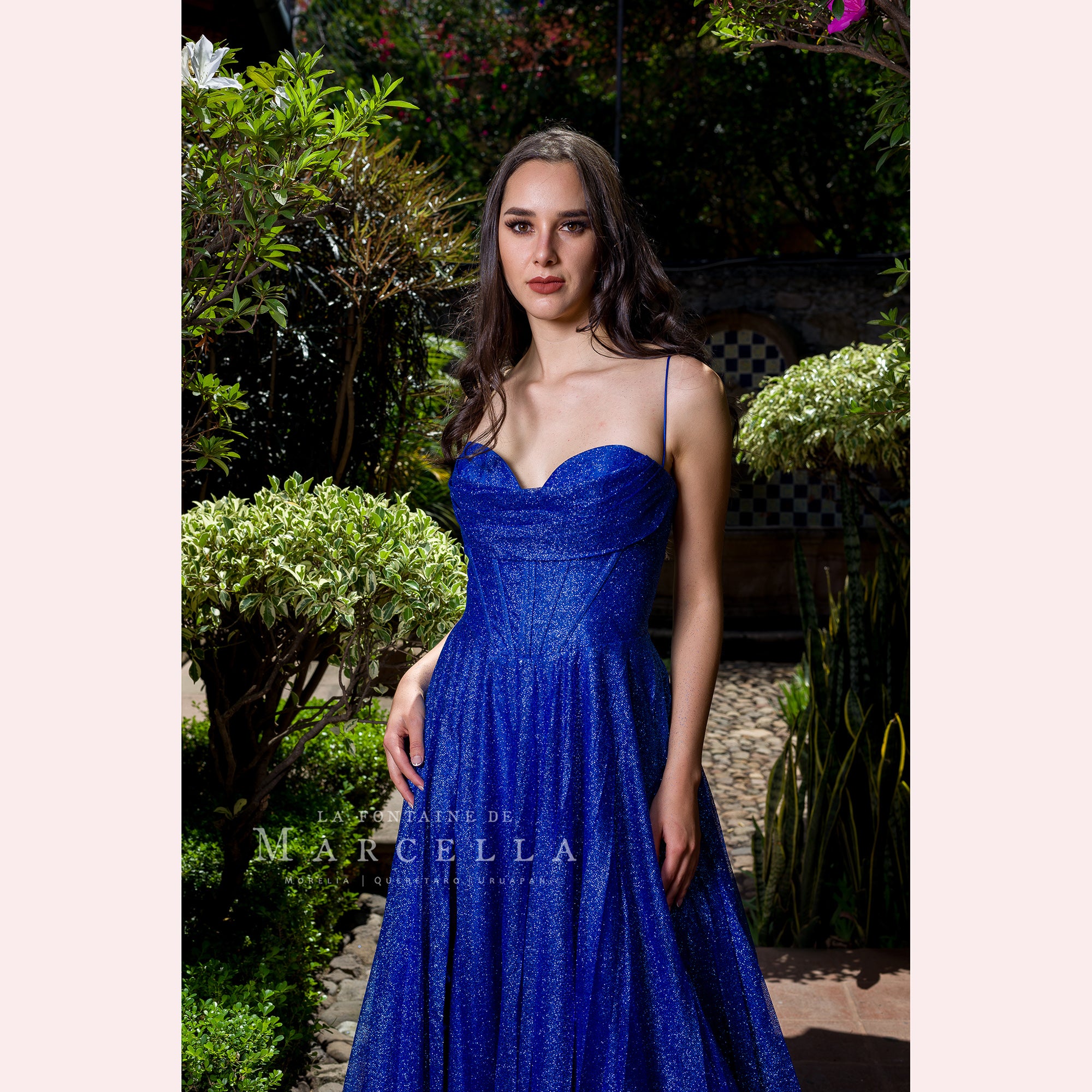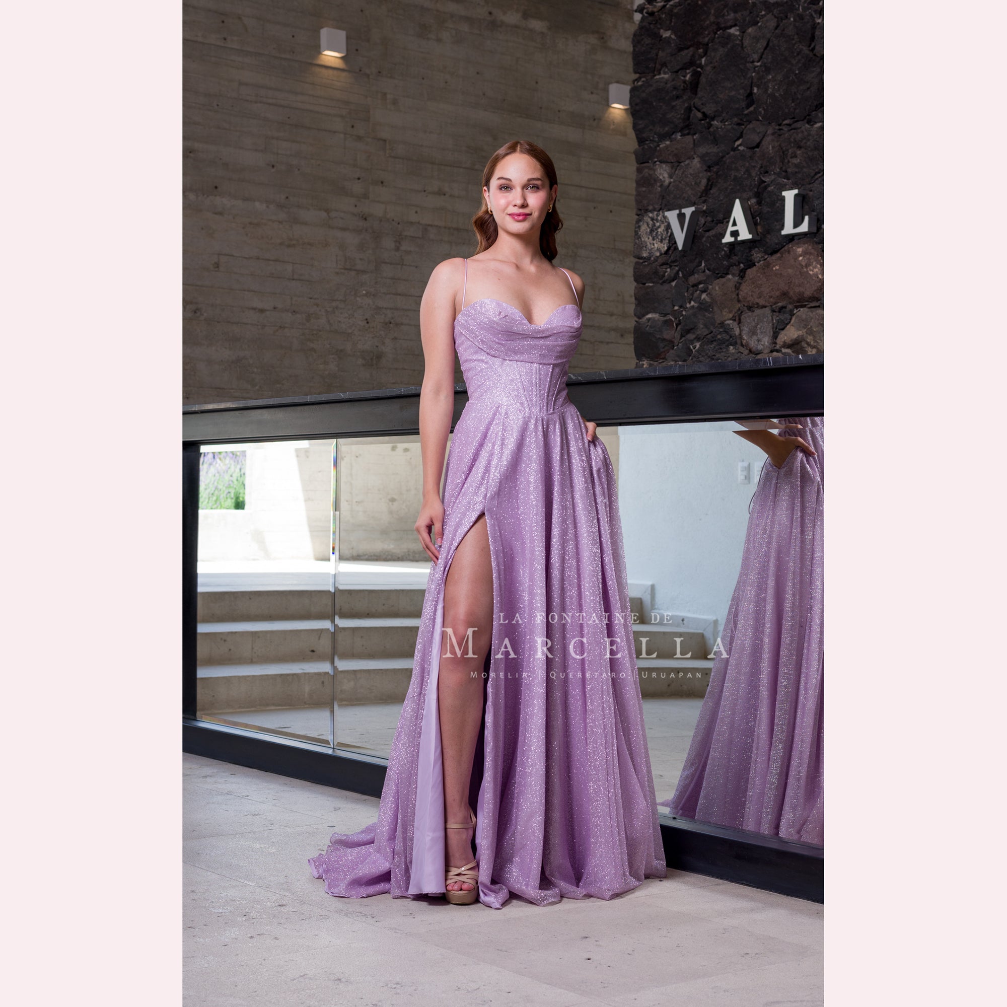 Vestido largo corte A de tela brillante y vista de varilla, recomendado para cuerpos tipo Triangulo Invertido y Rectángulo.Leer más