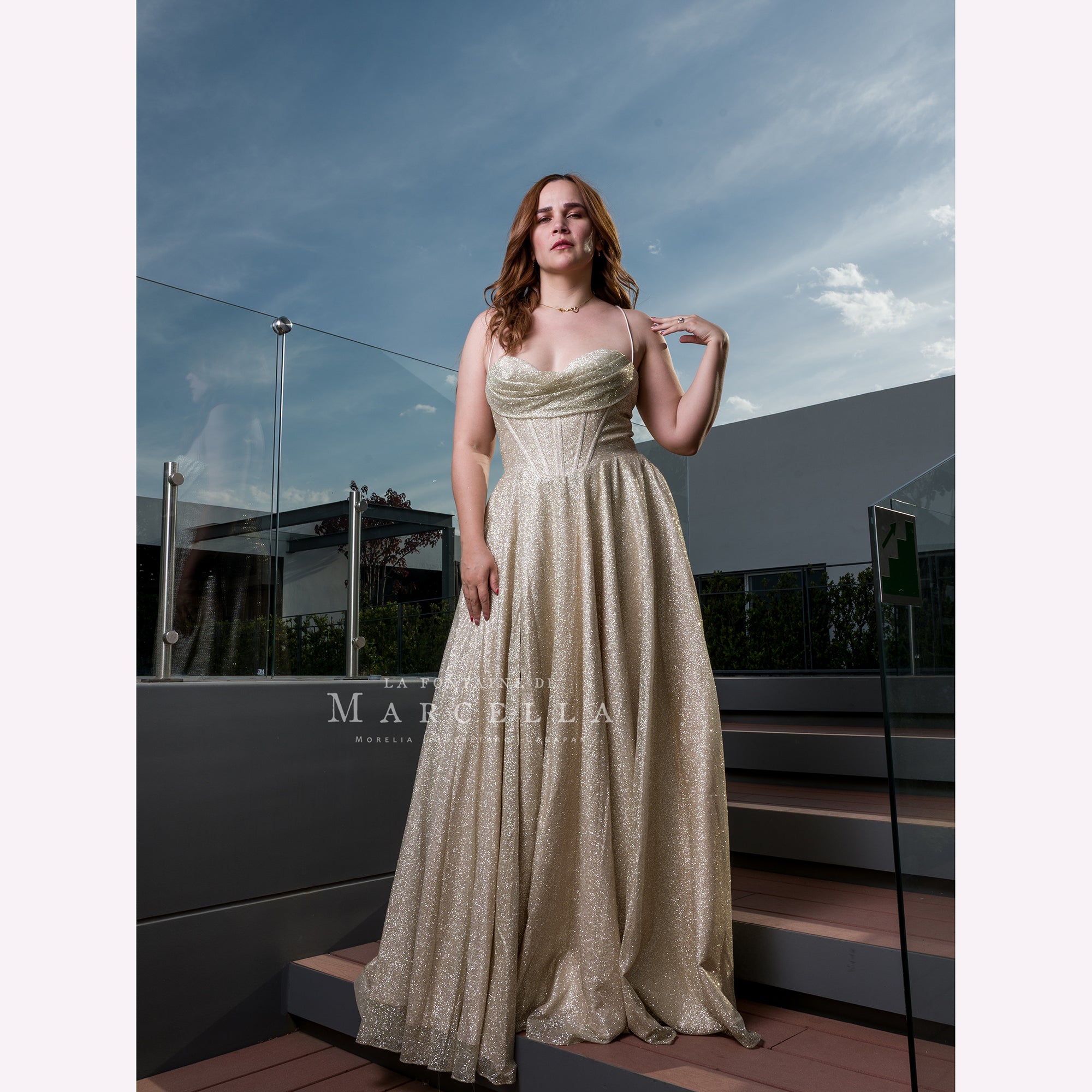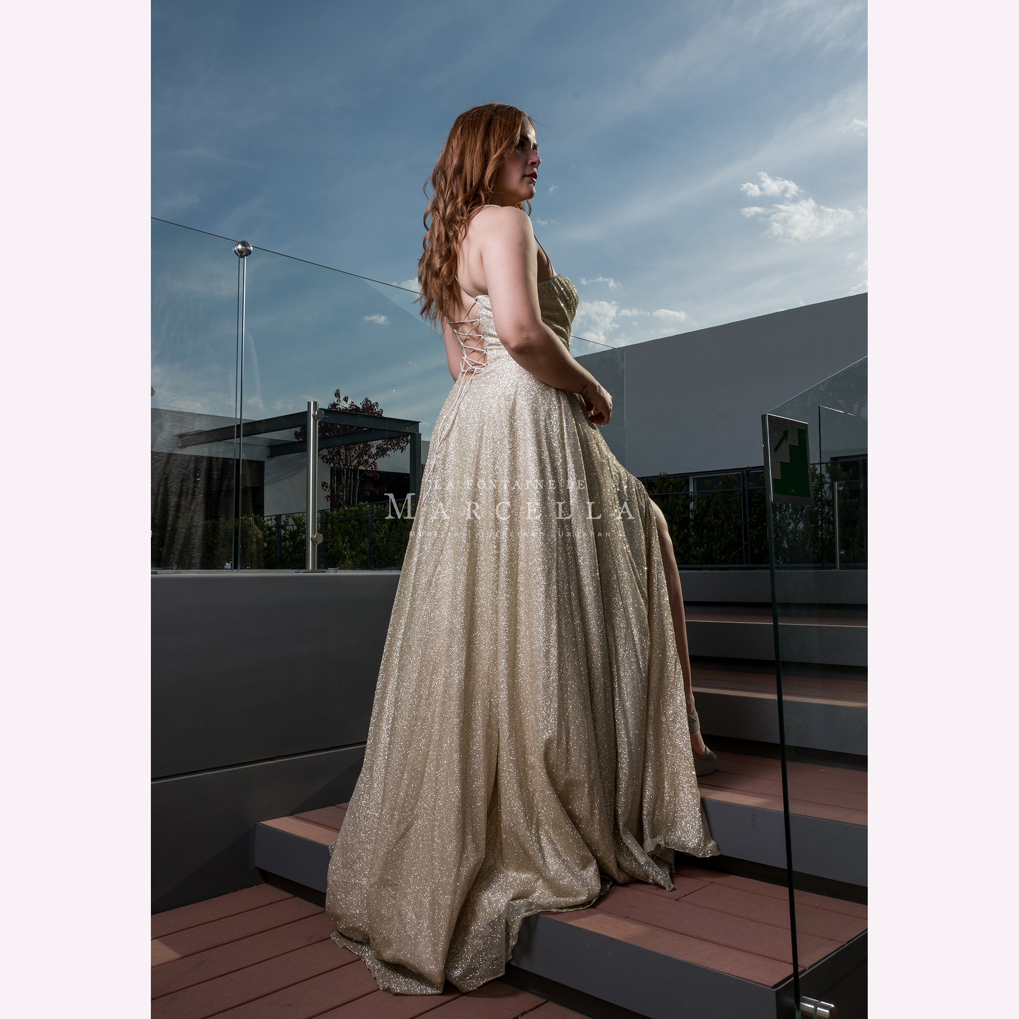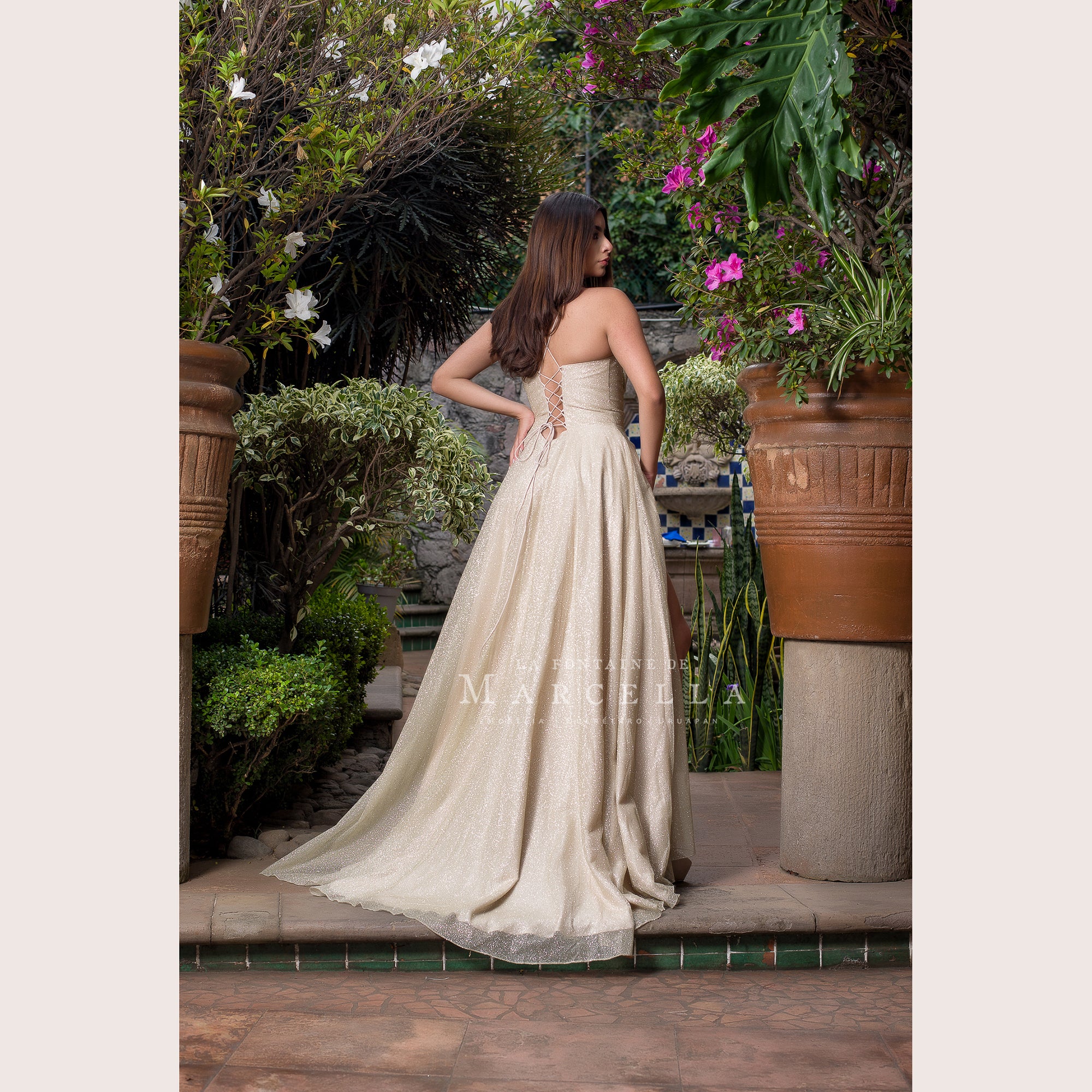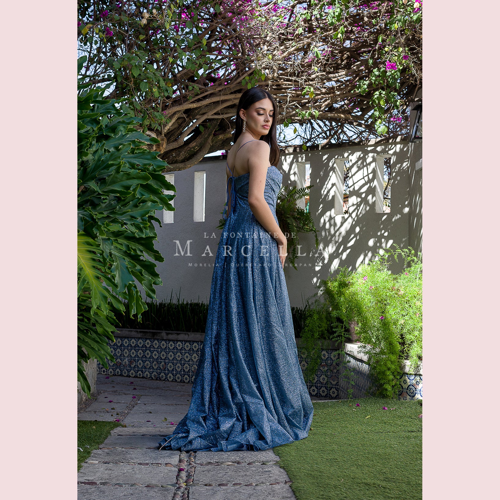 Vestido largo corte A de tela brillante y vista de varilla, recomendado para cuerpos tipo Triangulo Invertido y Rectángulo.