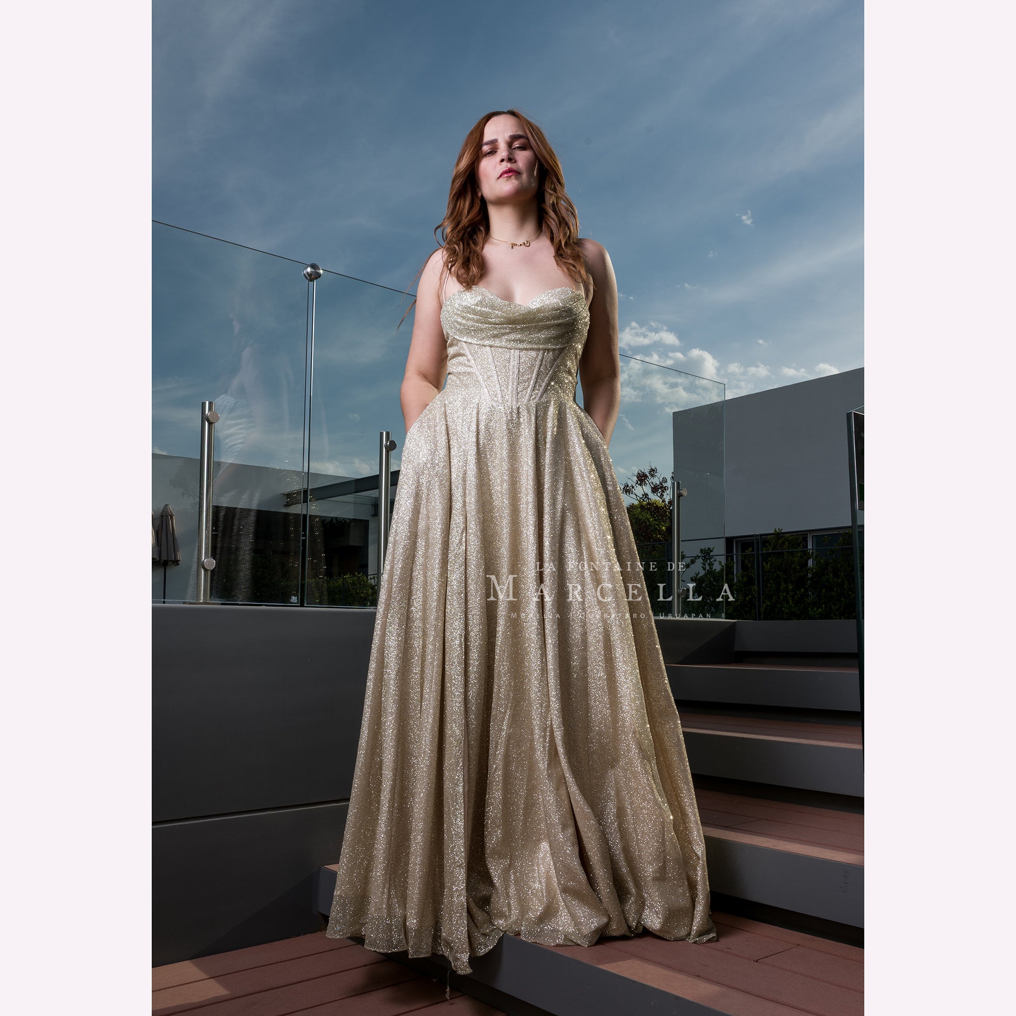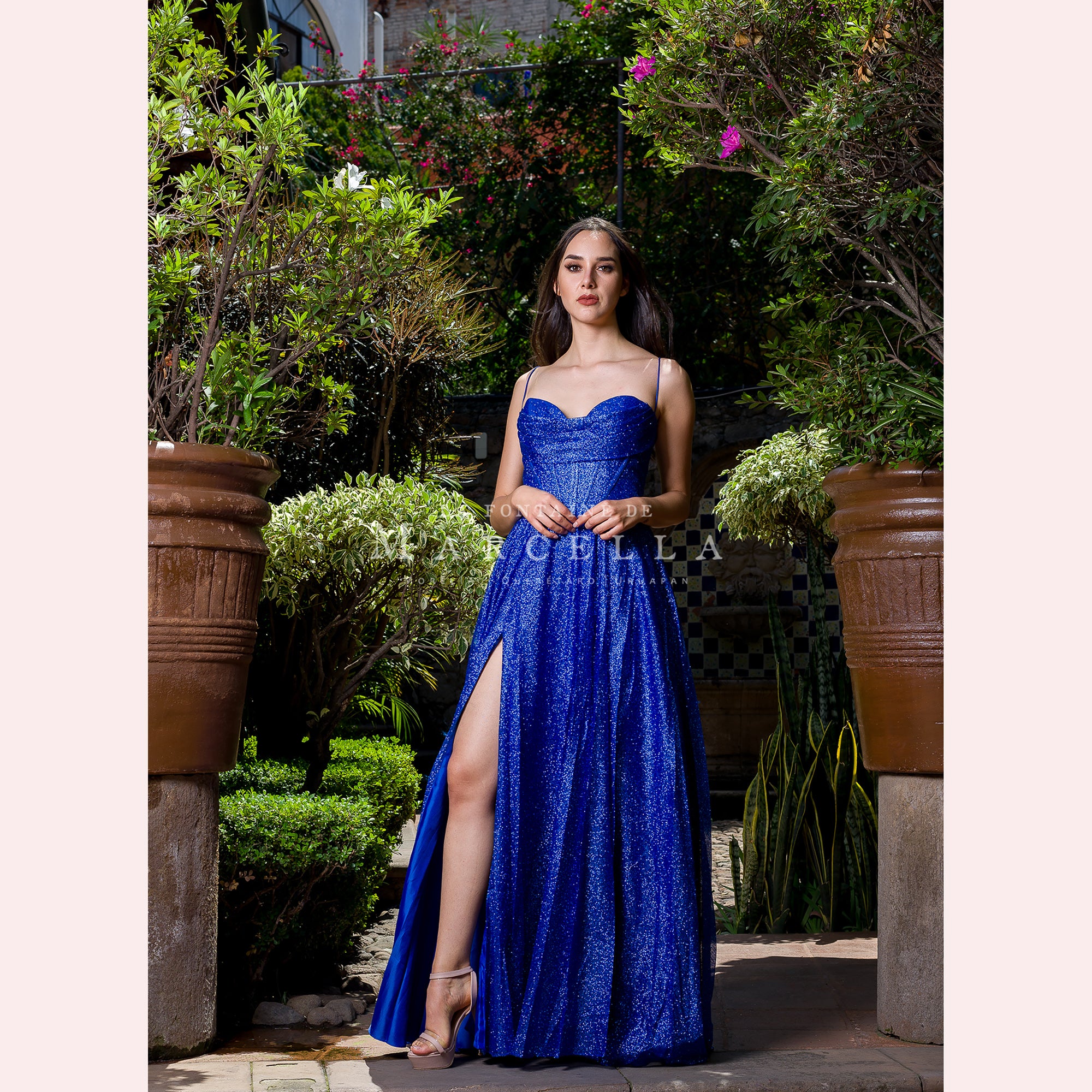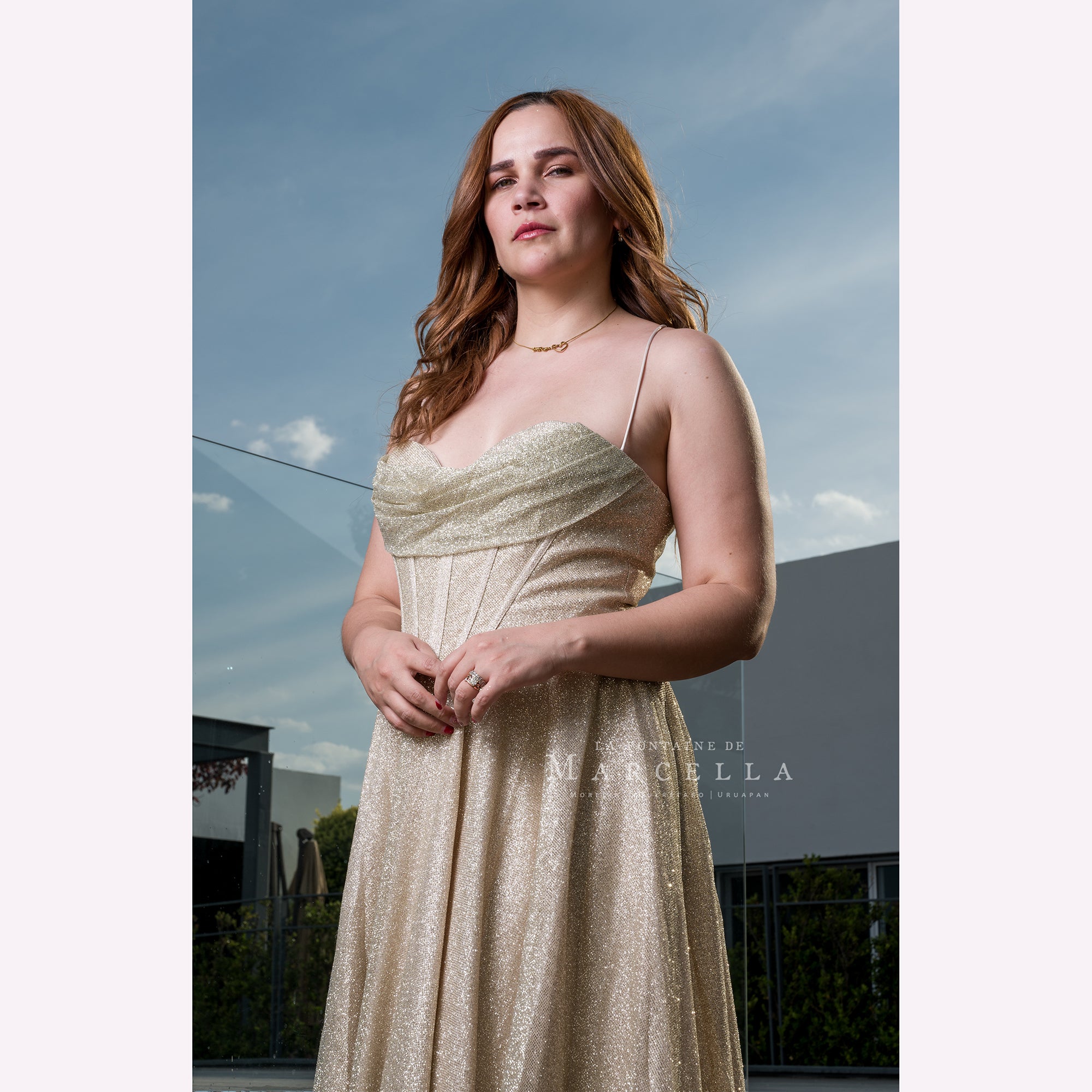 Vestido largo corte A de tela brillante y vista de varilla, recomendado para cuerpos tipo Triangulo Invertido y Rectángulo.