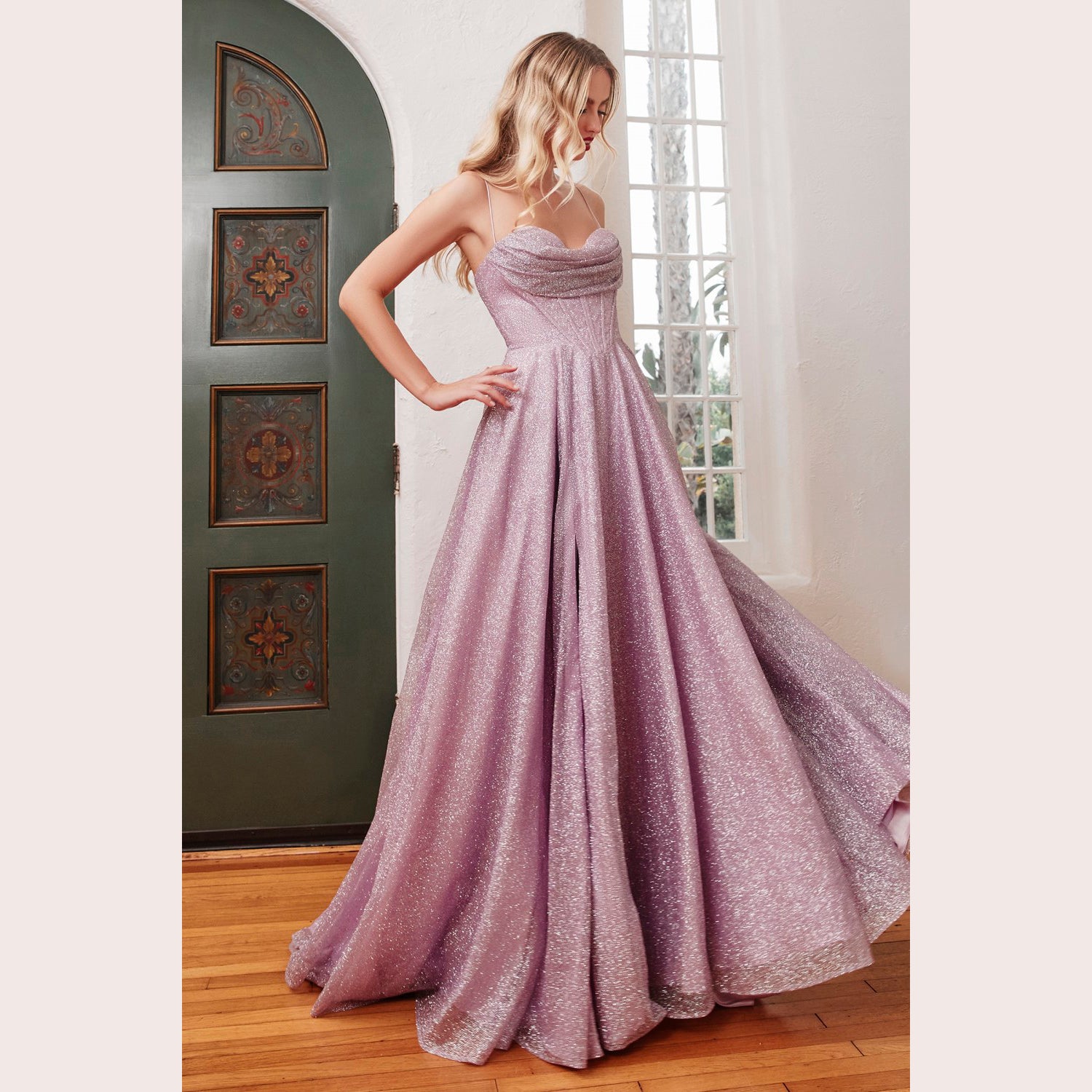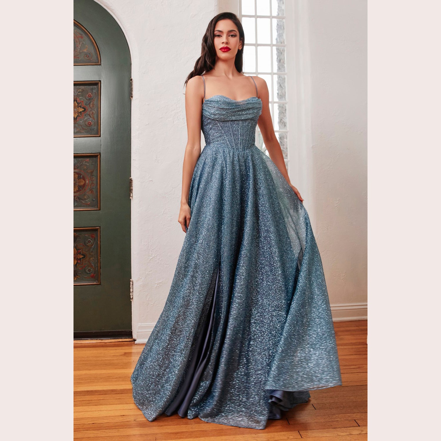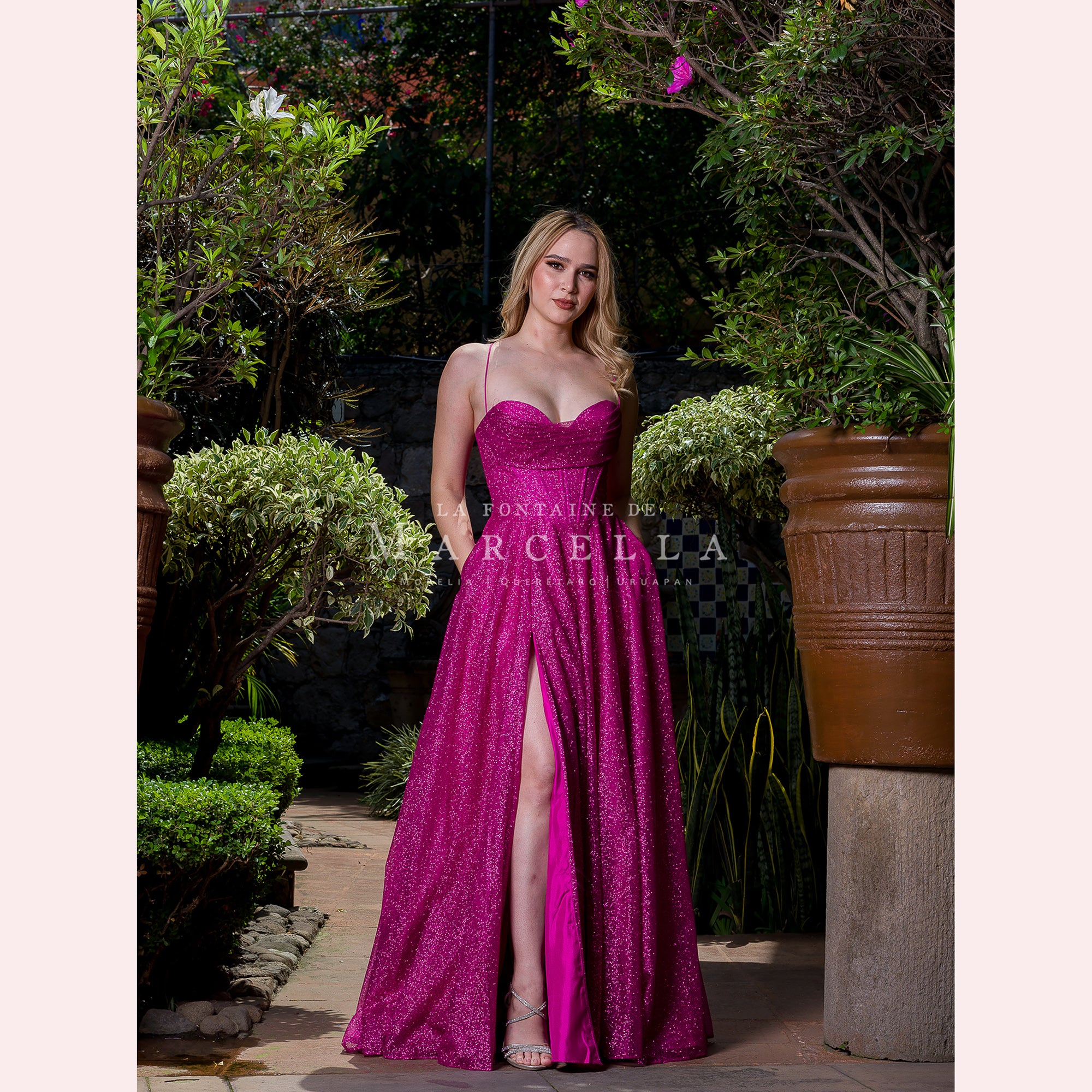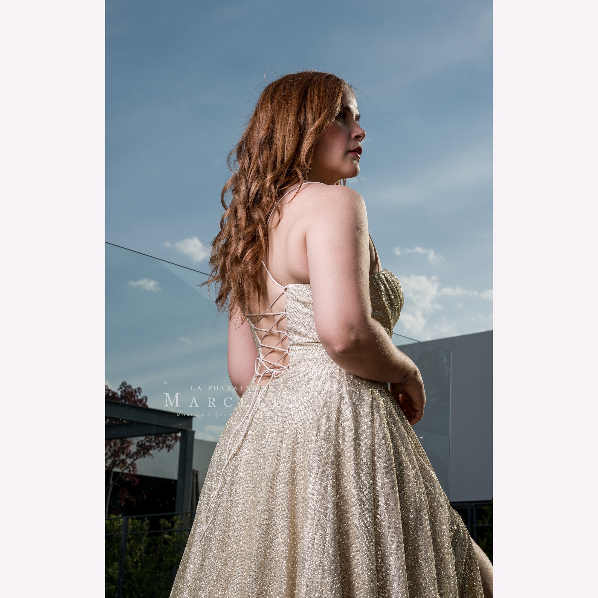 Vestido largo corte A de tela brillante y vista de varilla, recomendado para cuerpos tipo Triangulo Invertido y Rectángulo.