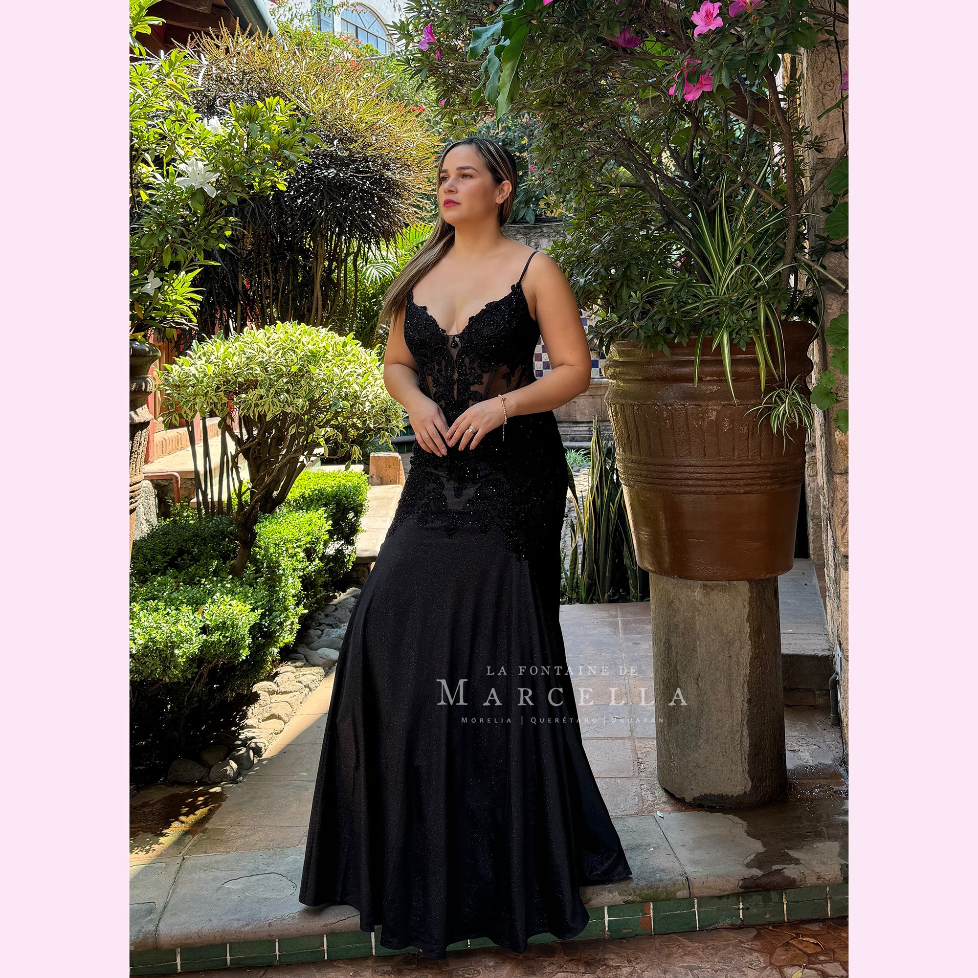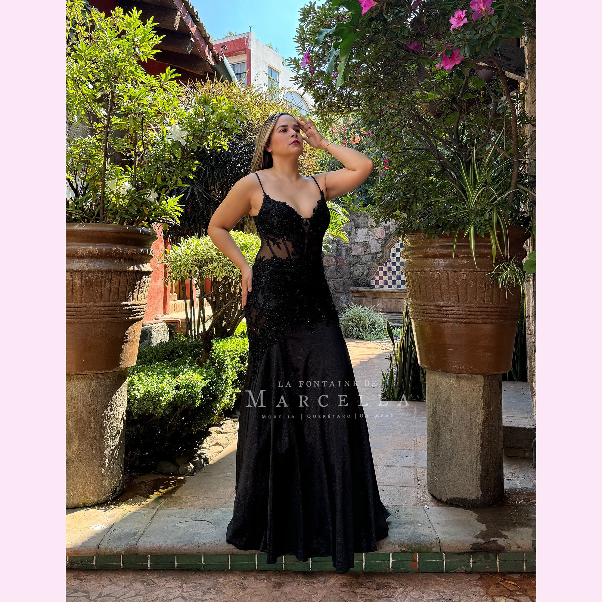 Vestido largo entallado de la cadera con corte en A en las piernas, cuenta con transparencia en la parte superior, tirante delgado y aplicación, es recomendado para cuerpos tipo Rectángulo y Triangulo Invertido.