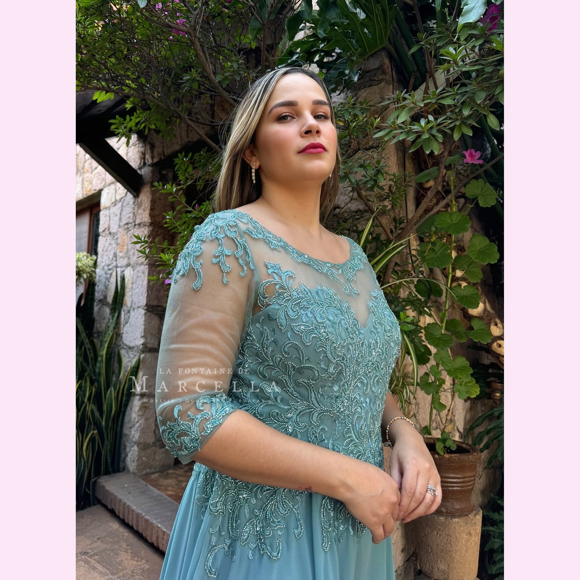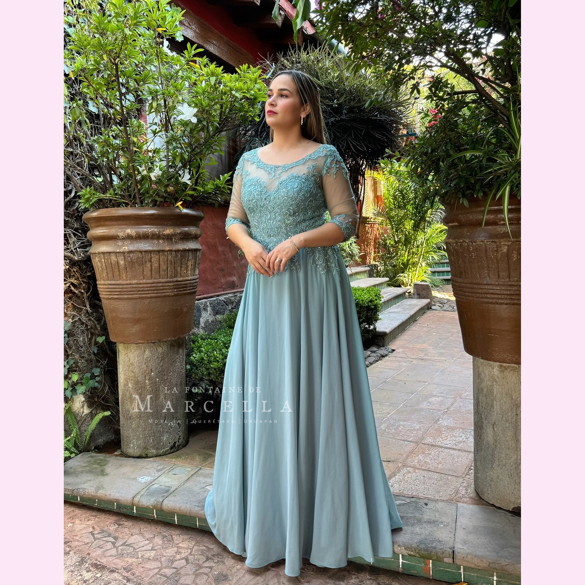 Vestido corte en A de manga larga, transparencia y aplicación en la parte superior, s recomendado para cuerpos tipo Manzana y Rectángulo.
