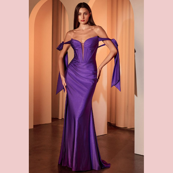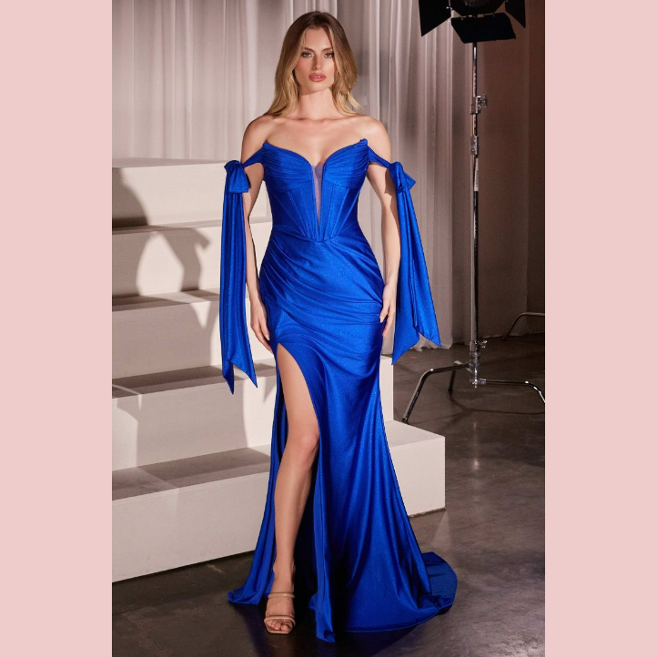 Vestido corte sirena con escote pronunciado en V, corse y manga de liston, es recomendado para cuerpos tipo Pera y Reloj de Arena.