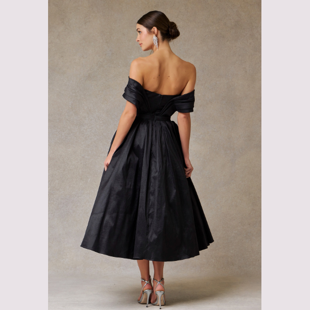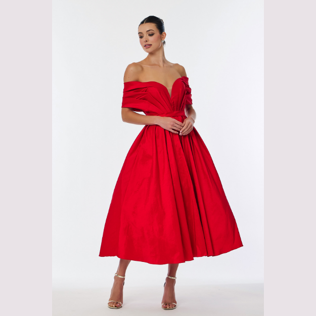 Vestido Midi corte en A con escote en V y mangas de Ojal, es recomendado para cuerpos tipo Pera y Rectángulo.