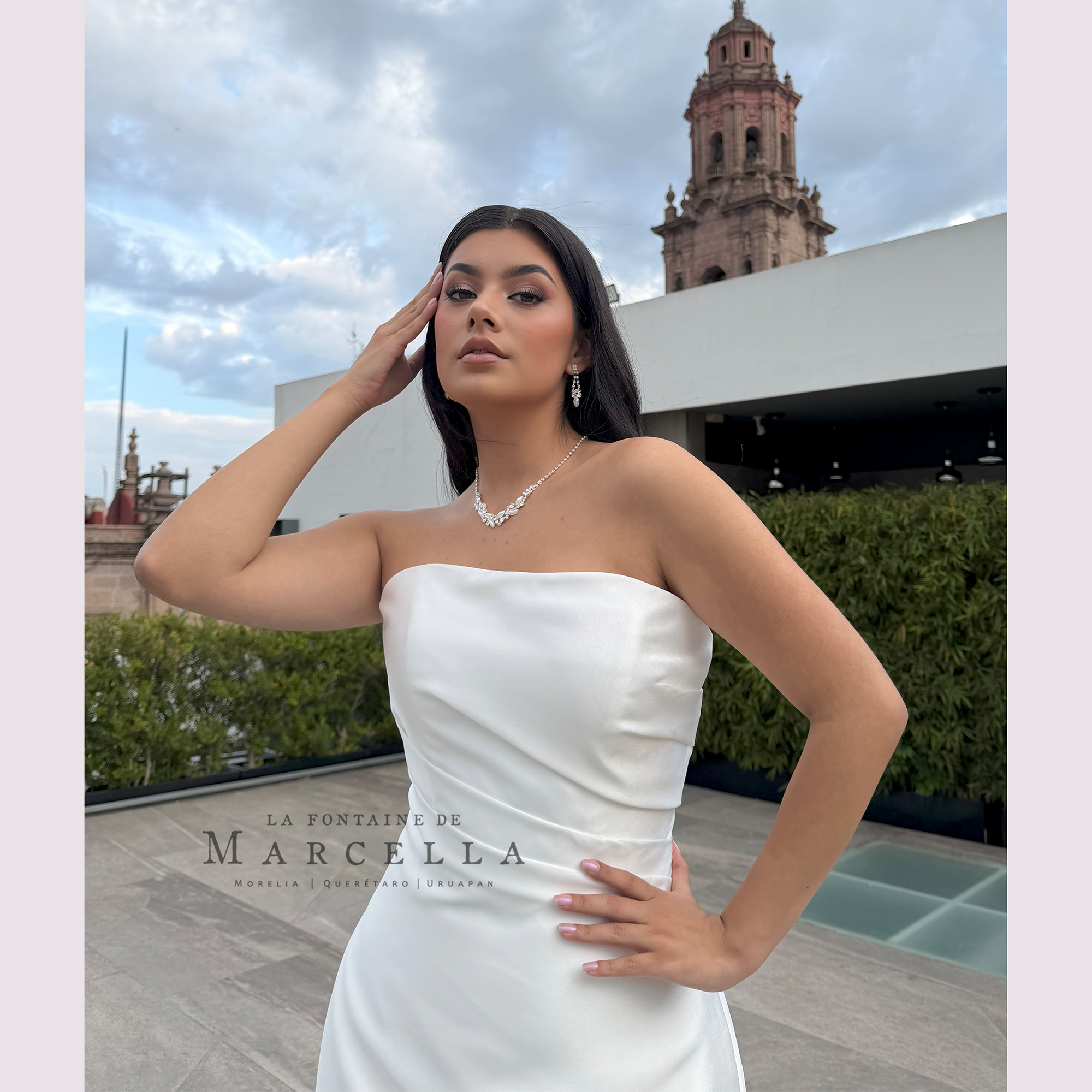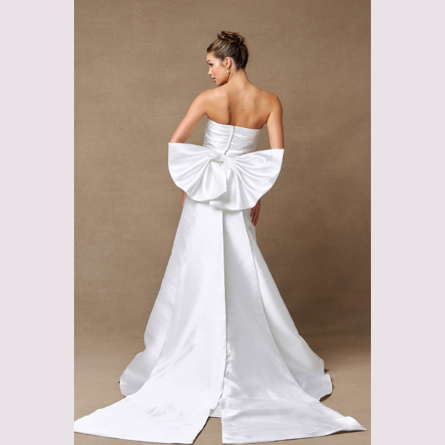 Elegante vestido de Novia corte A con moño en la parte trasera, es recomendado para cuerpos tipo Rectángulo y Triangulo Invertido.