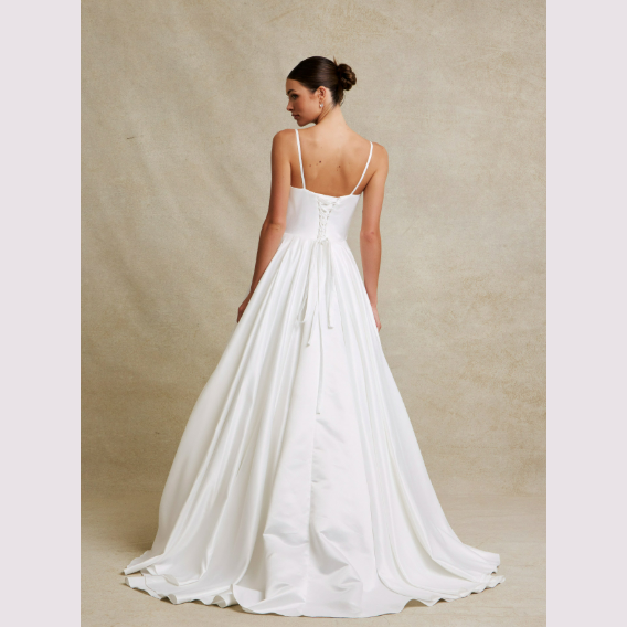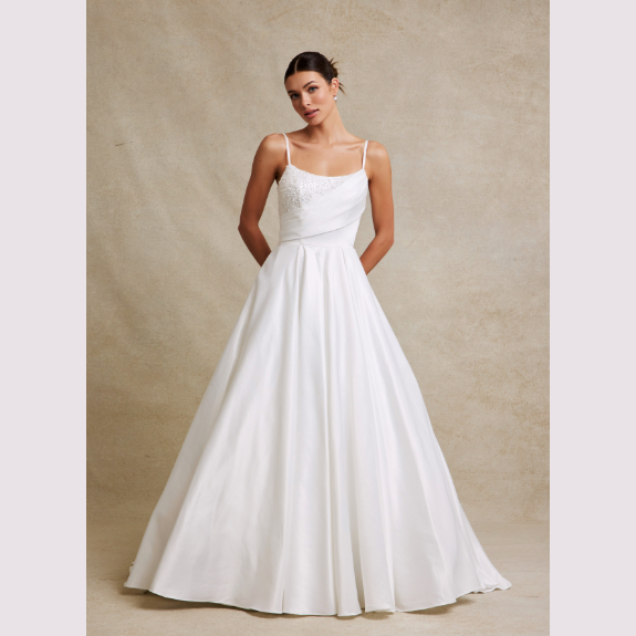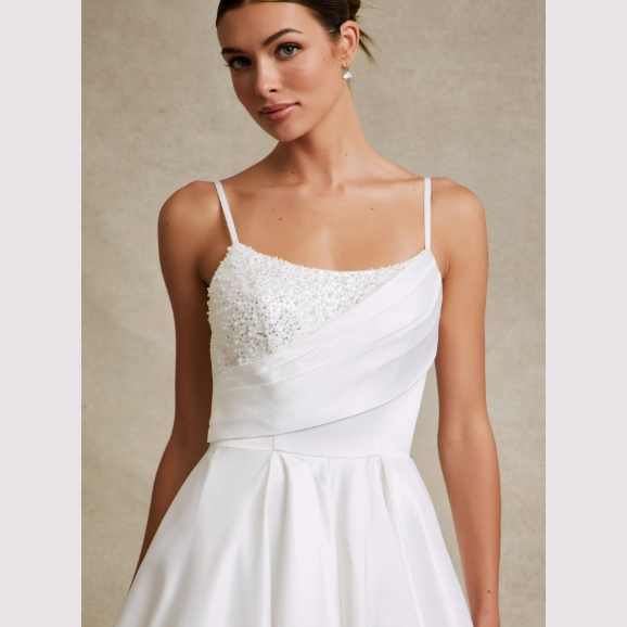 Vestido corte en A con escote recto y tirante delgado, es recomendado para cuerpos tipo Triangulo Invertido y Rectángulo.
