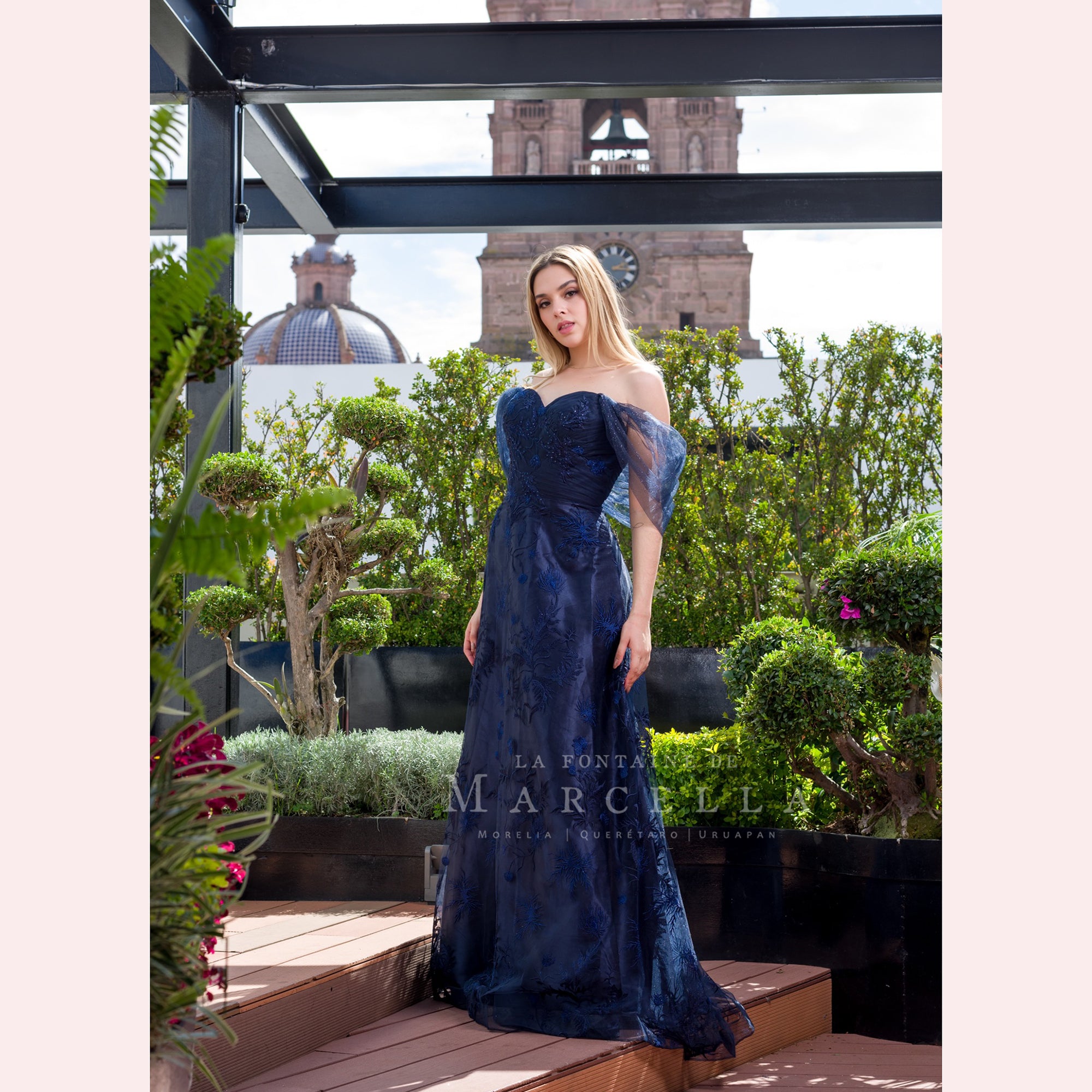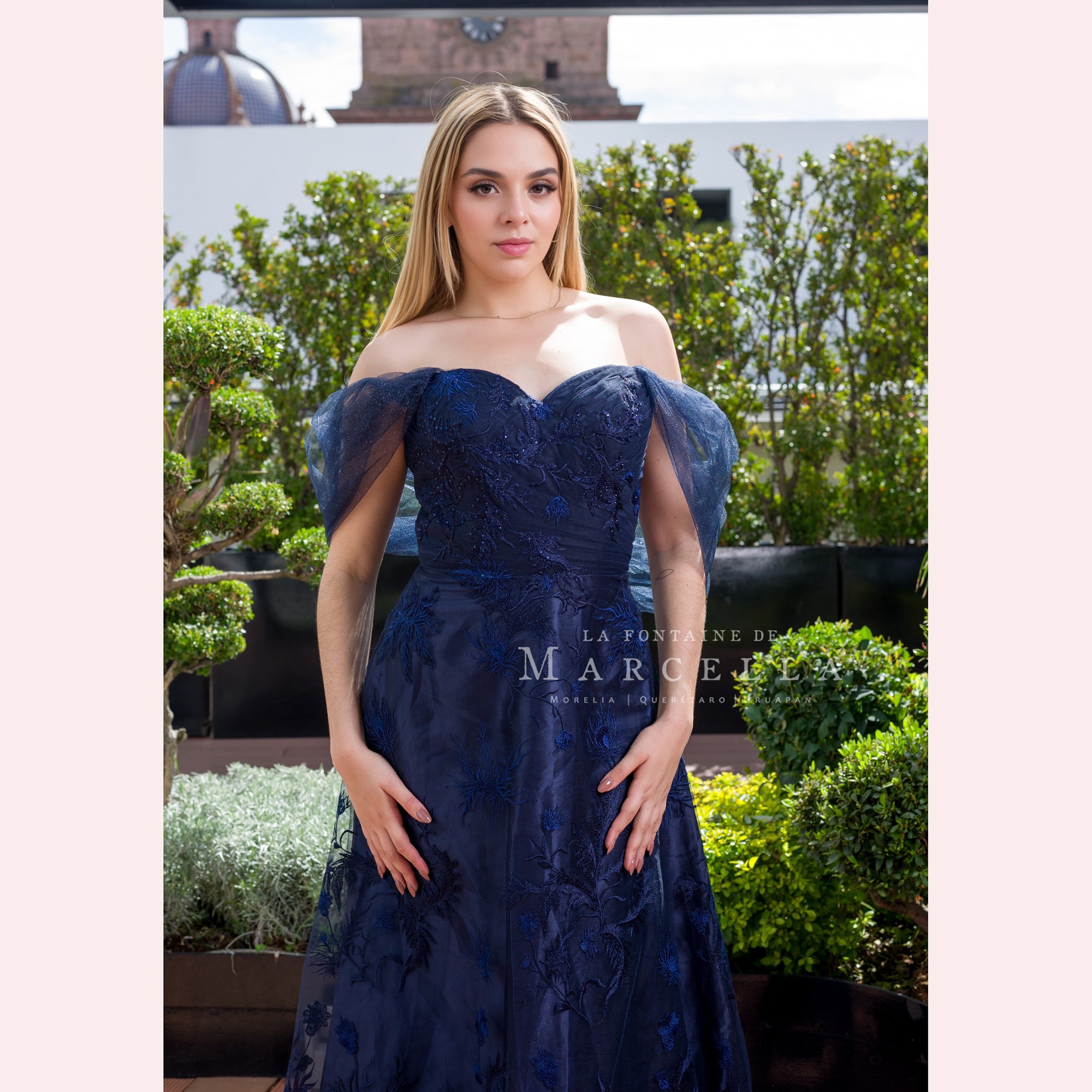 Vestido largo corte en A con manga de ojal hecha de Tul, es recomendado para cuerpos tipo Pera y Reloj de Arena.Leer más