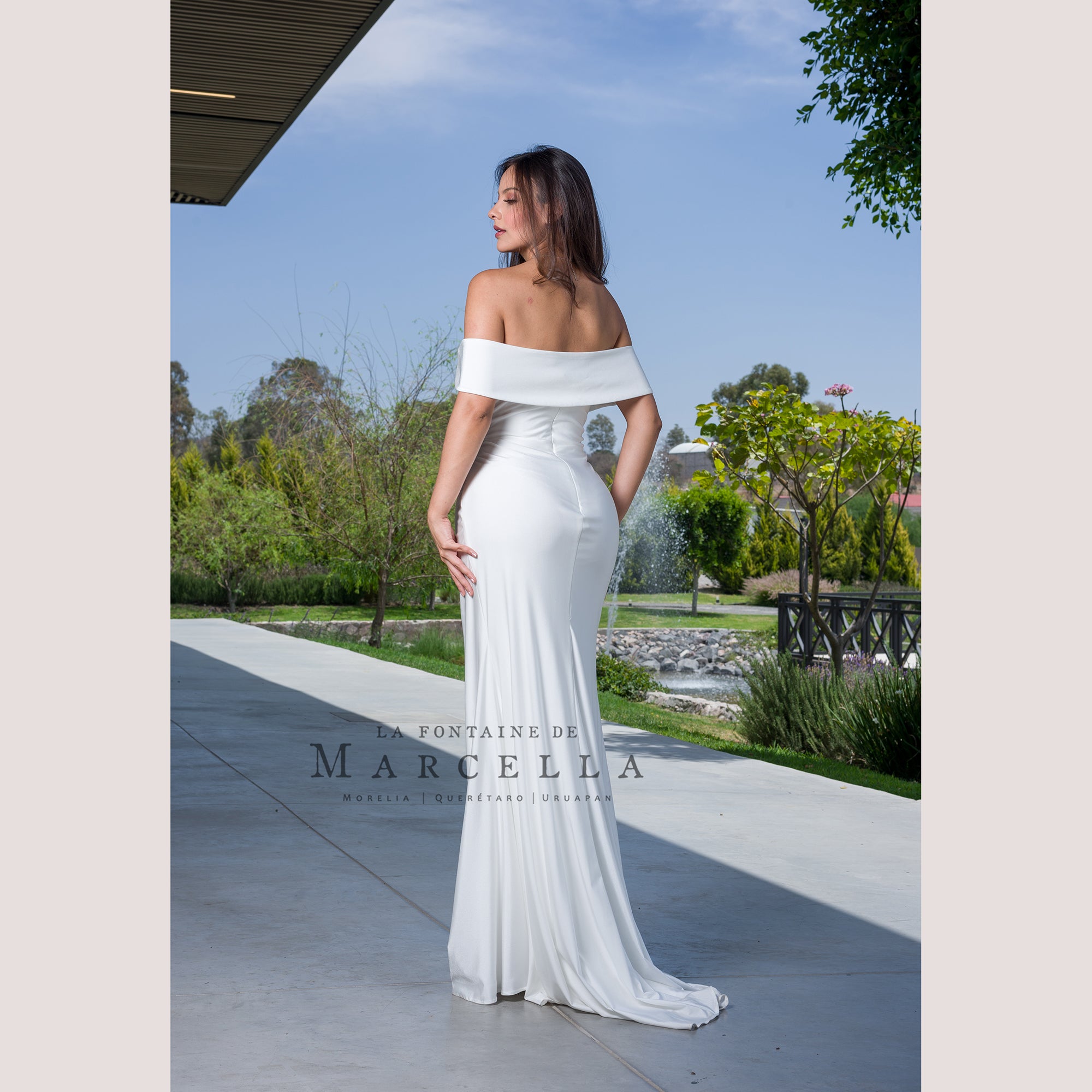 Vestido corte sirena con manga de ojal y pliegues en el torso es recomendado para cuerpos tipo Reloj de Arena y Pera.Leer más